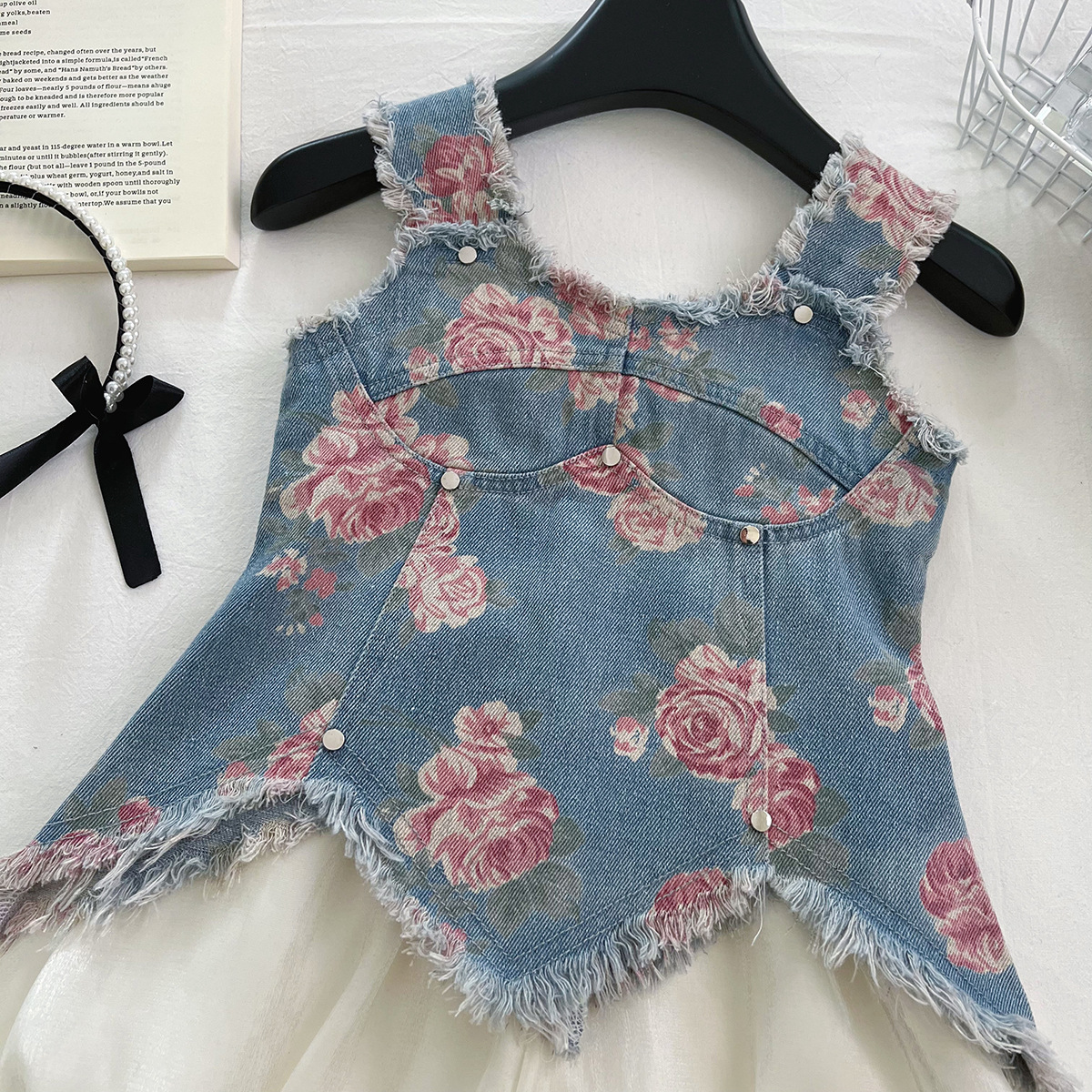 소녀 데님 스트랩 세트 여름 2025 새로운 소녀의 세련된 인쇄 탑 2 피스 트렌디 바지스토어 가기