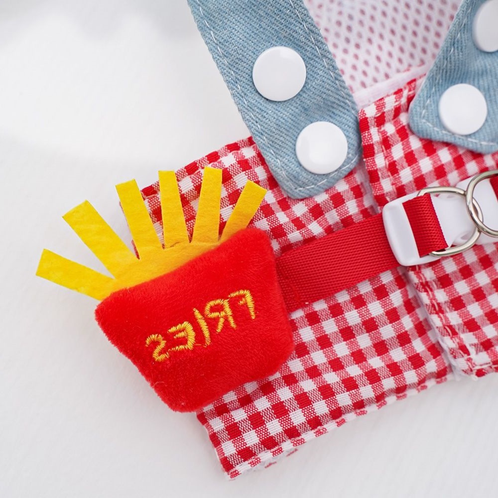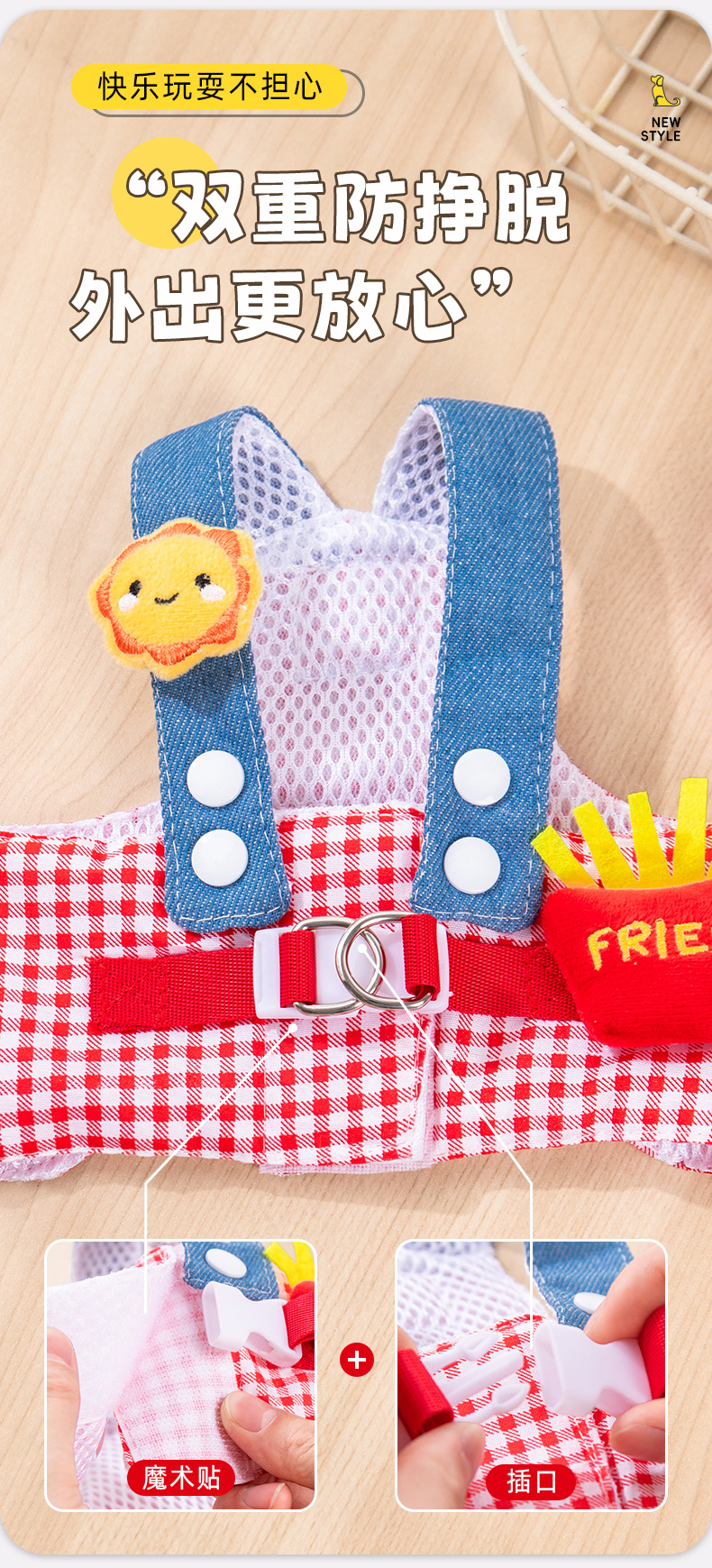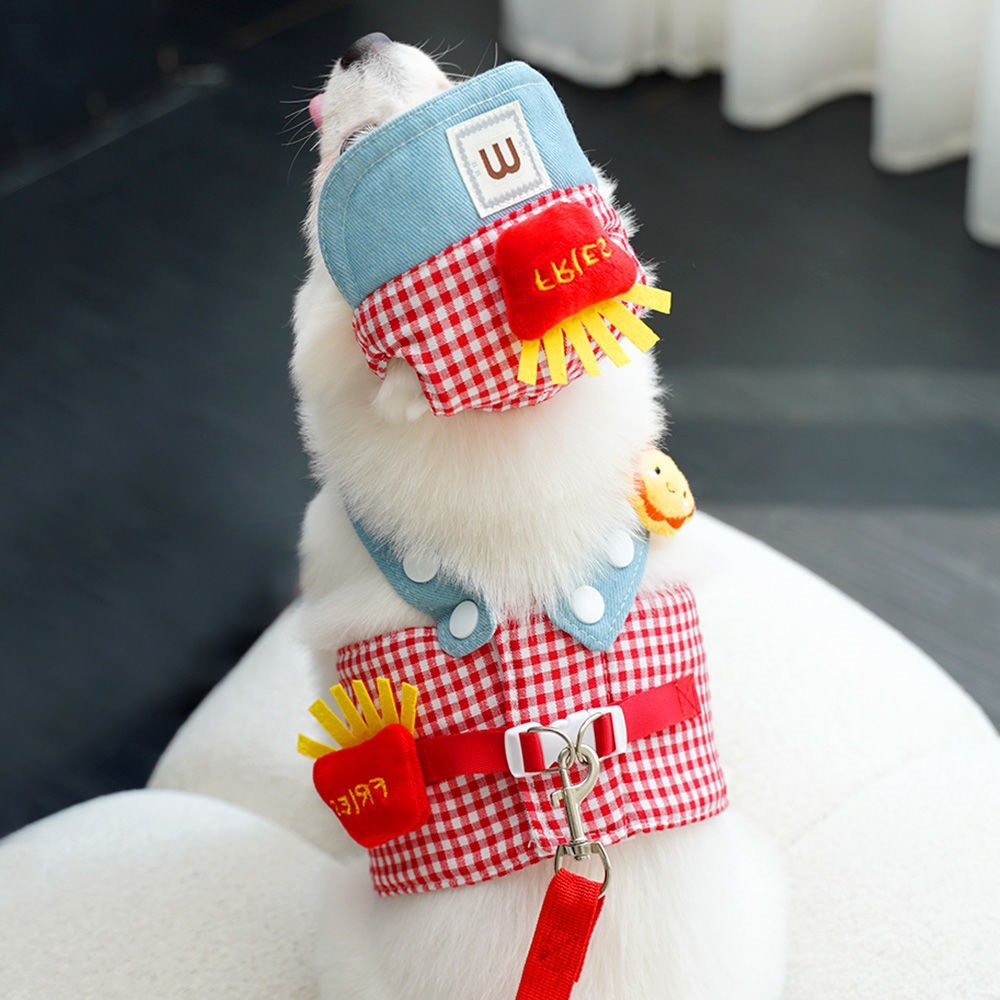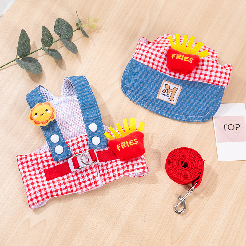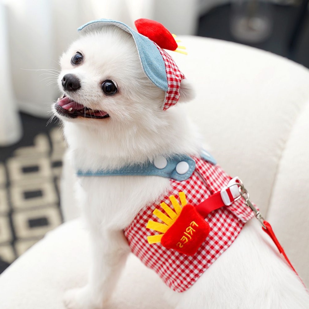 • 감자튀김 레드 체크무늬 하네스 3종세트 [모자+하네스+리쉬]
