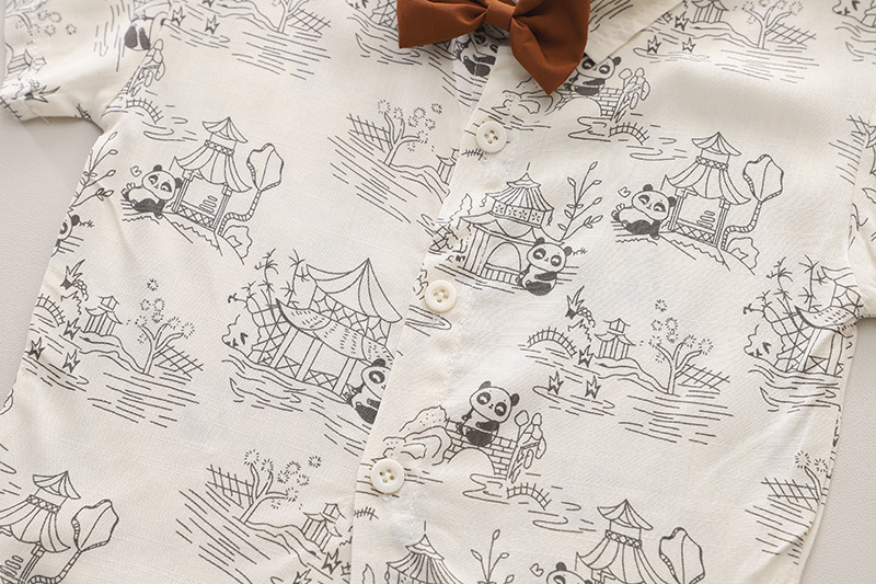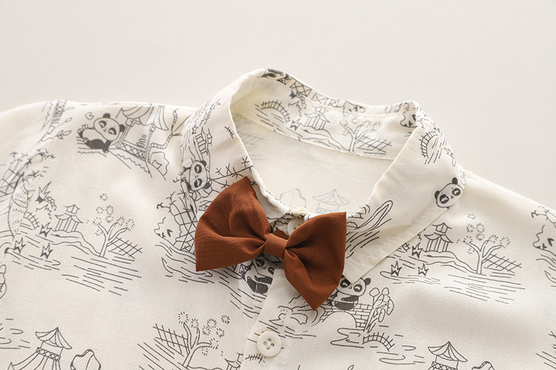 2025 새로운 소년 나비 넥타이 셔츠 세트 여름 옷 아기 옷 바지 소년 아기 만화 어린이 의류스토어 가기