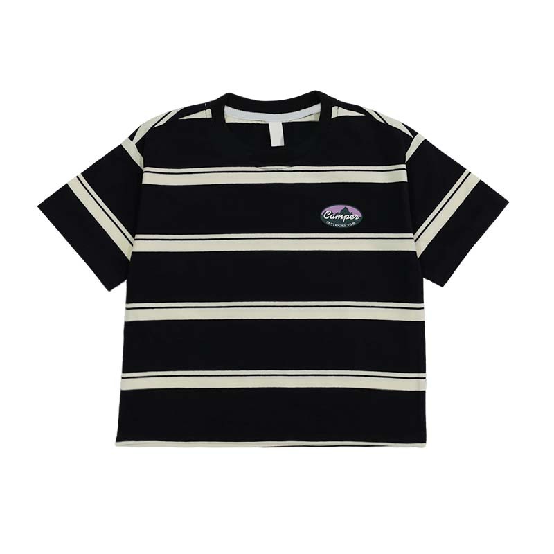 소녀 짧은 소매 티셔츠 2025 여름 새로운 어린이 레트로 스트라이프 탑 소녀 큰 아이 느슨한 반 소매 티셔츠 도매스토어 가기