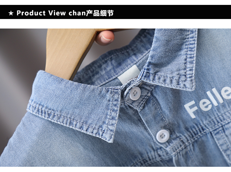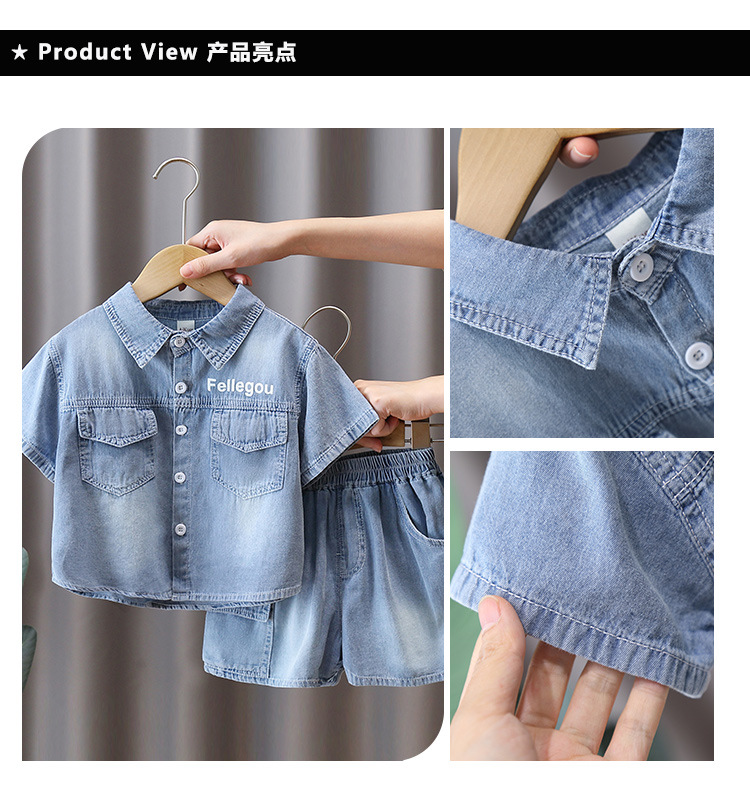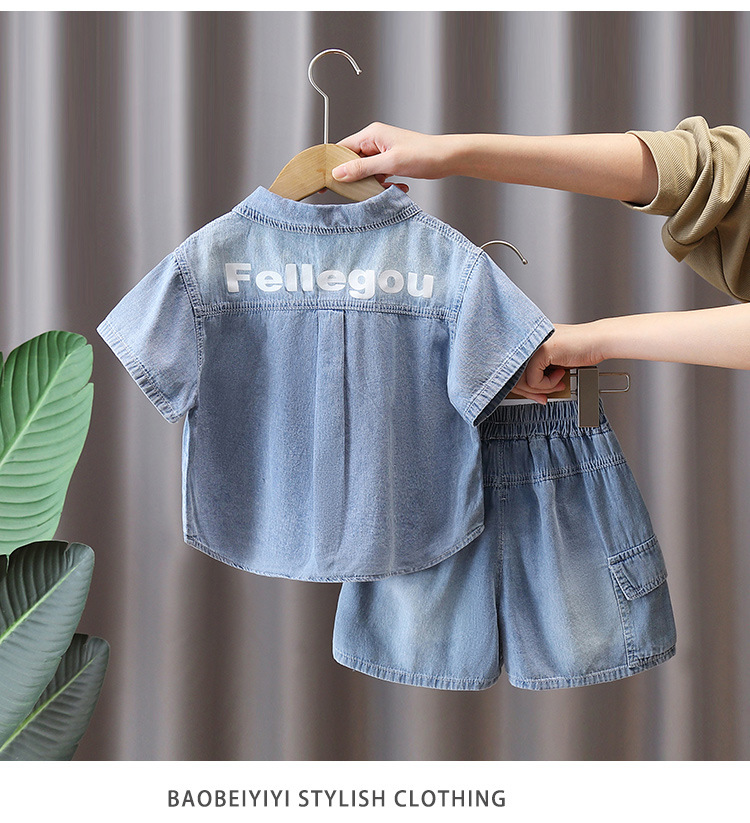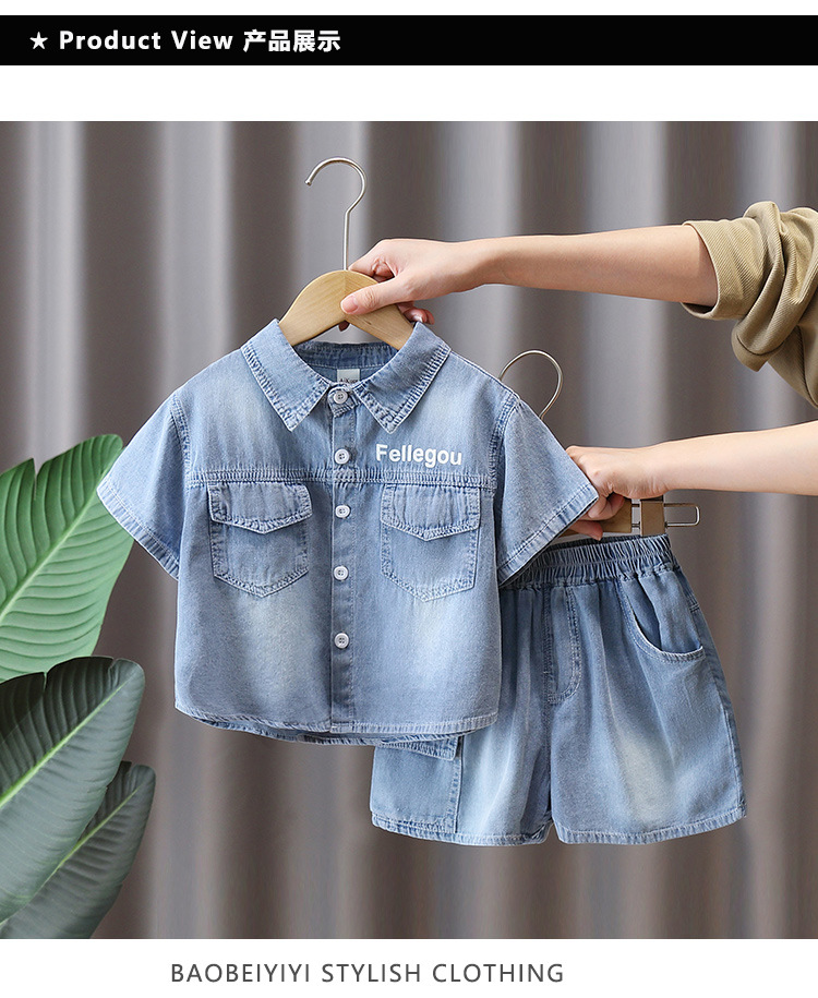 7215 소년 여름 세트 반팔 빛 데님 셔츠 투피스 잘 생긴 어린이 여름 얇은 옷스토어 가기