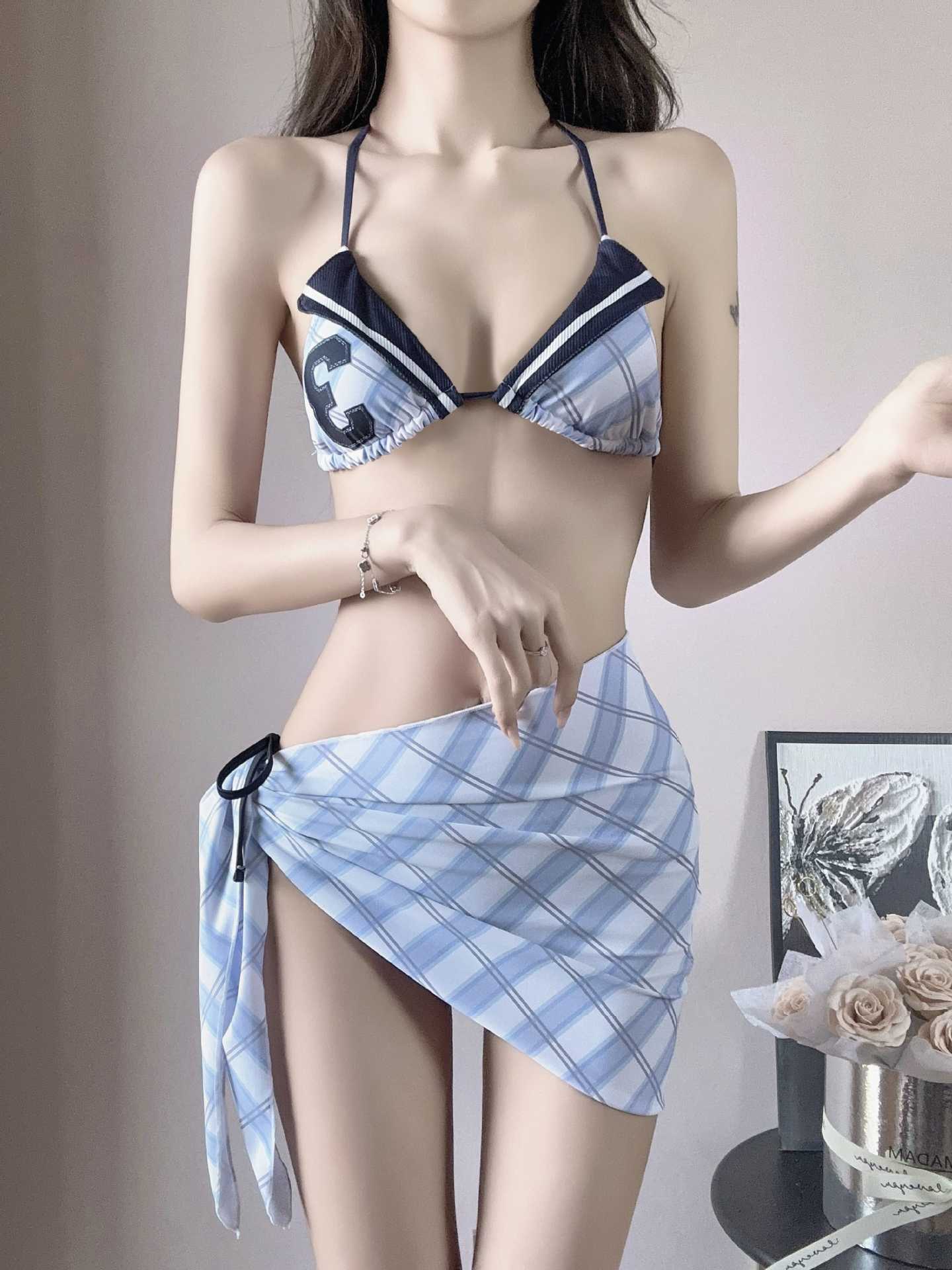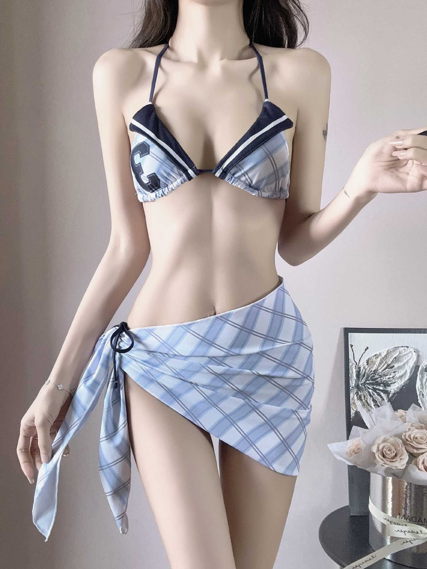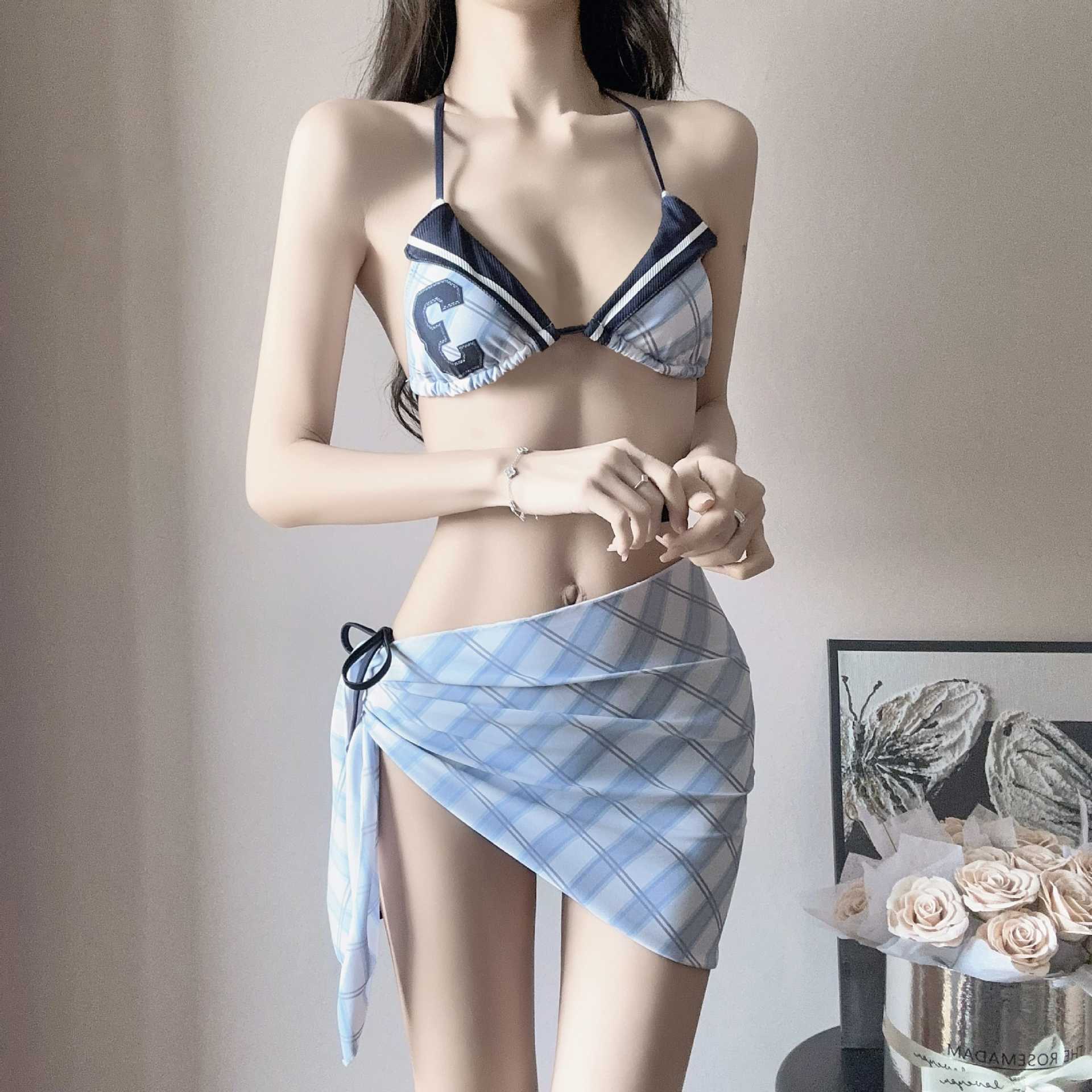 2025 새로운 미국 스타일 레트로 소녀의 비키니 슬림 배꼽 개더링 휴가 스커트 분할 수영복스토어 가기