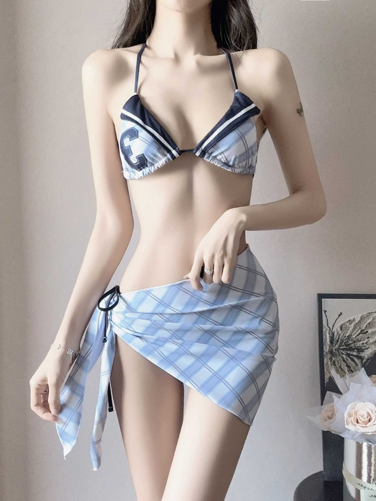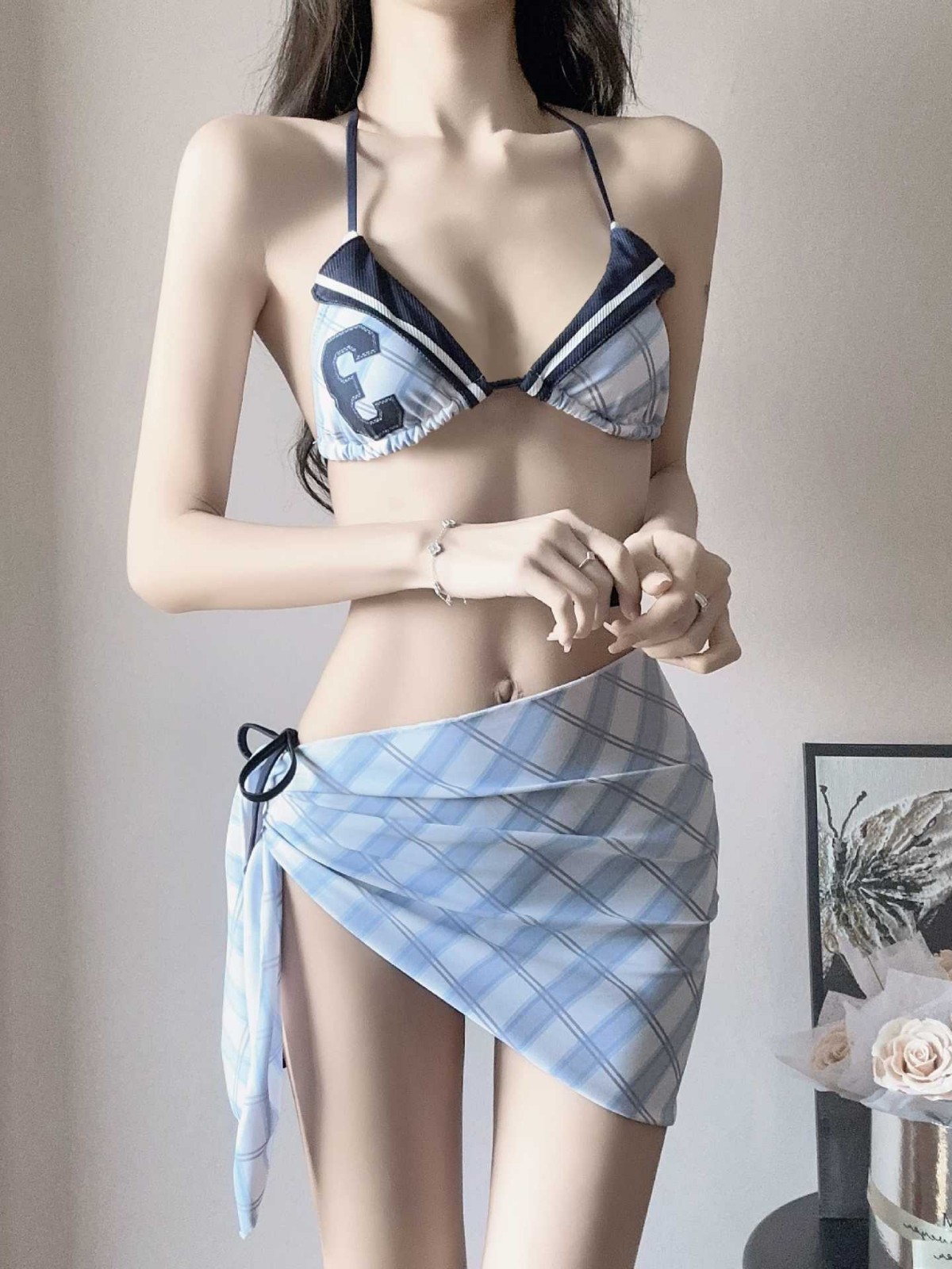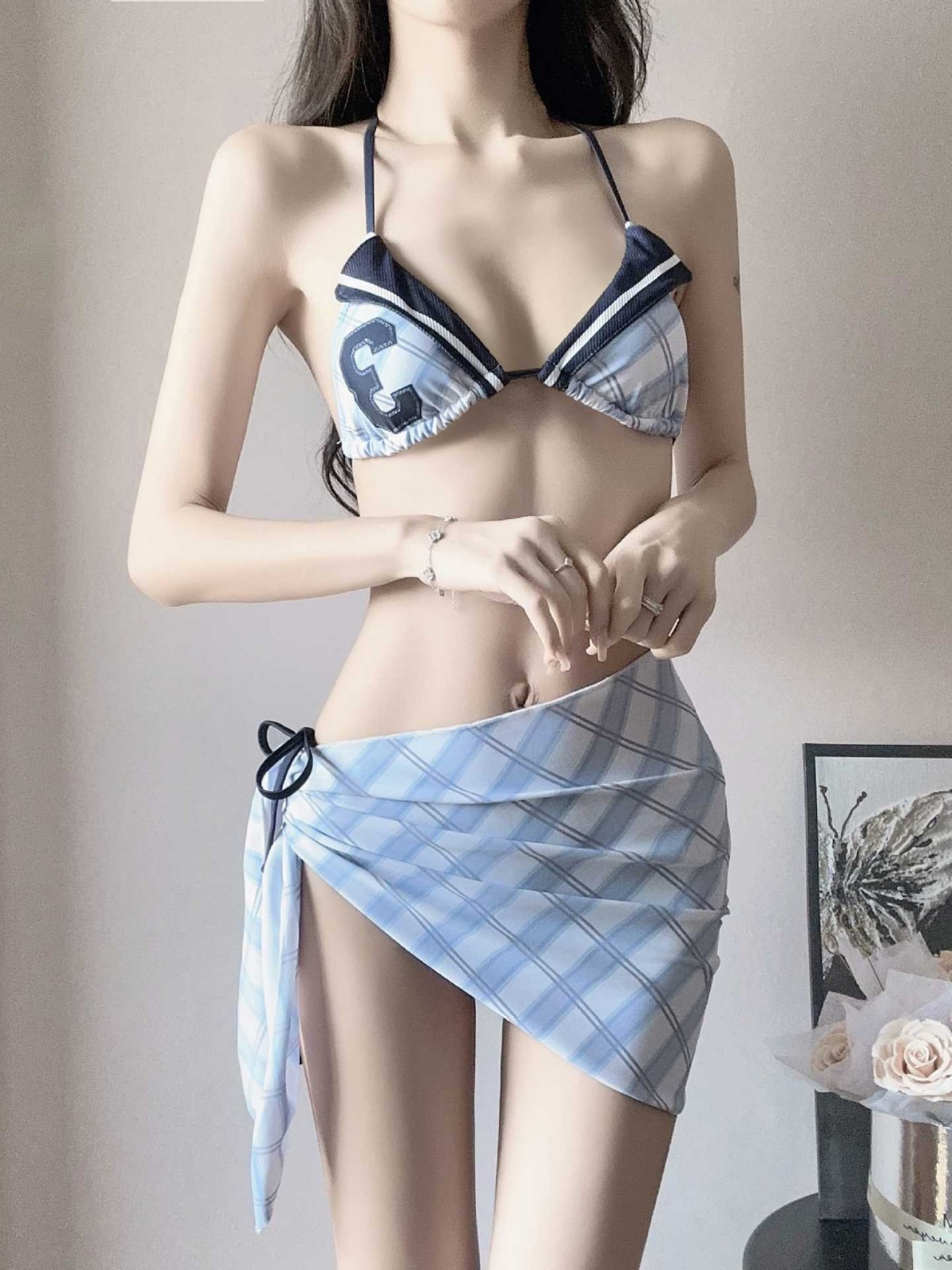 2025 새로운 미국 스타일 레트로 소녀의 비키니 슬림 배꼽 개더링 휴가 스커트 분할 수영복스토어 가기