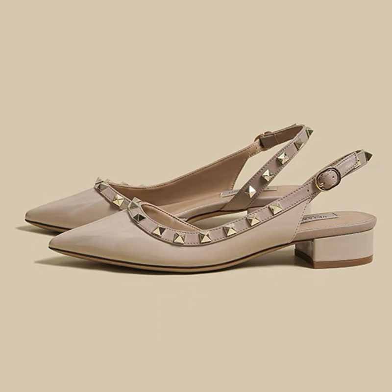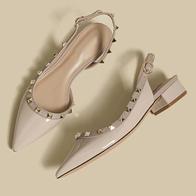 2025 년 여름 새로운 도착 리벳 버클 미드 힐 봄 포인팅 된 힐 리벳 샌들과 슬리퍼