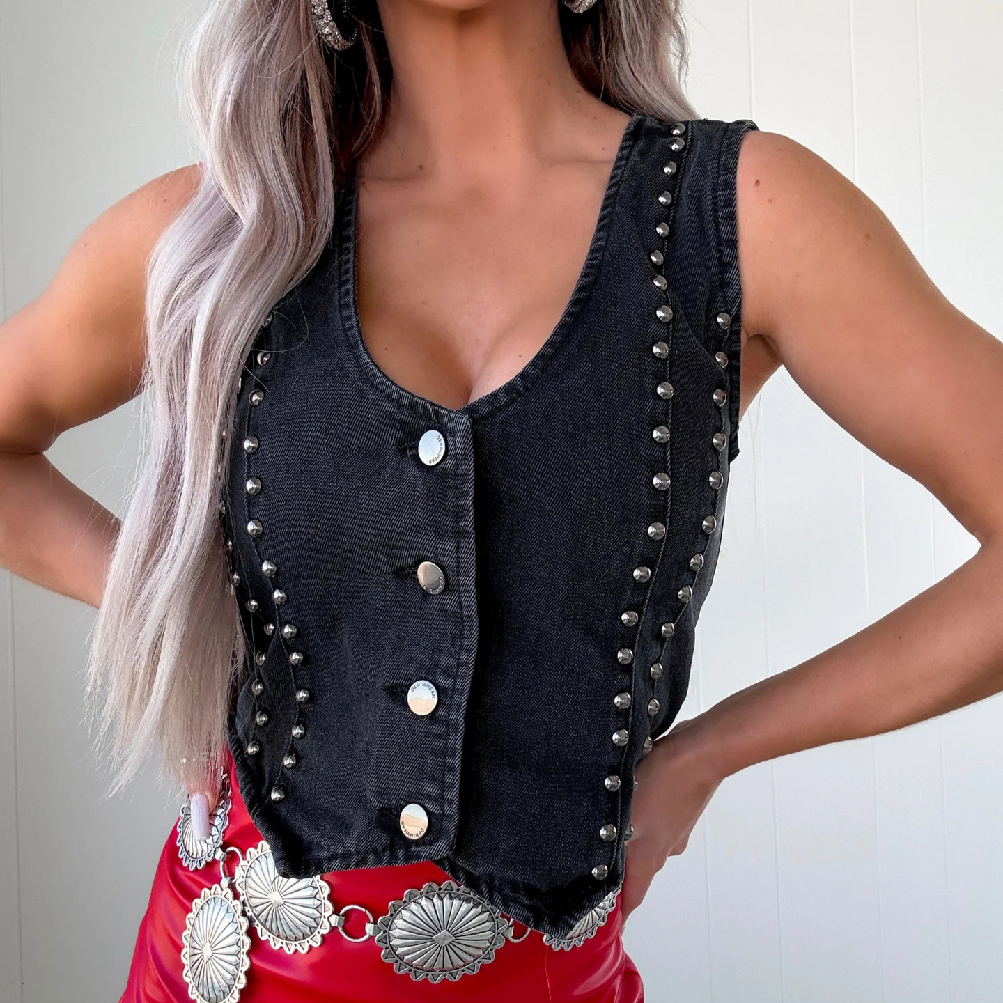 25 년 독립 역 유럽과 미국 국경 여름 개성 뜨거운 여자 민소매 리벳 v 칼라 데님 조끼 8992
