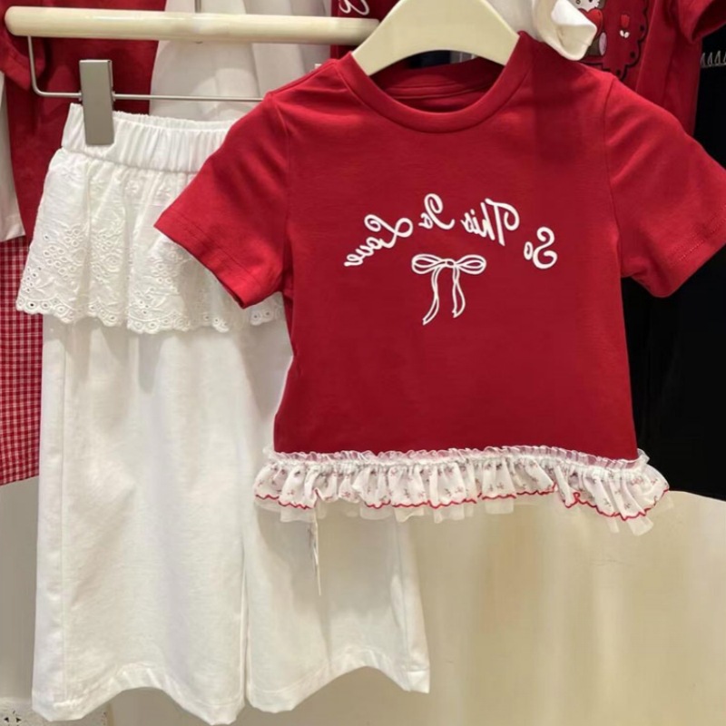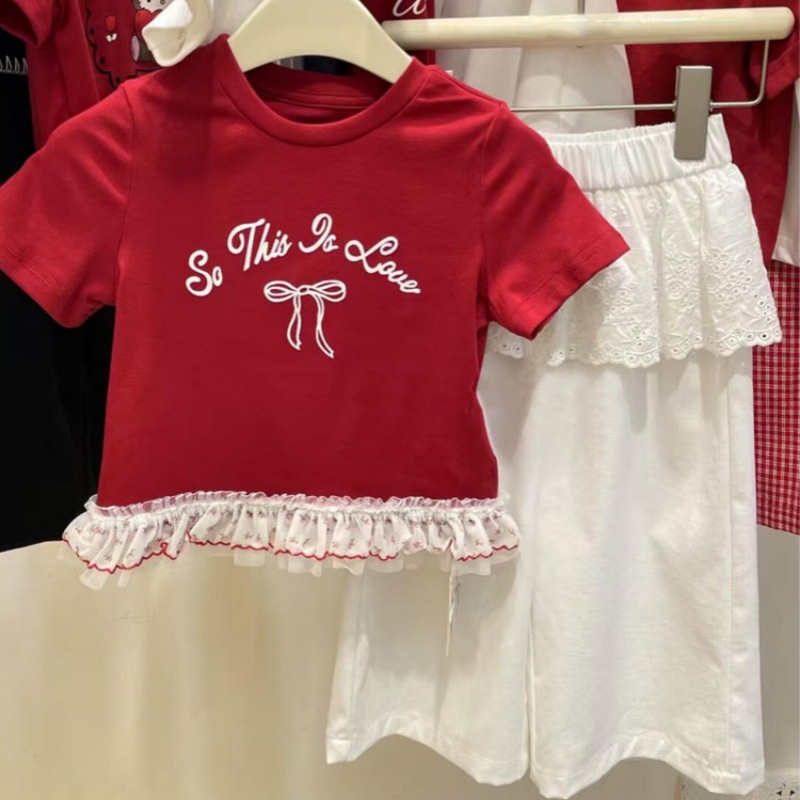 라임 소녀의 여름 세트 새로운 어린이 서양식 편지 스티칭 레이스 반팔 탑 바지스토어 가기