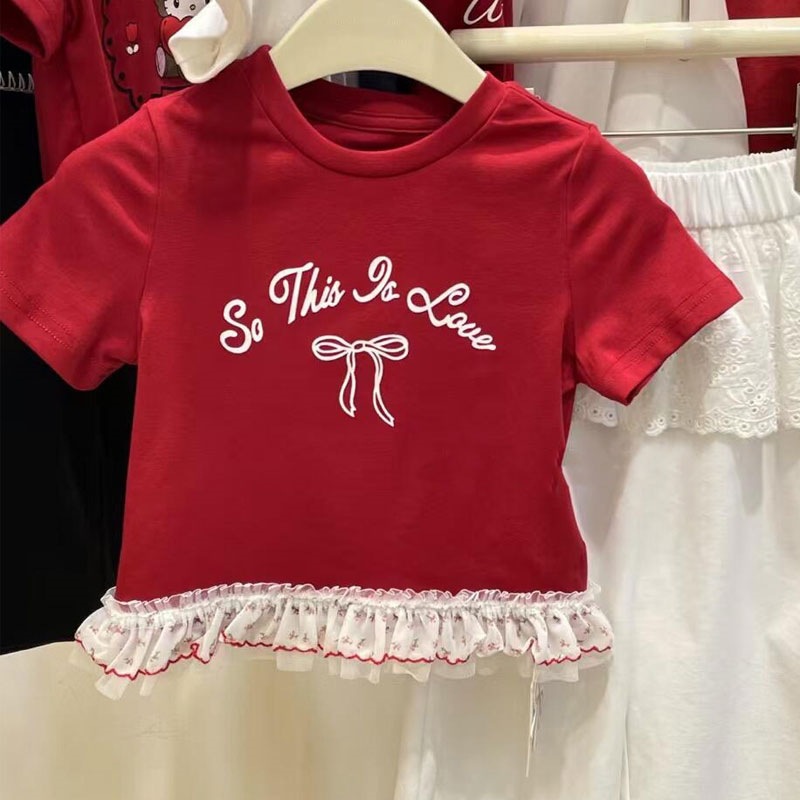 라임 소녀의 여름 세트 새로운 어린이 서양식 편지 스티칭 레이스 반팔 탑 바지