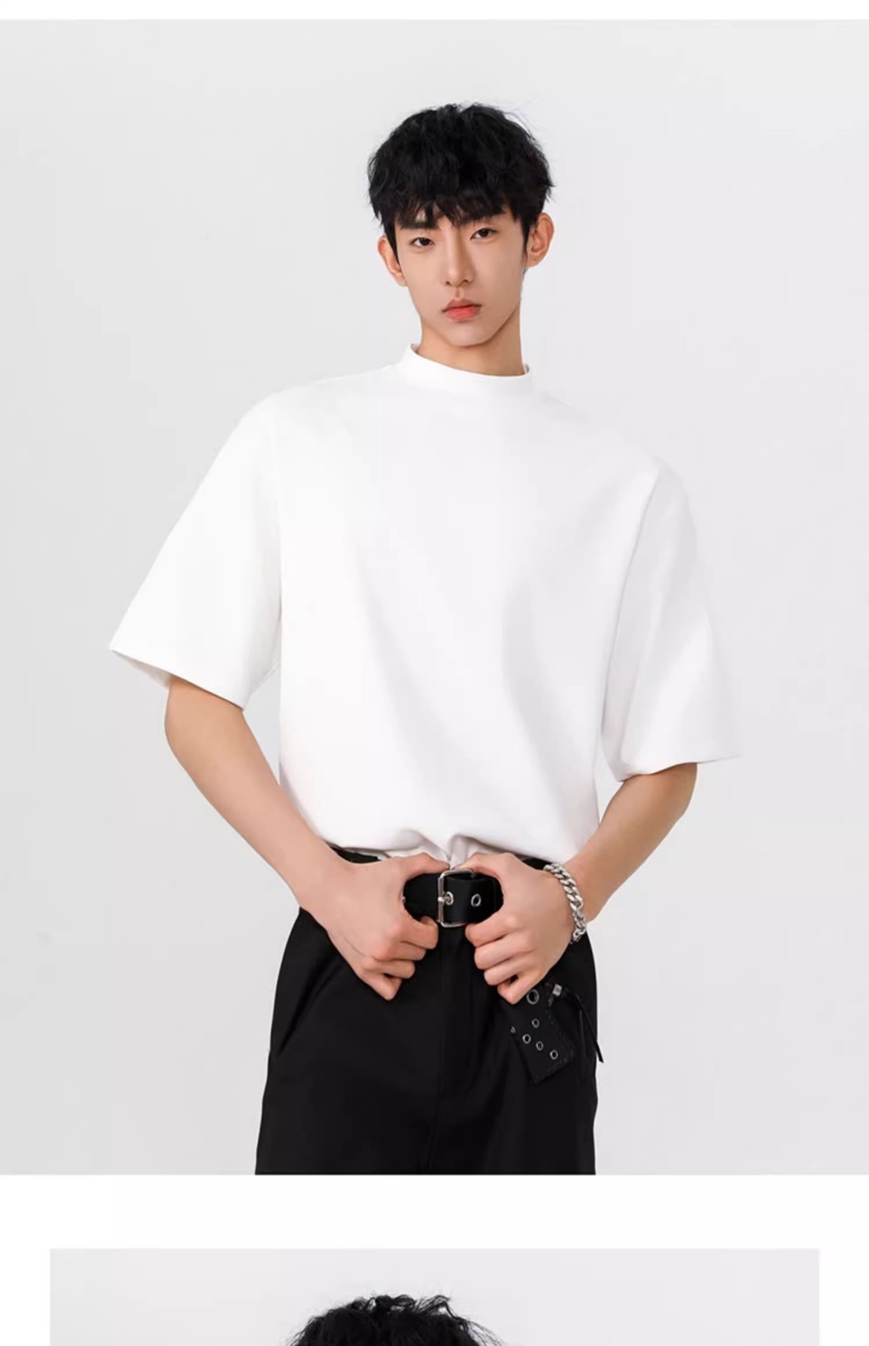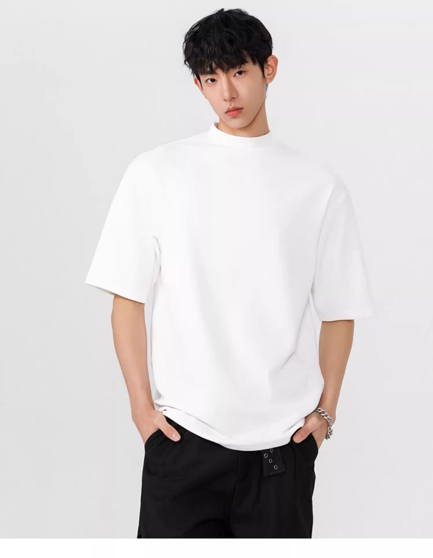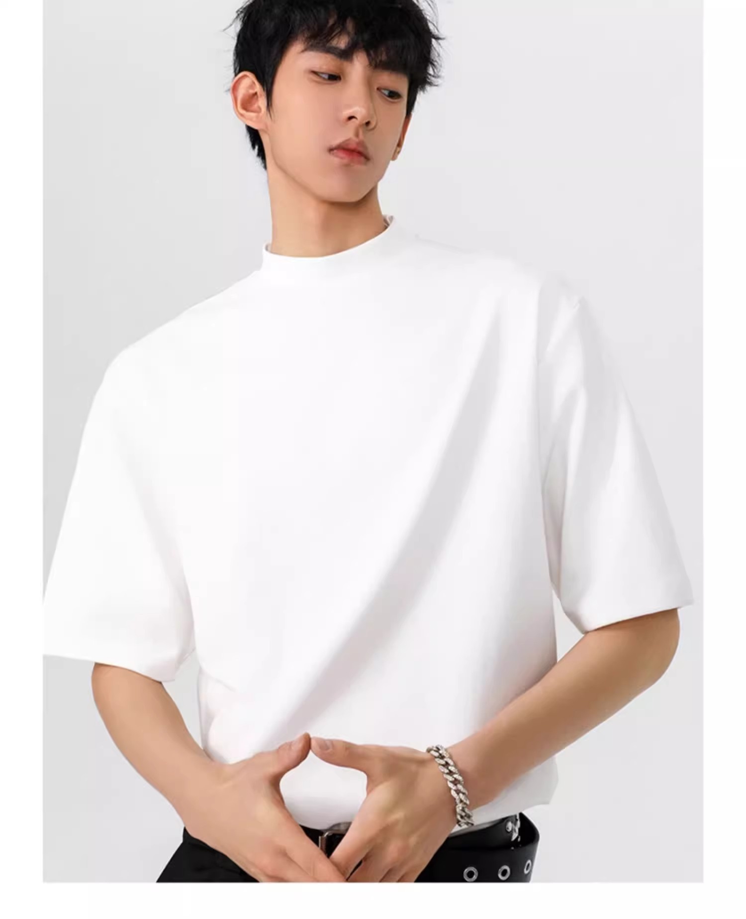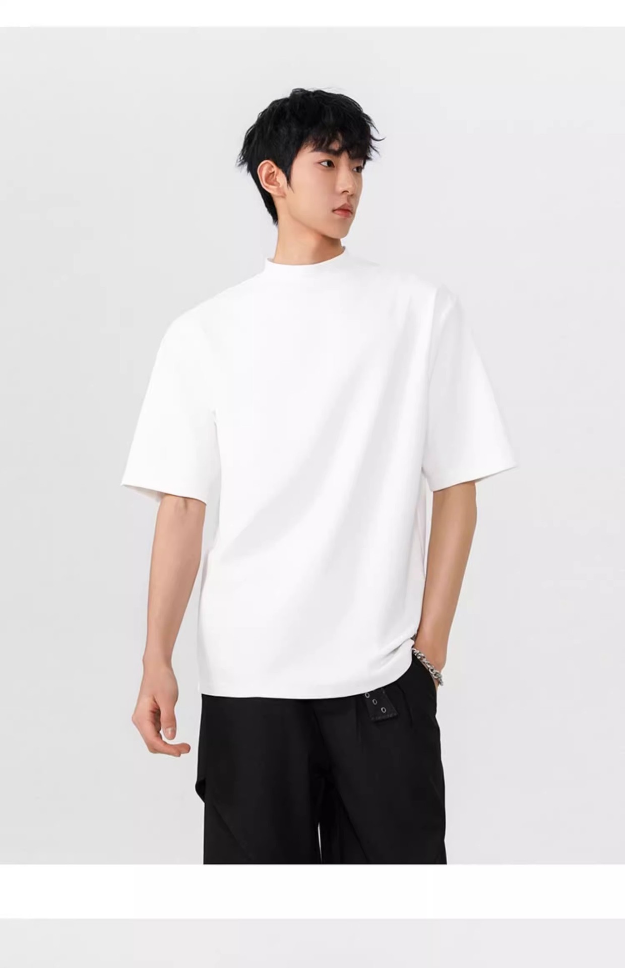하프 하이 칼라 퓨어 화이트 반팔 티셔츠 남자 여름 새 도착 느슨한 반소매 옷 트렌디 브랜드 헤비 베이스 셔츠