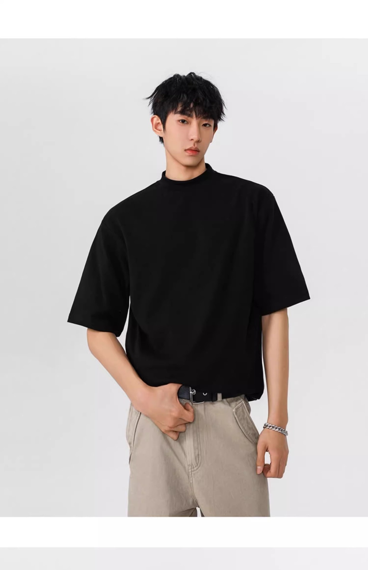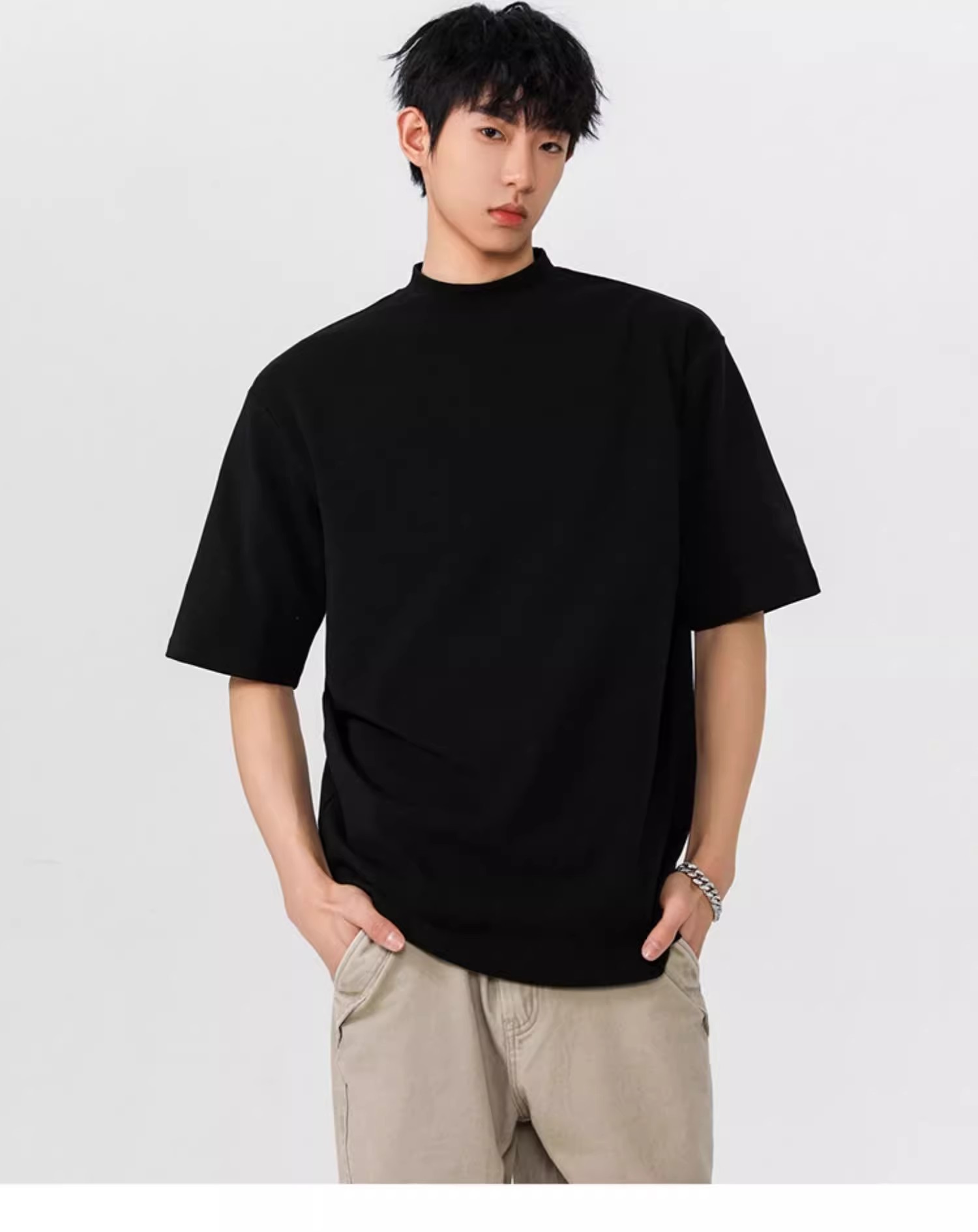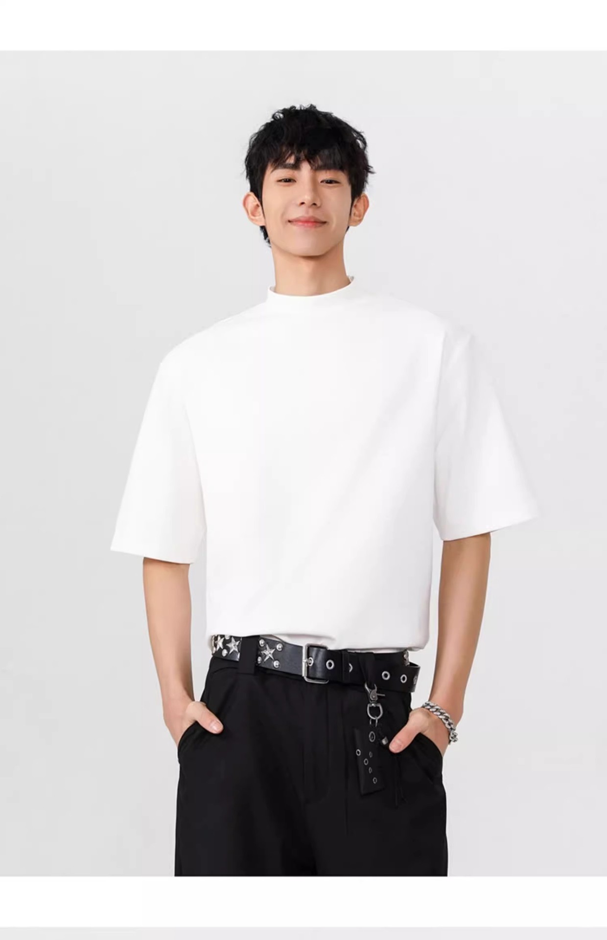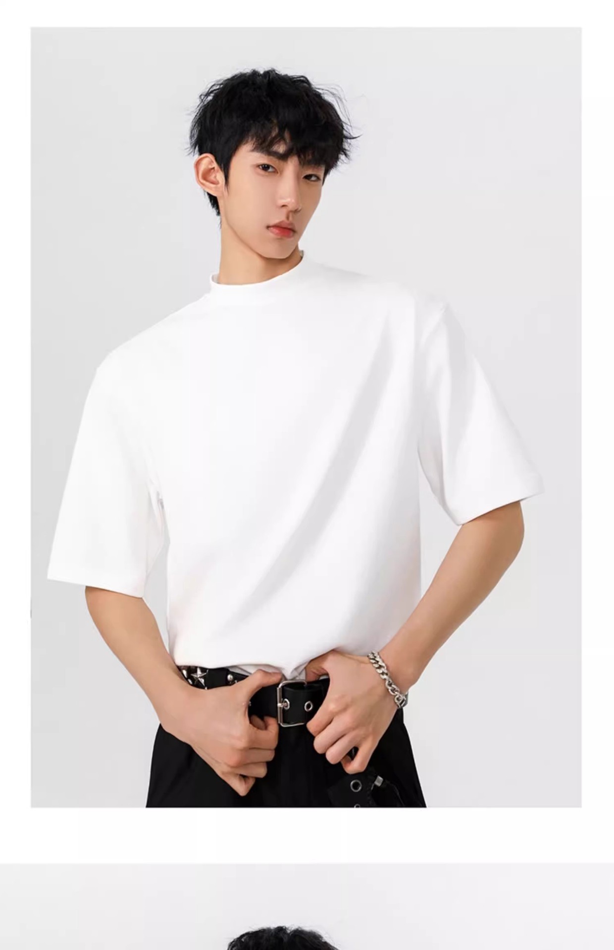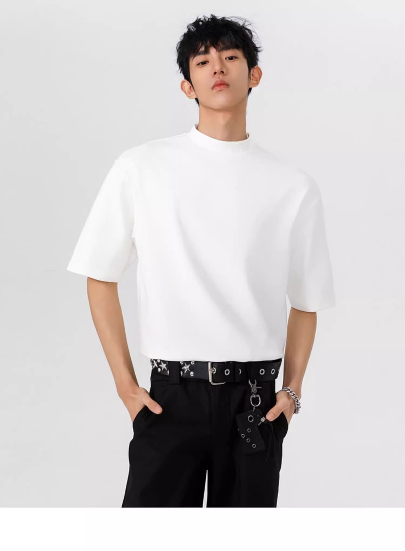 하프 하이 칼라 퓨어 화이트 반팔 티셔츠 남자 여름 새 도착 느슨한 반소매 옷 트렌디 브랜드 헤비 베이스 셔츠