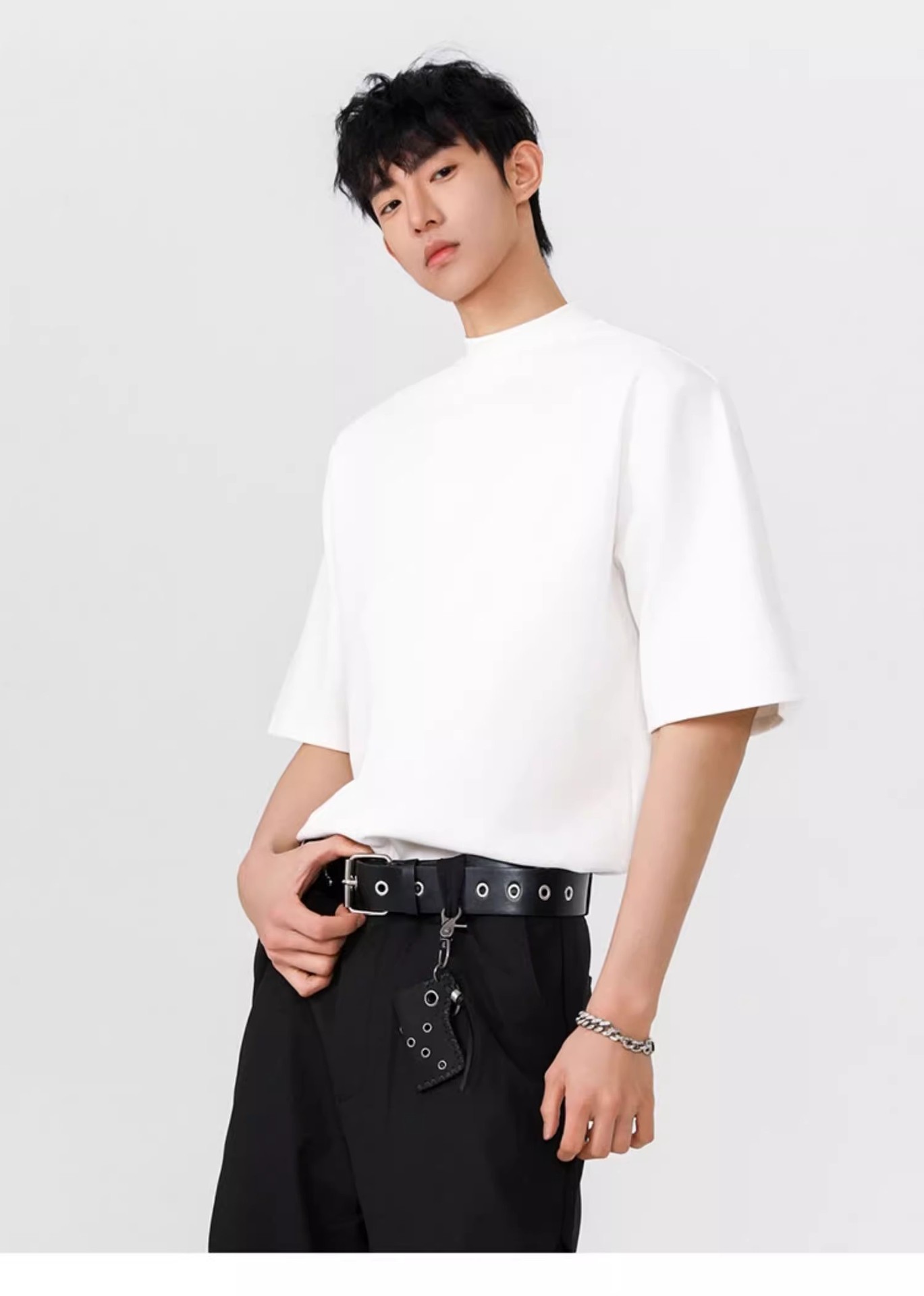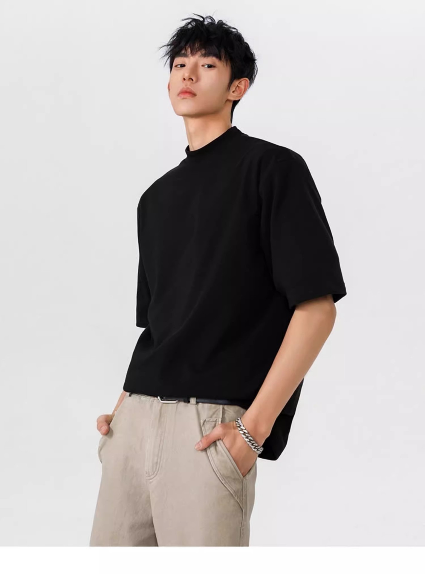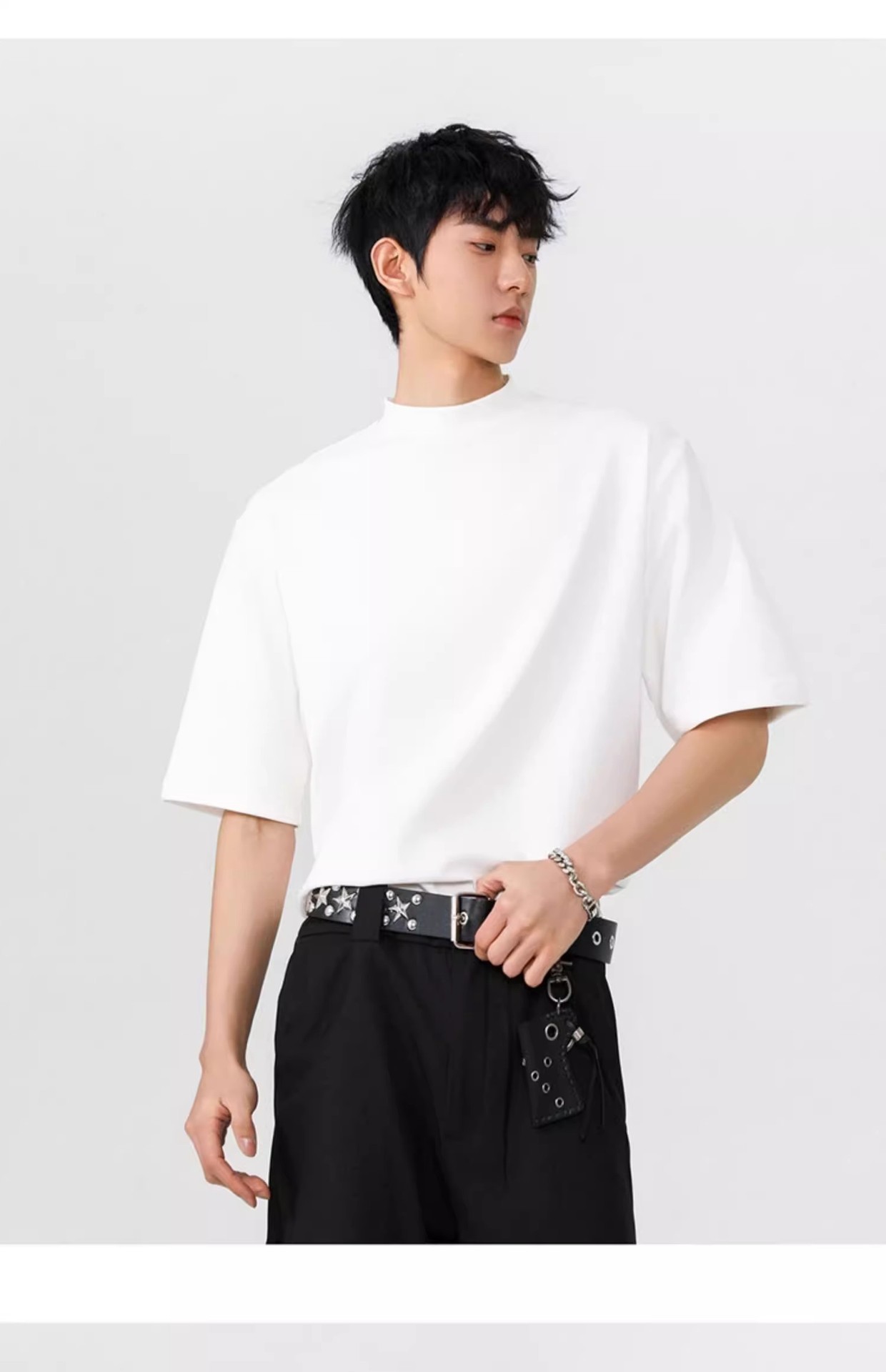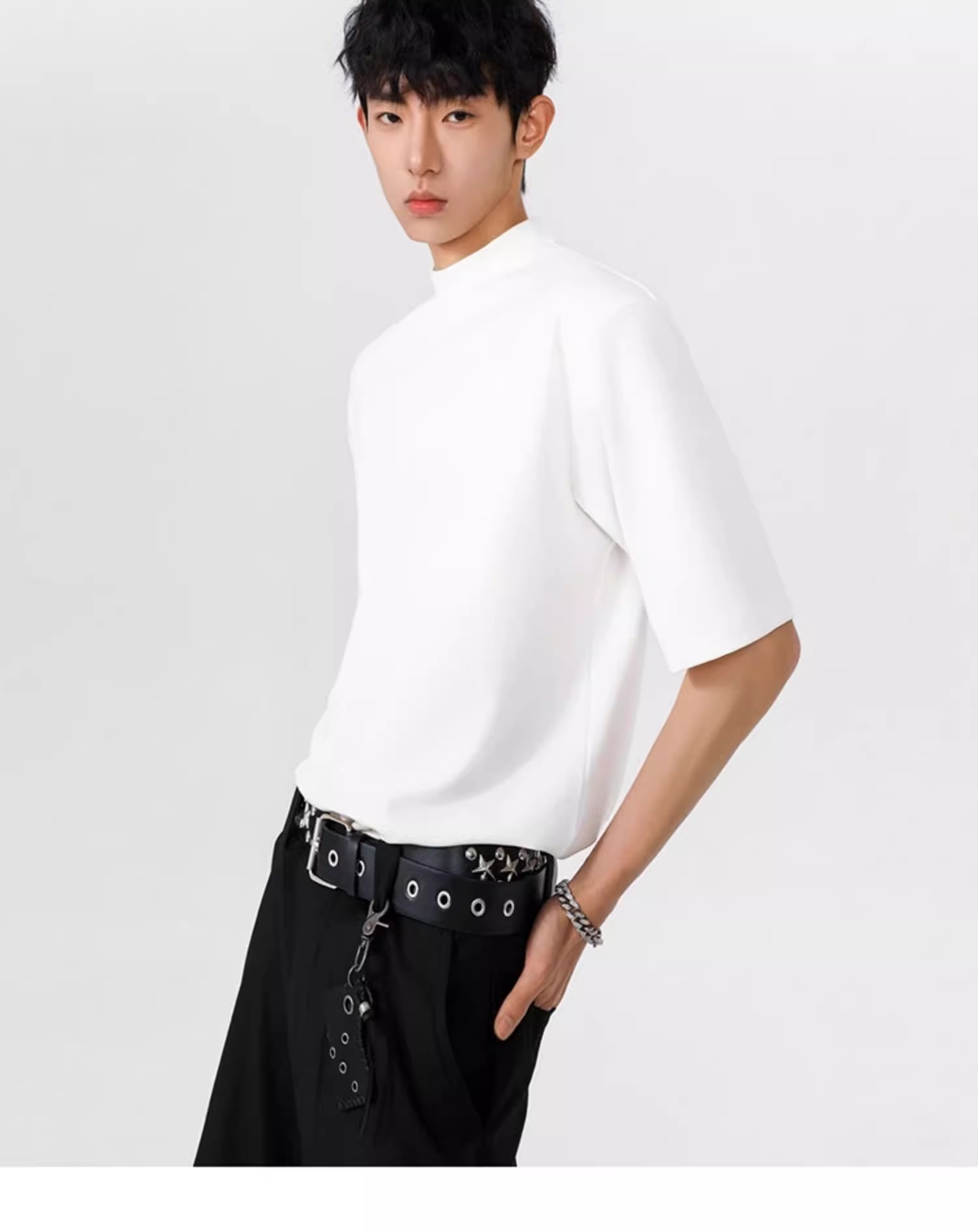 하프 하이 칼라 퓨어 화이트 반팔 티셔츠 남자 여름 새 도착 느슨한 반소매 옷 트렌디 브랜드 헤비 베이스 셔츠