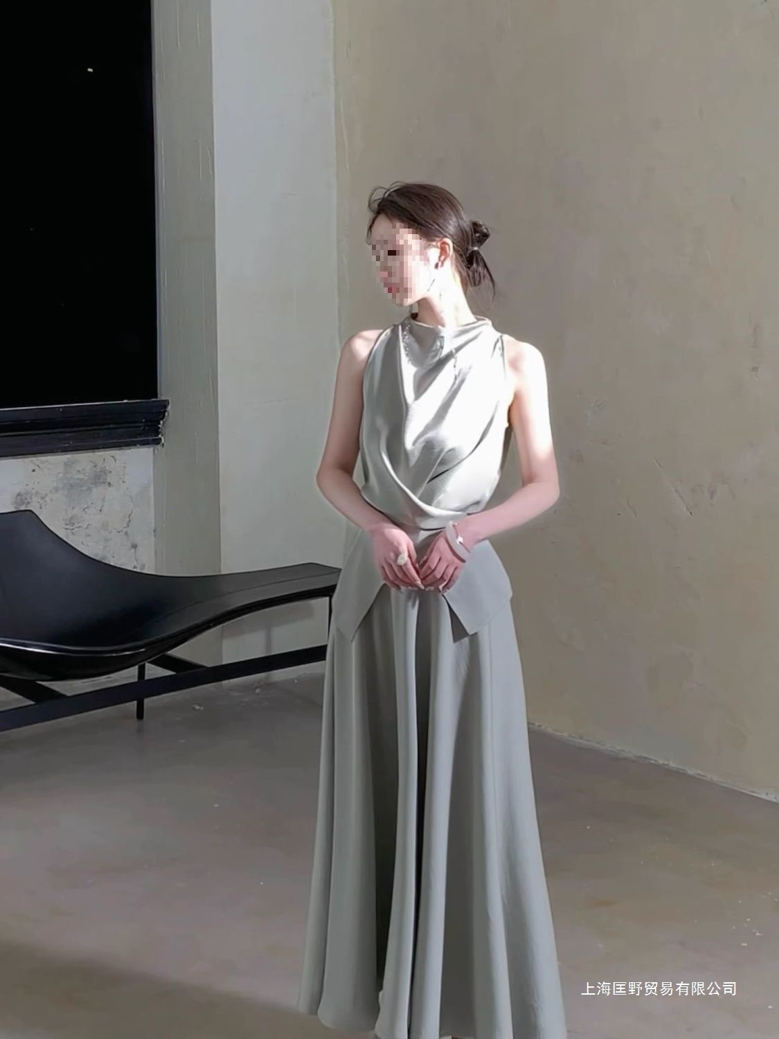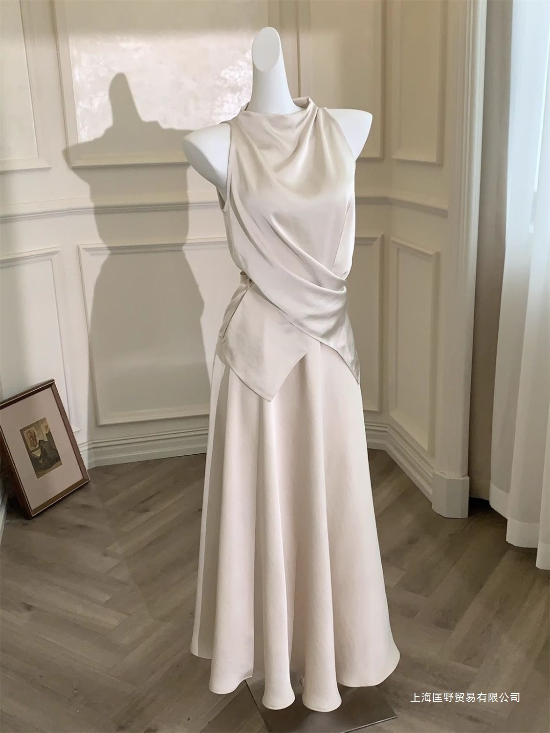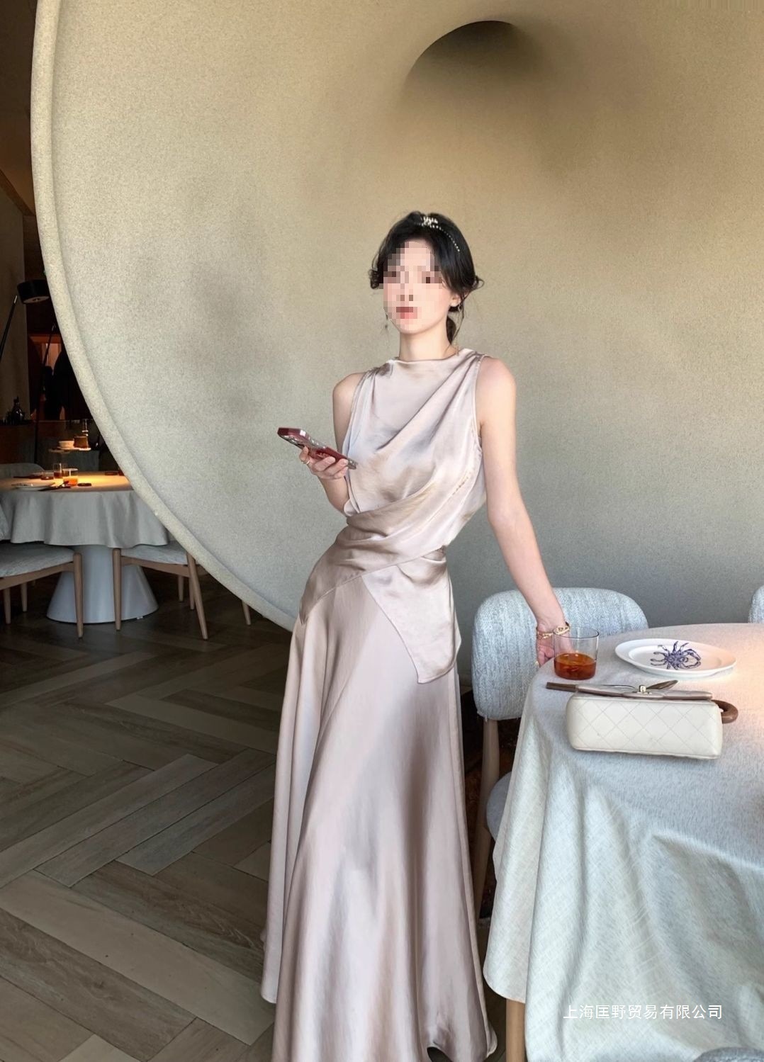 2025 새로운 2025 틈새 새로운 드레스 디자인 새틴 민소매 슬리밍 레이스 업 패션 슈트