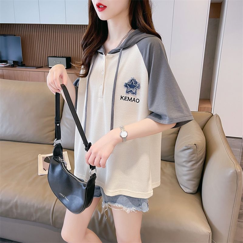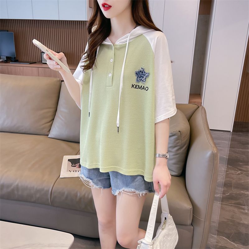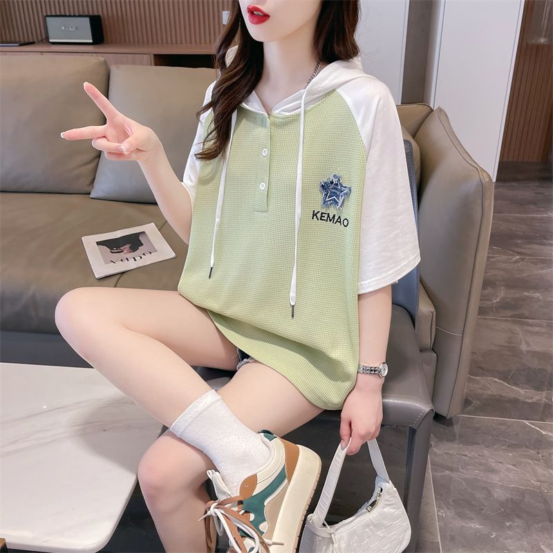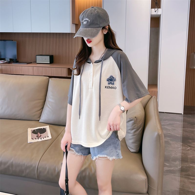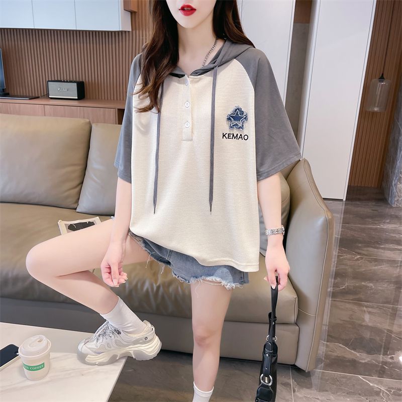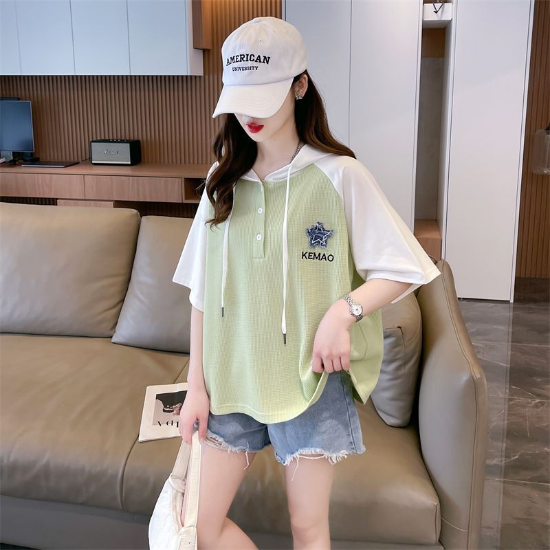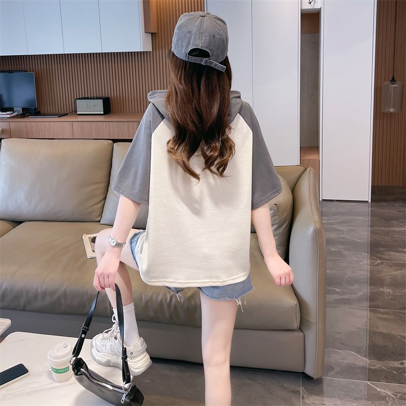 라글란 슬리브 후드 티셔츠 여성 반팔 여름 2025 새로운 한국 스타일 느슨한 플러스 사이즈 올 매치 와피 컬러 대비 탑스토어 가기