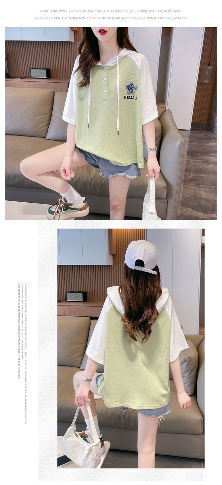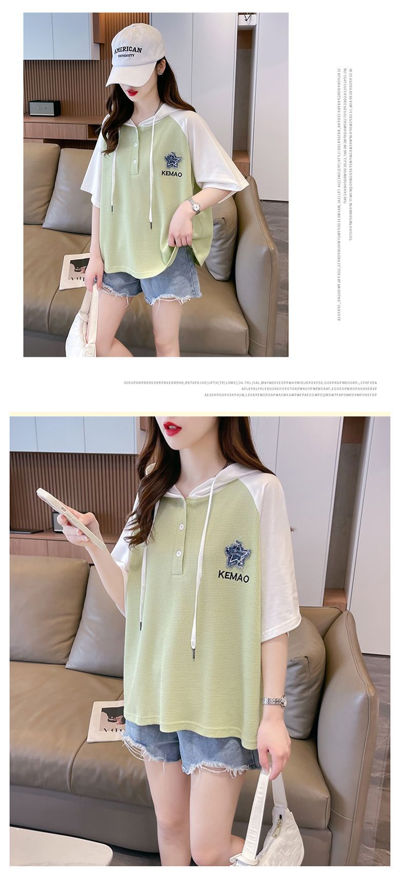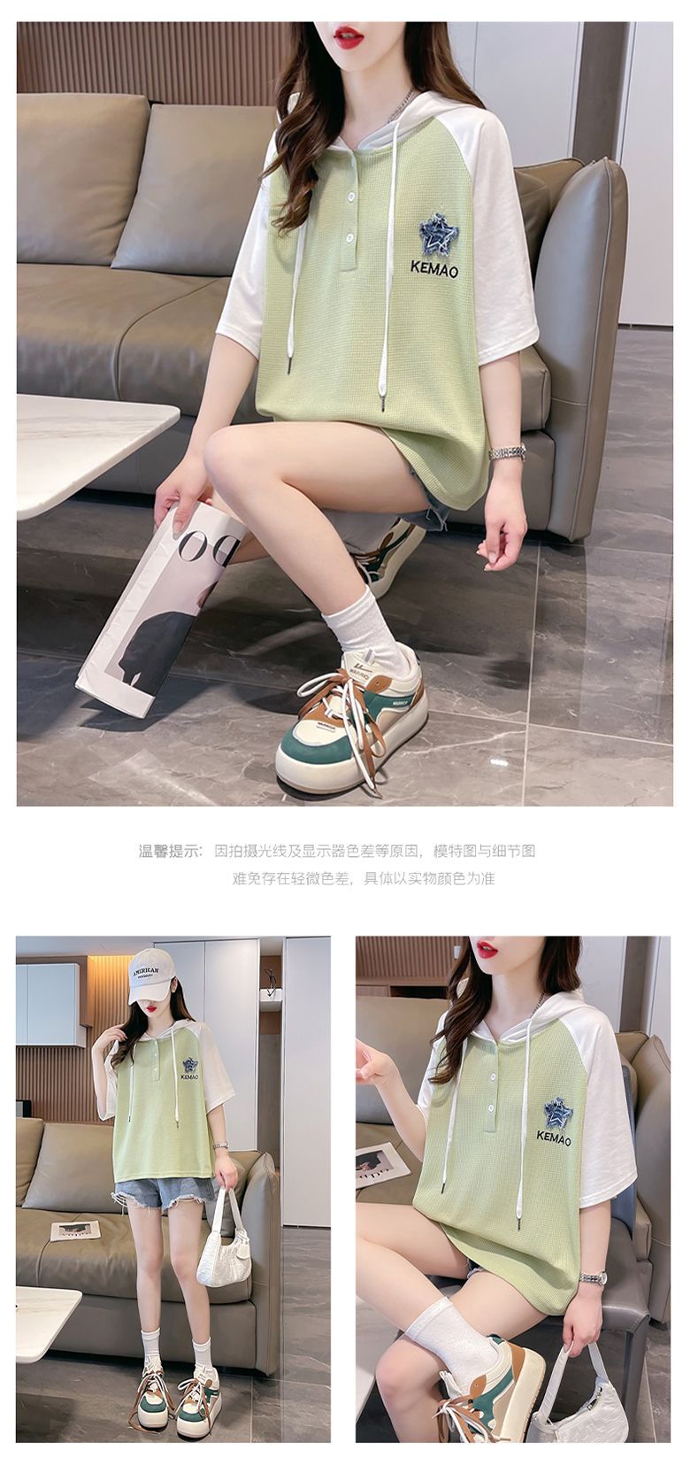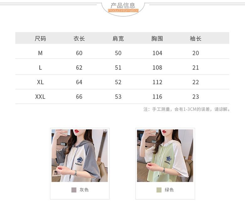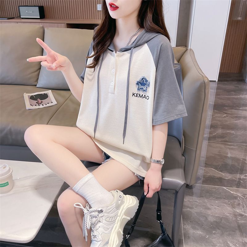 라글란 슬리브 후드 티셔츠 여성 반팔 여름 2025 새로운 한국 스타일 느슨한 플러스 사이즈 올 매치 와피 컬러 대비 탑스토어 가기