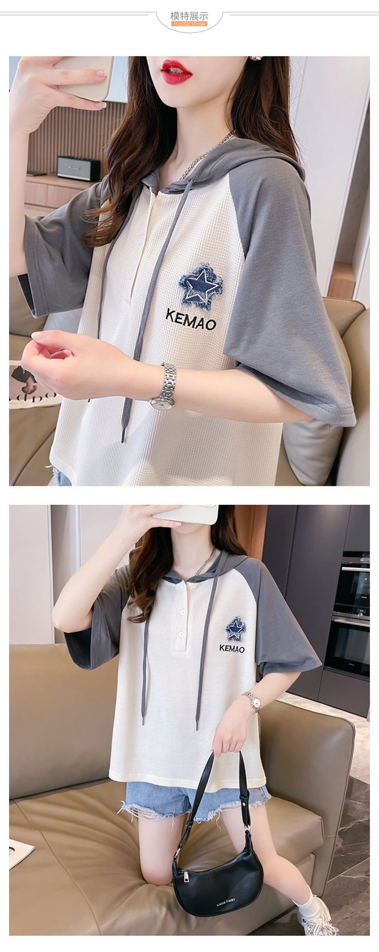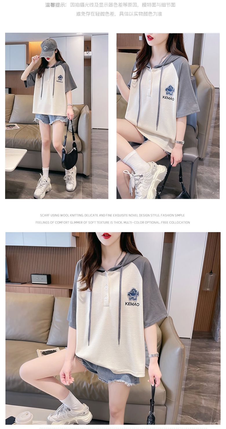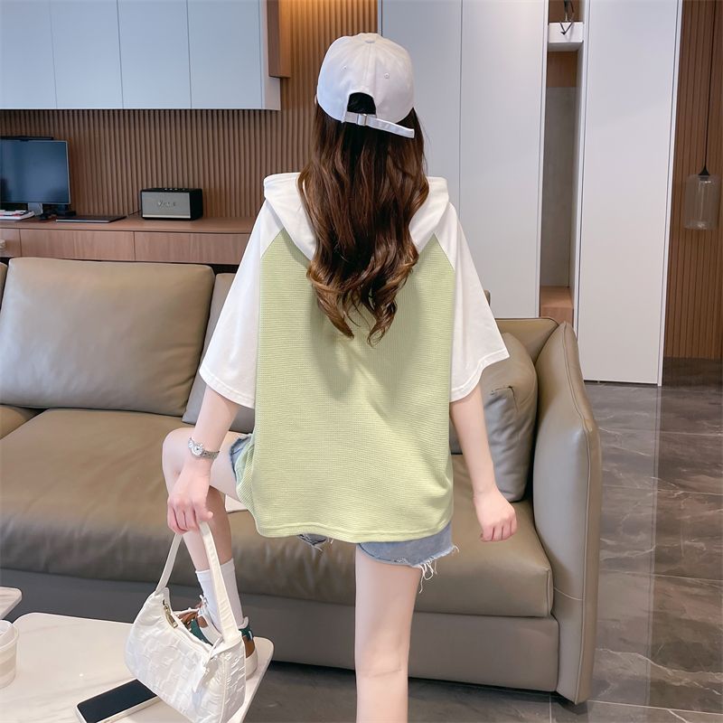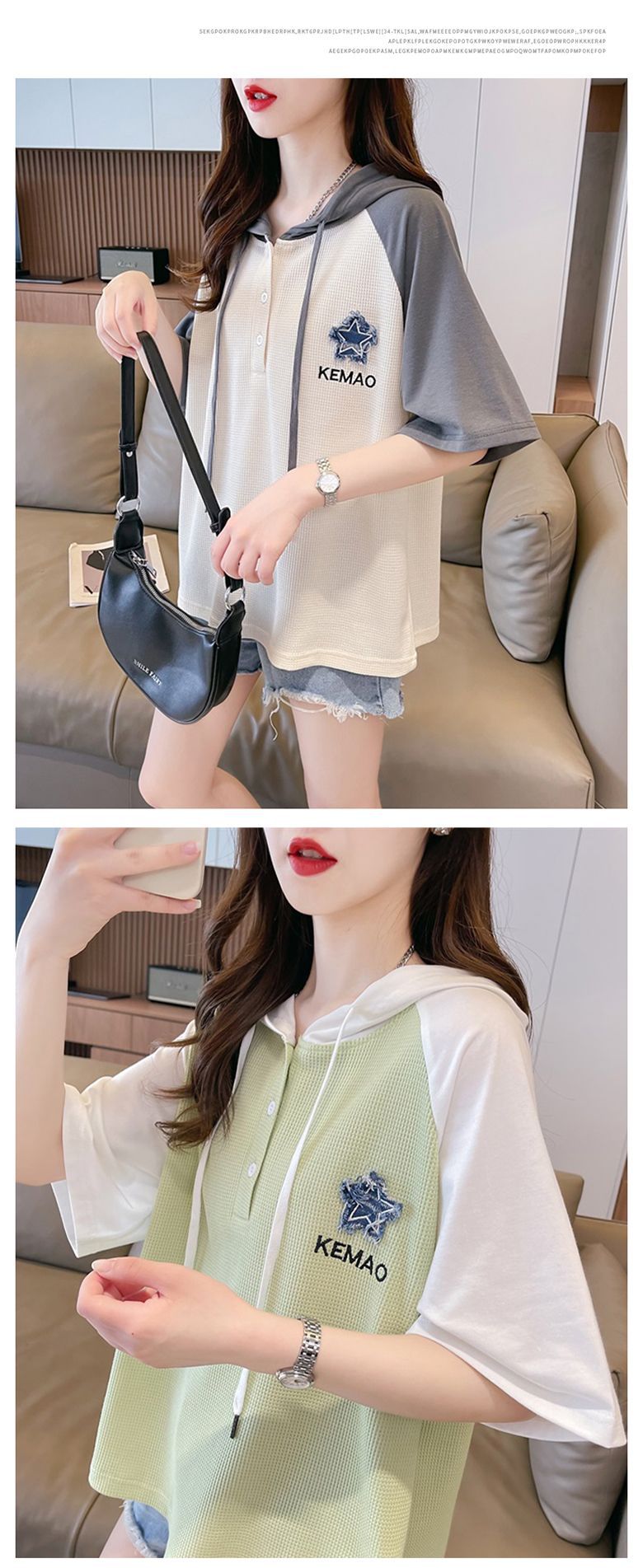 라글란 슬리브 후드 티셔츠 여성 반팔 여름 2025 새로운 한국 스타일 느슨한 플러스 사이즈 올 매치 와피 컬러 대비 탑스토어 가기