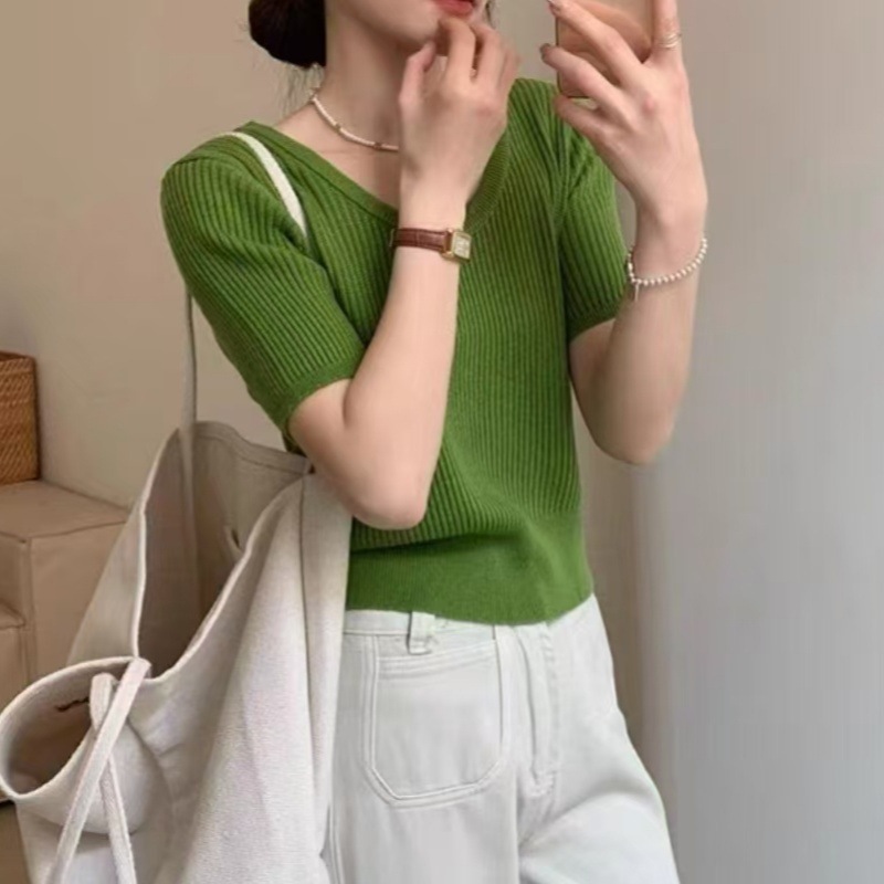 KANING 한국식 U-넥 얇은 니트 반팔 티셔츠 여성용 느슨한 여름 새로운 간단한 피트 스트립 작은 탑스토어 가기