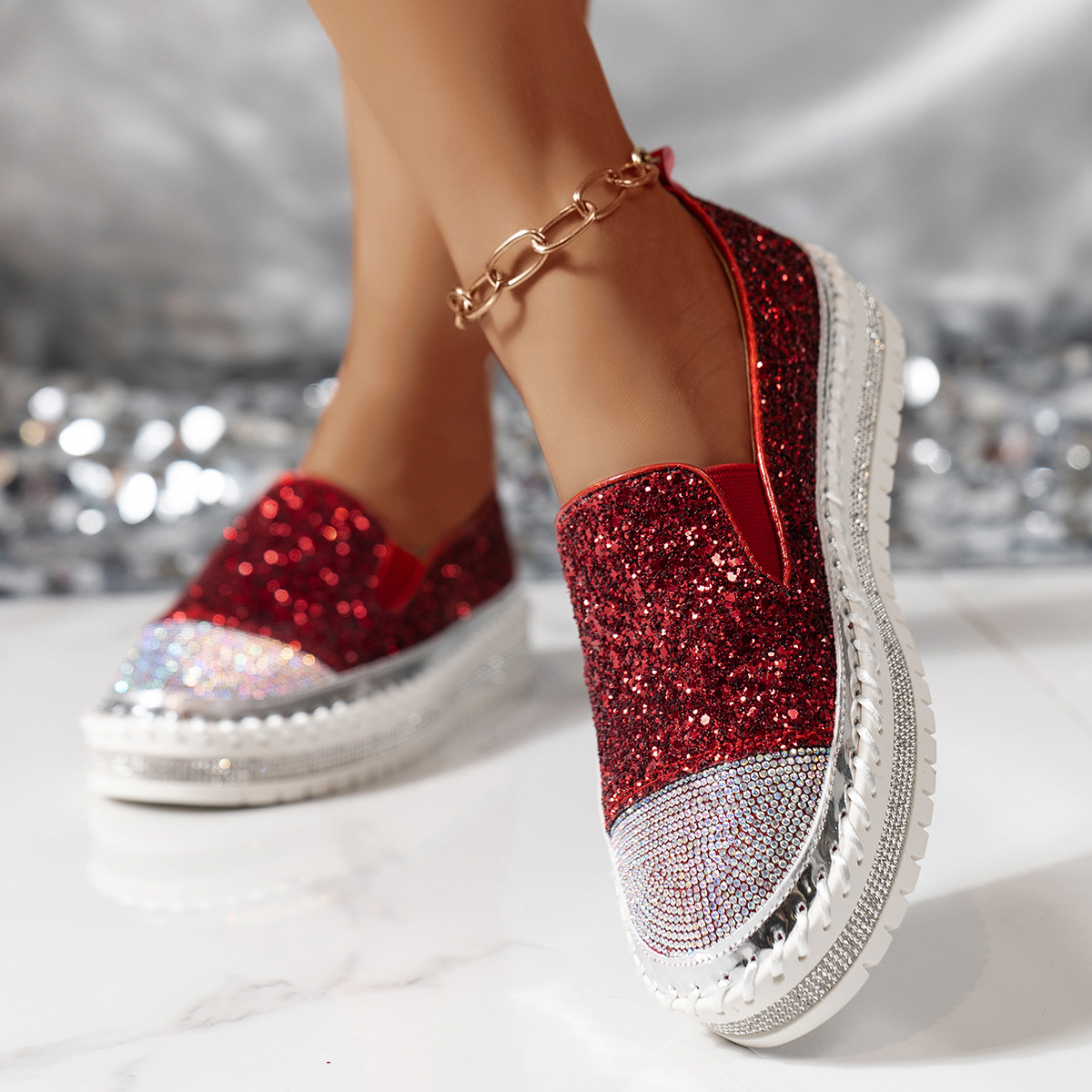 봄 새로운 한국 스타일 라운드 발가락 펌프 플랫 바닥 라인 석 캐주얼 신발 스팽글 두꺼운 밑창 로퍼 여성