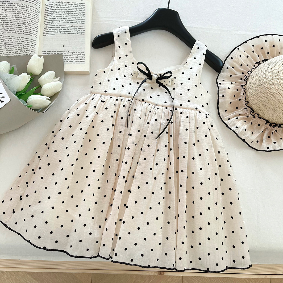 2025 새로운 여름 한국 스타일 소녀 의류 아기 진주 밀크티 폴카 도트 드레스 공주 드레스스토어 가기