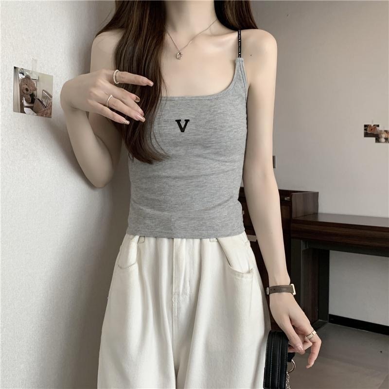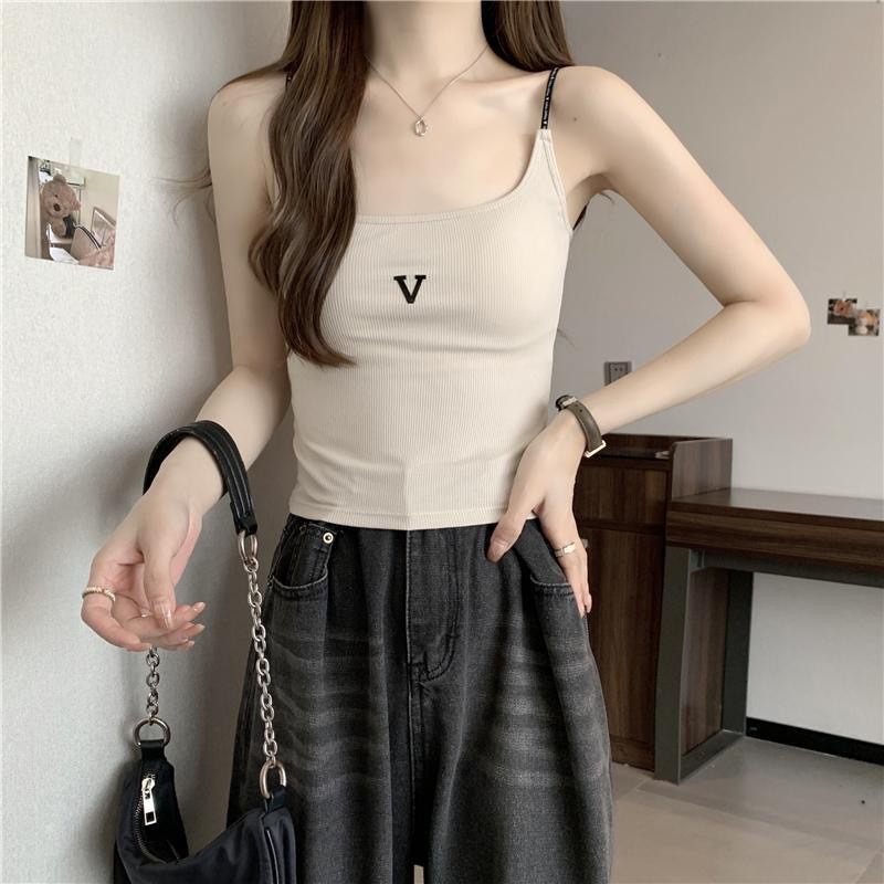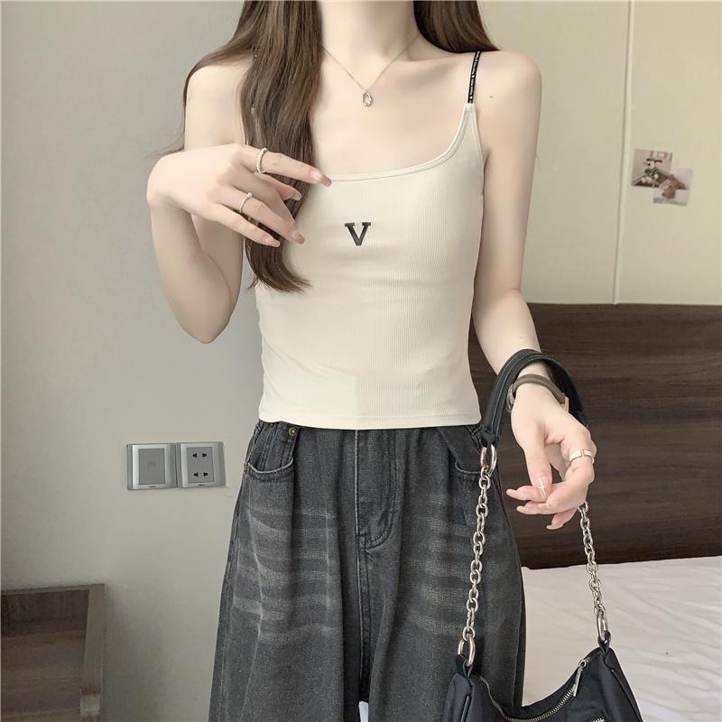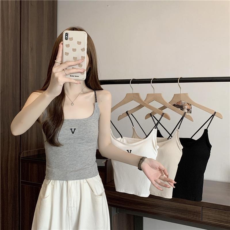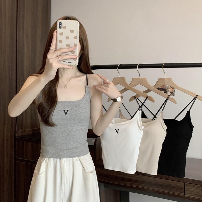 가슴 패드가 있는 여성용 한국식 자수 문자 캐미솔, 내부 및 외부 착용 디자인, 여성용 틈새 슬리밍 탑스토어 가기