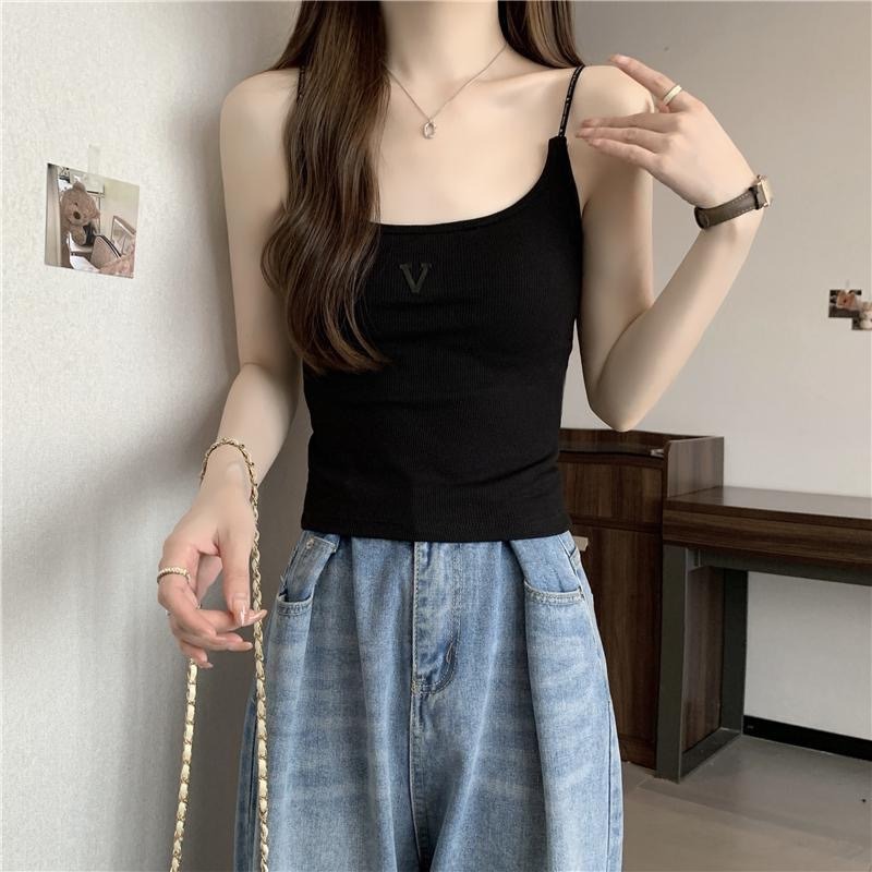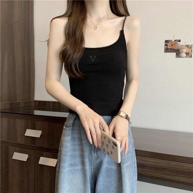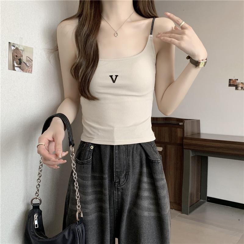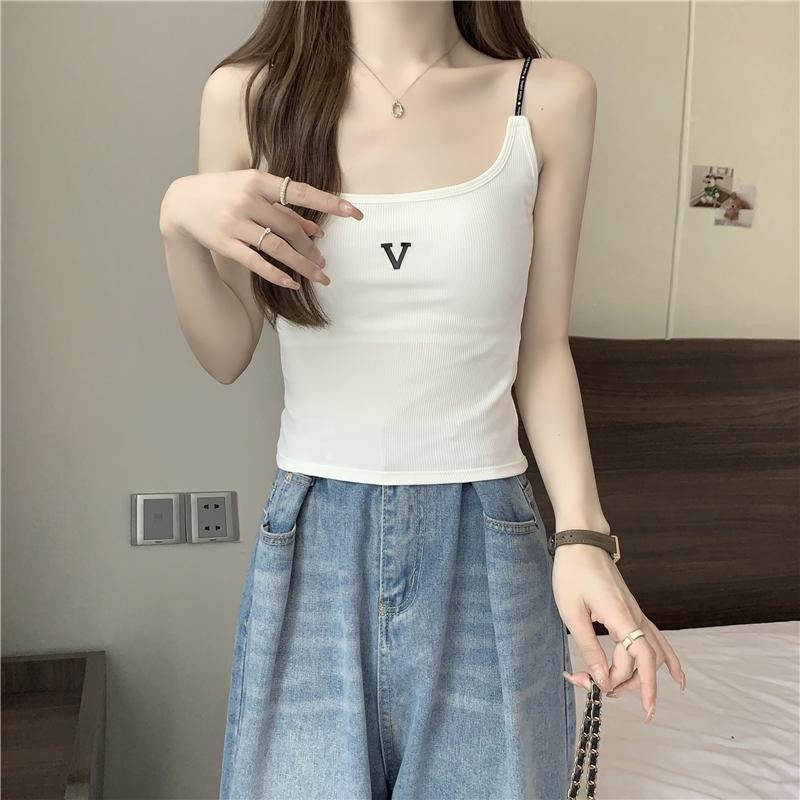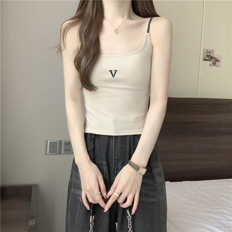 가슴 패드가 있는 여성용 한국식 자수 문자 캐미솔, 내부 및 외부 착용 디자인, 여성용 틈새 슬리밍 탑스토어 가기