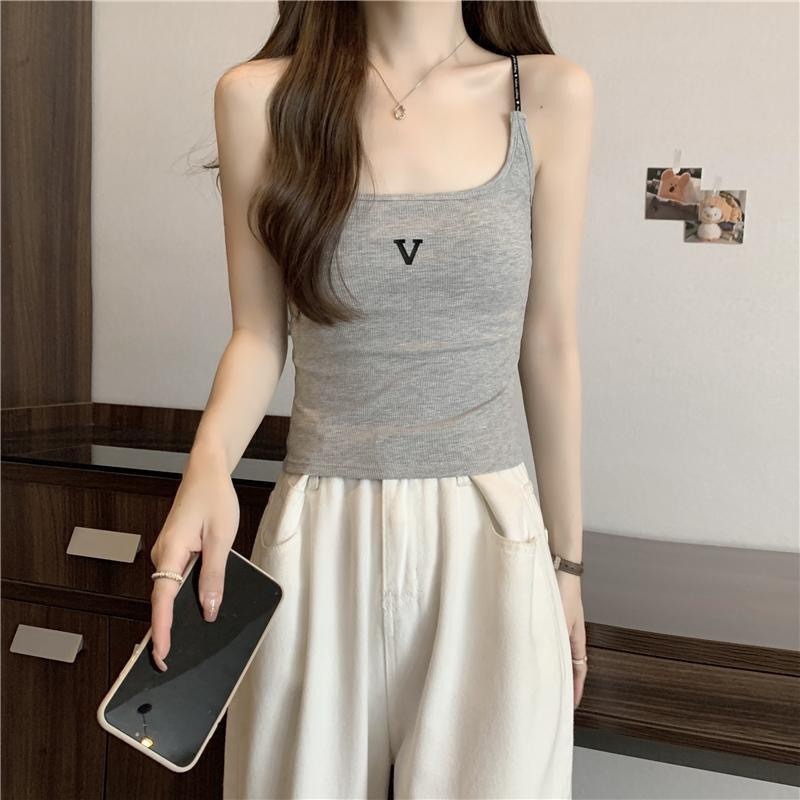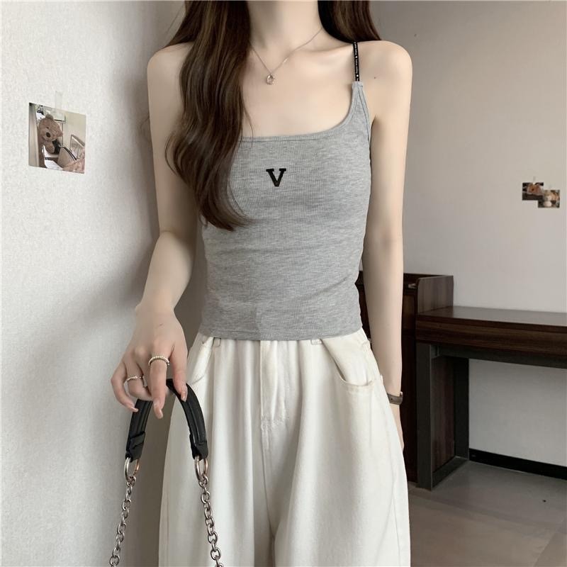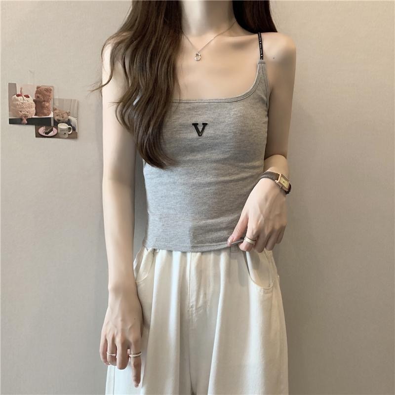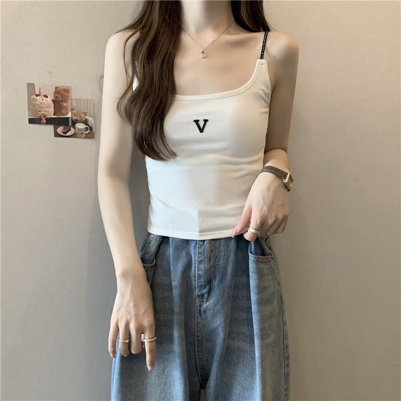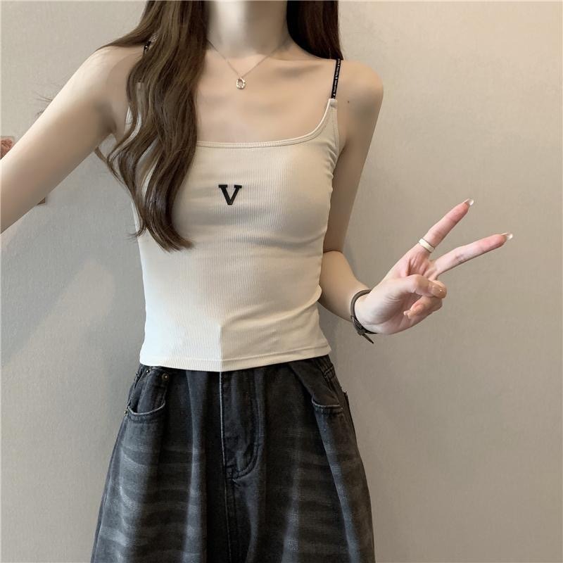 가슴 패드가 있는 여성용 한국식 자수 문자 캐미솔, 내부 및 외부 착용 디자인, 여성용 틈새 슬리밍 탑