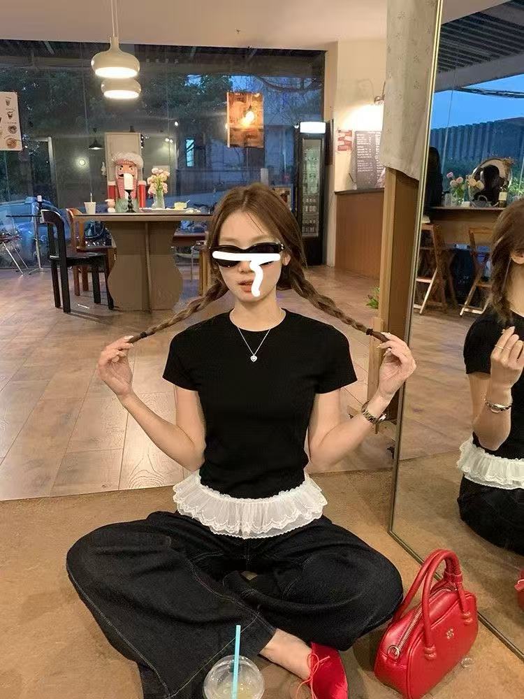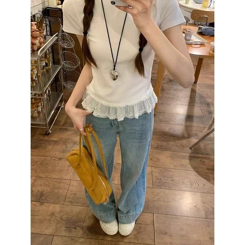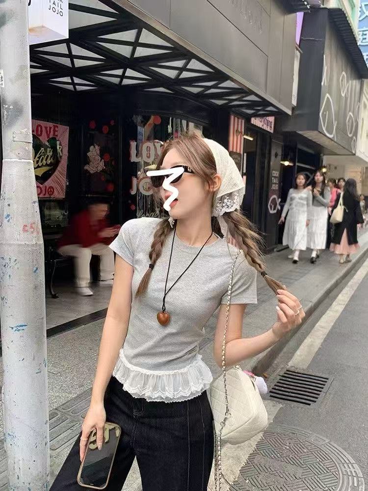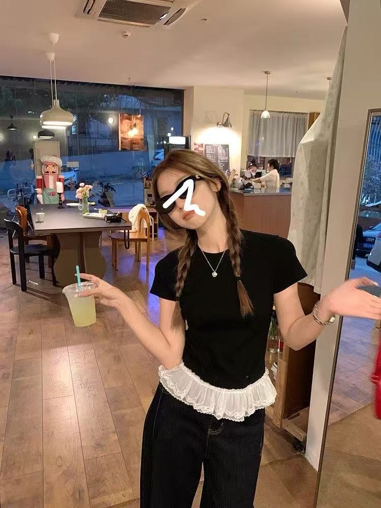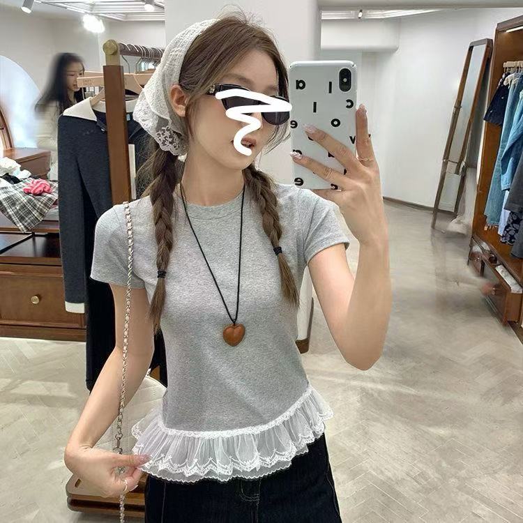 반팔 티셔츠 여성용 여름 새로운 디자인 센스 레이스 스티칭 레이스 달콤하고 핫 슬림 핏 슬리밍베이스 탑스토어 가기