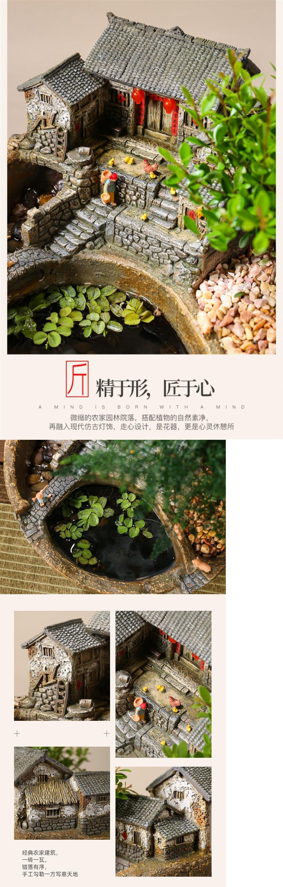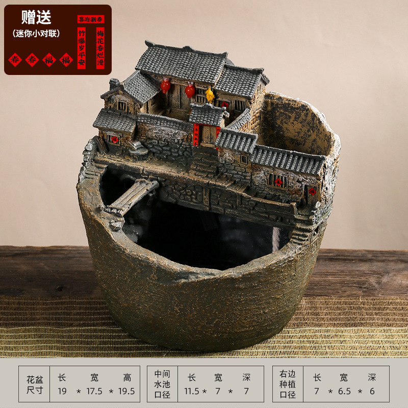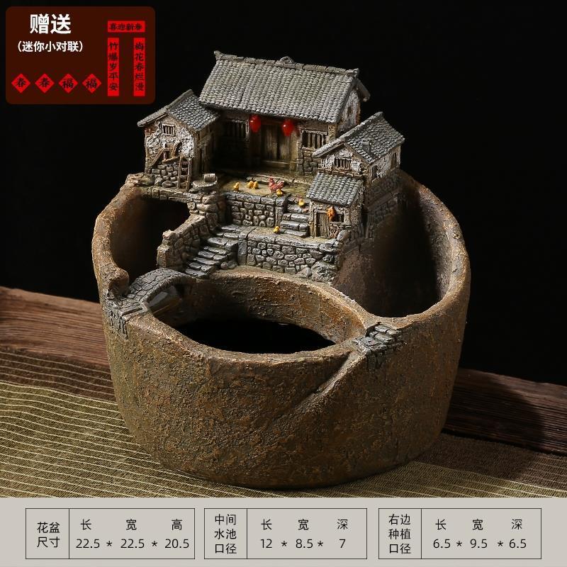 • 작은 다리와 흐르는 물이 있는 대형 빈 대야(물 펌프 장식품)