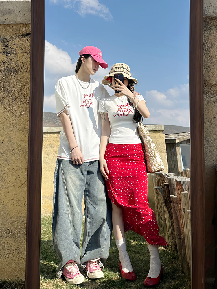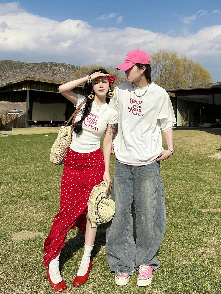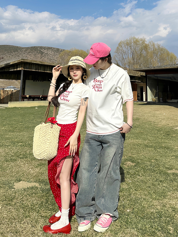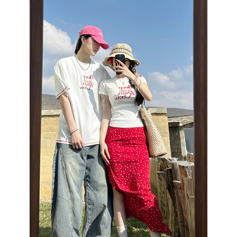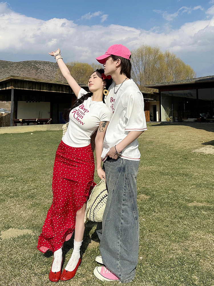 2025 년 여름 커플 반팔 편지 티셔츠 폴로 도트 스커트 캐주얼 세트스토어 가기