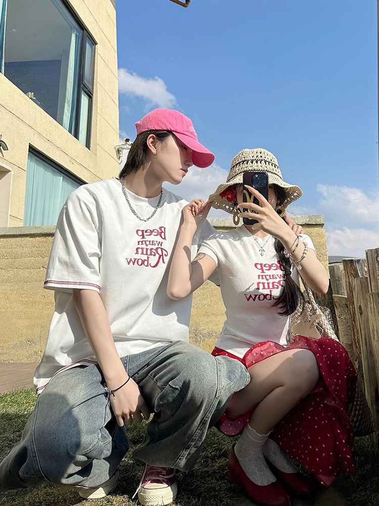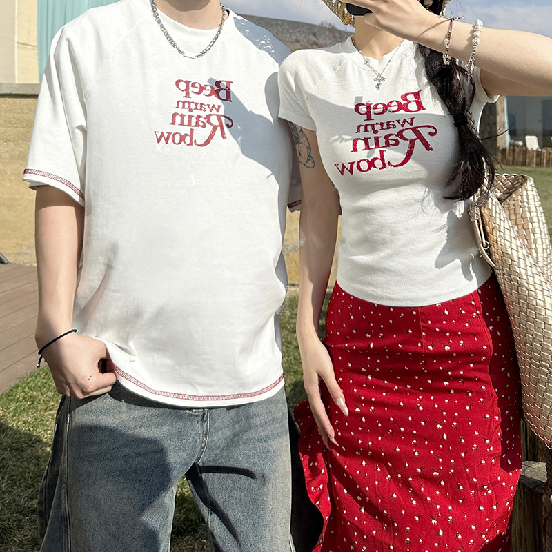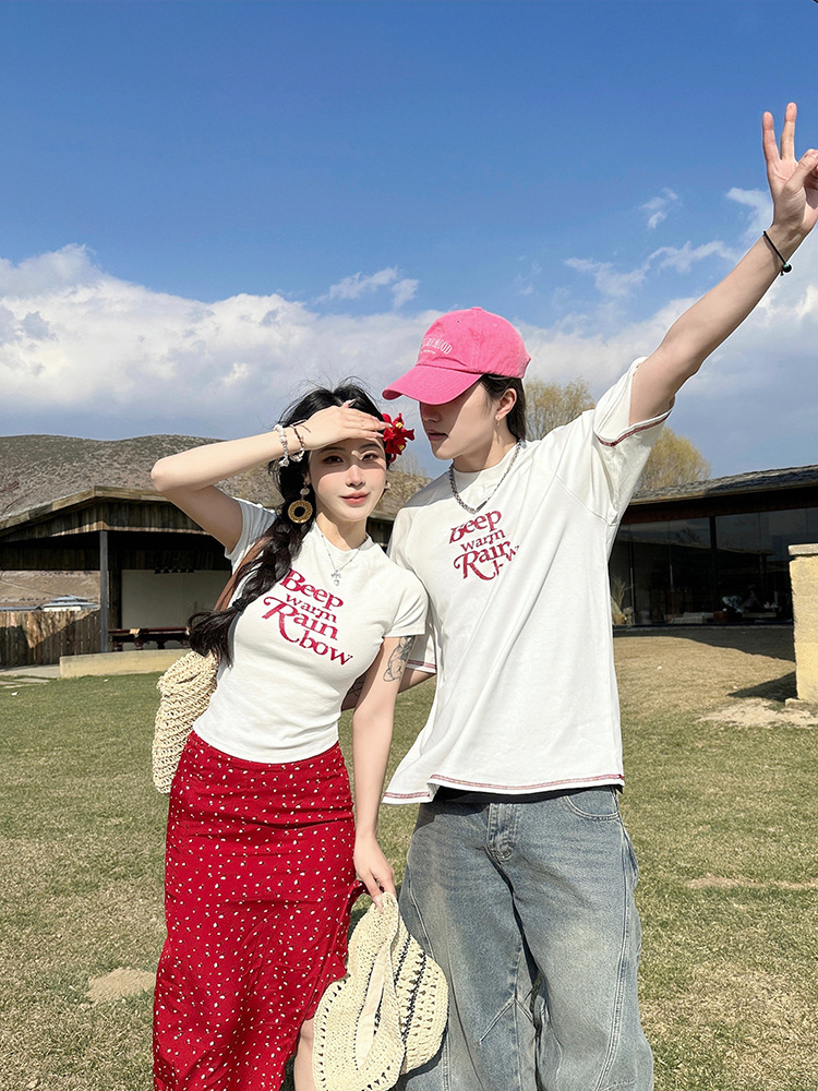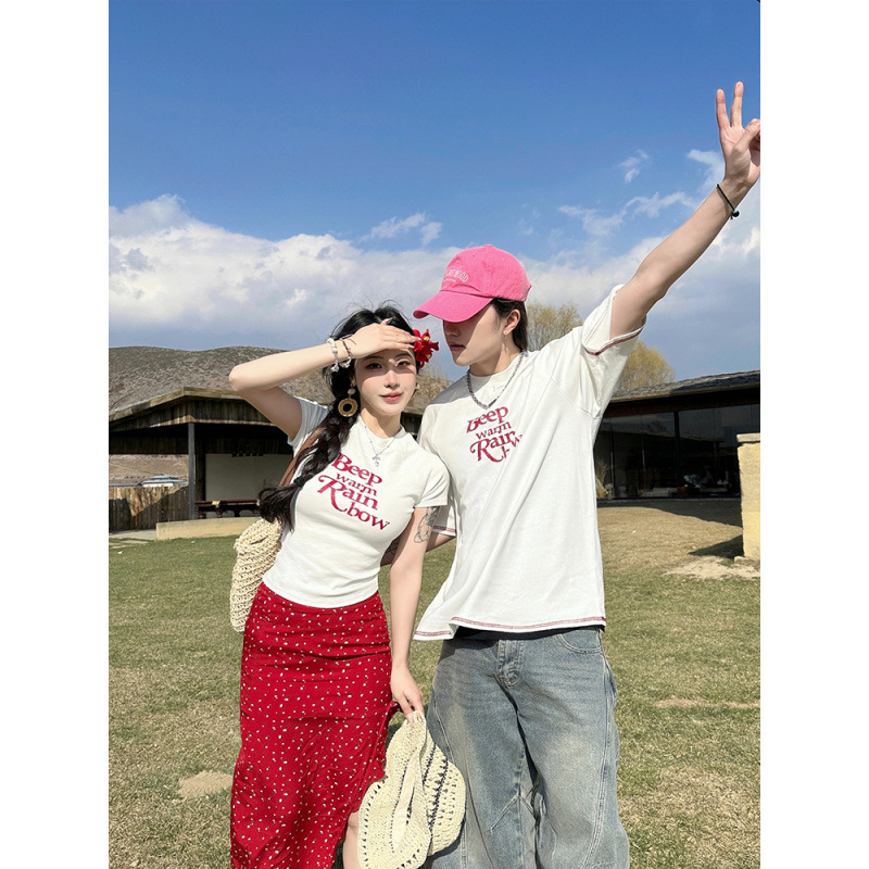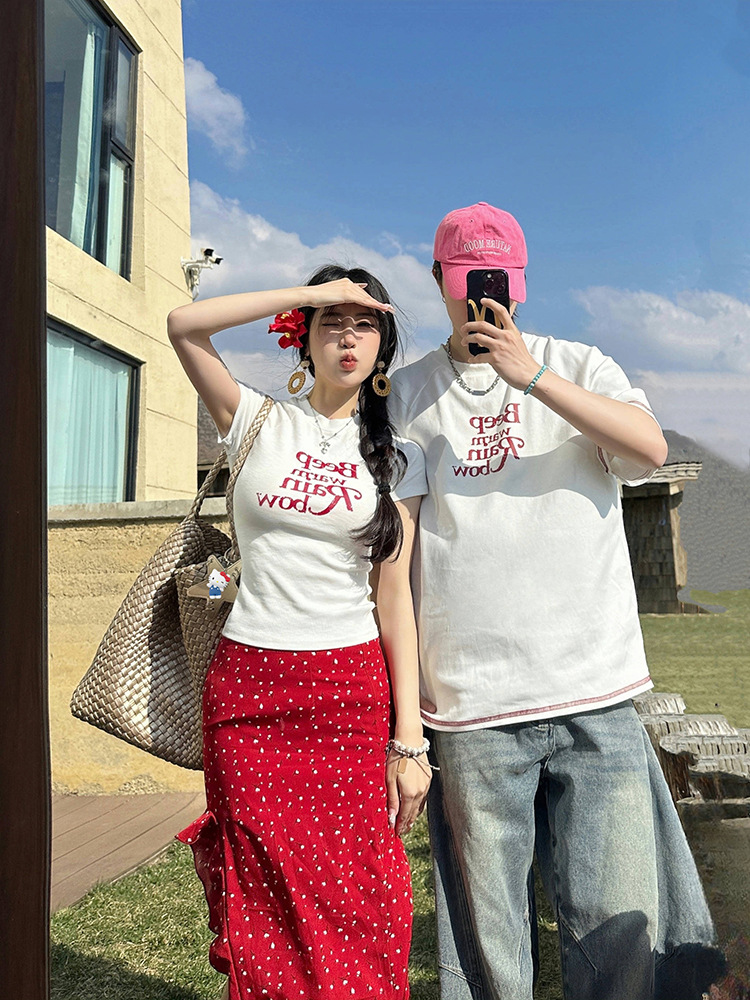 2025 년 여름 커플 반팔 편지 티셔츠 폴로 도트 스커트 캐주얼 세트스토어 가기