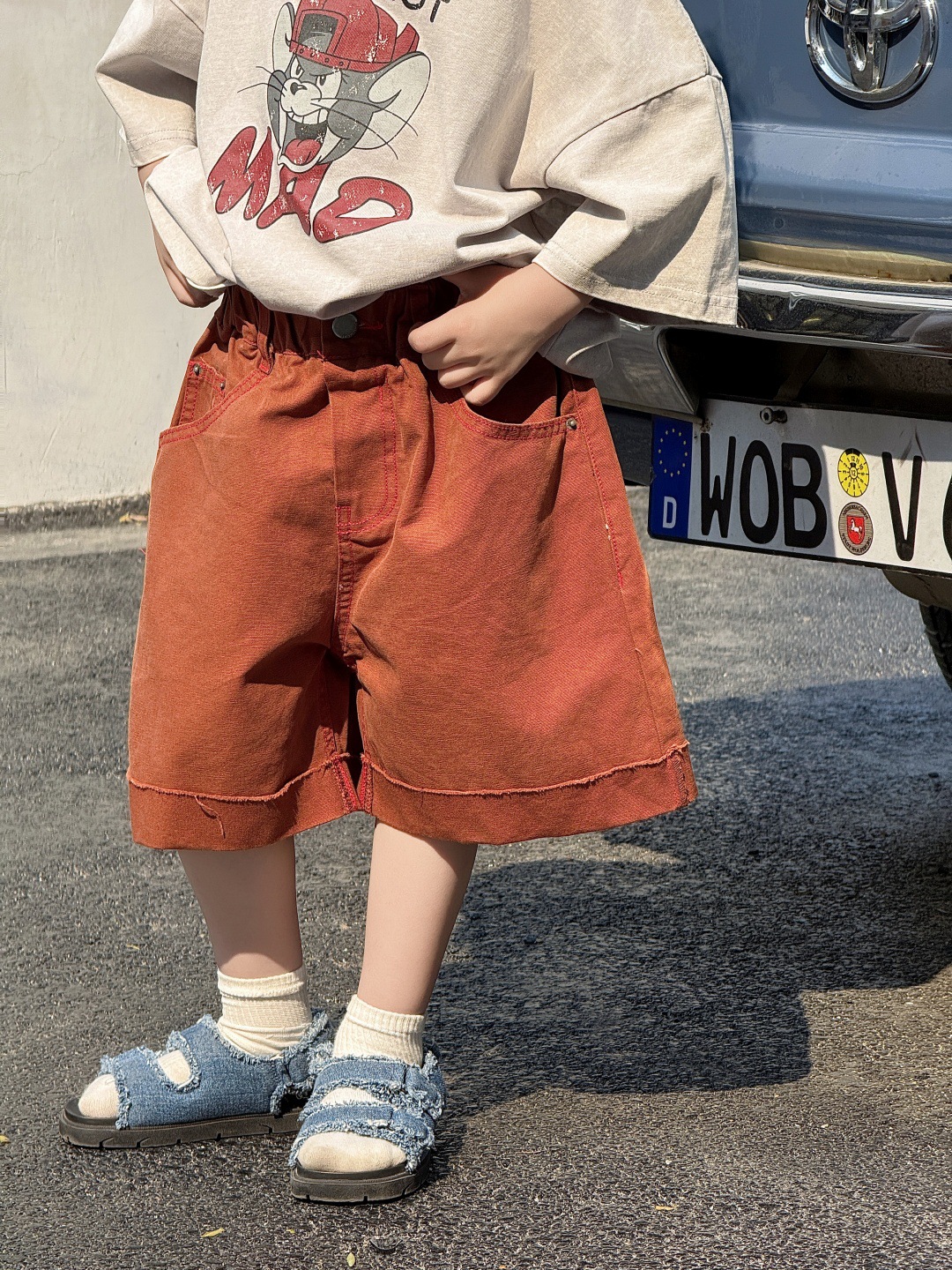 2025 년 여름 새 소년 반바지 미국 스타일 하이 스트리트 루즈 바지 중공업 수놓은 소년의 밝은 색상 트렌디