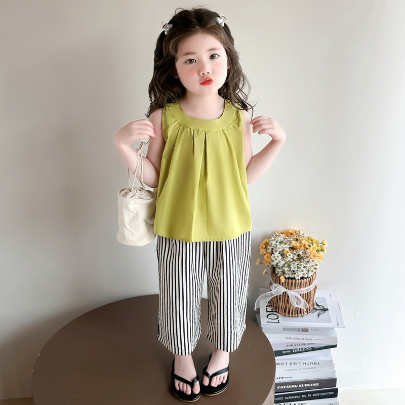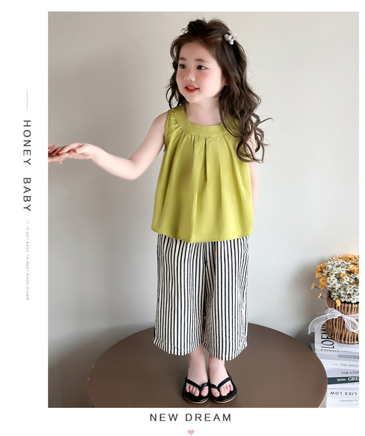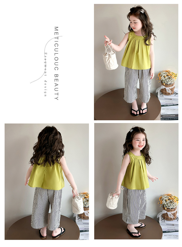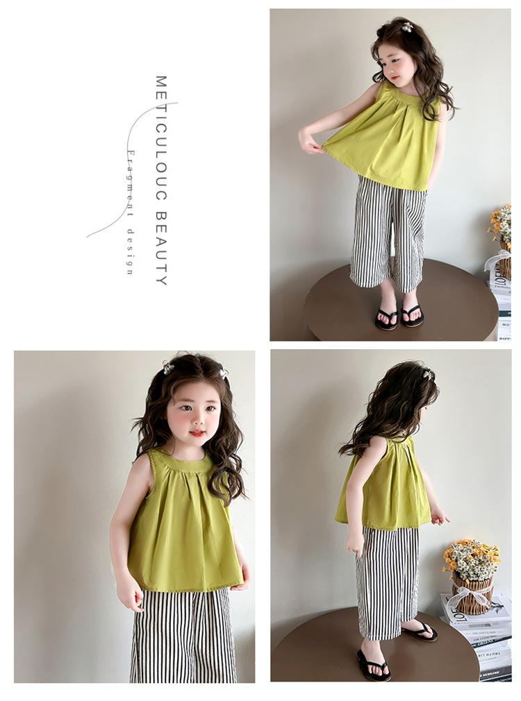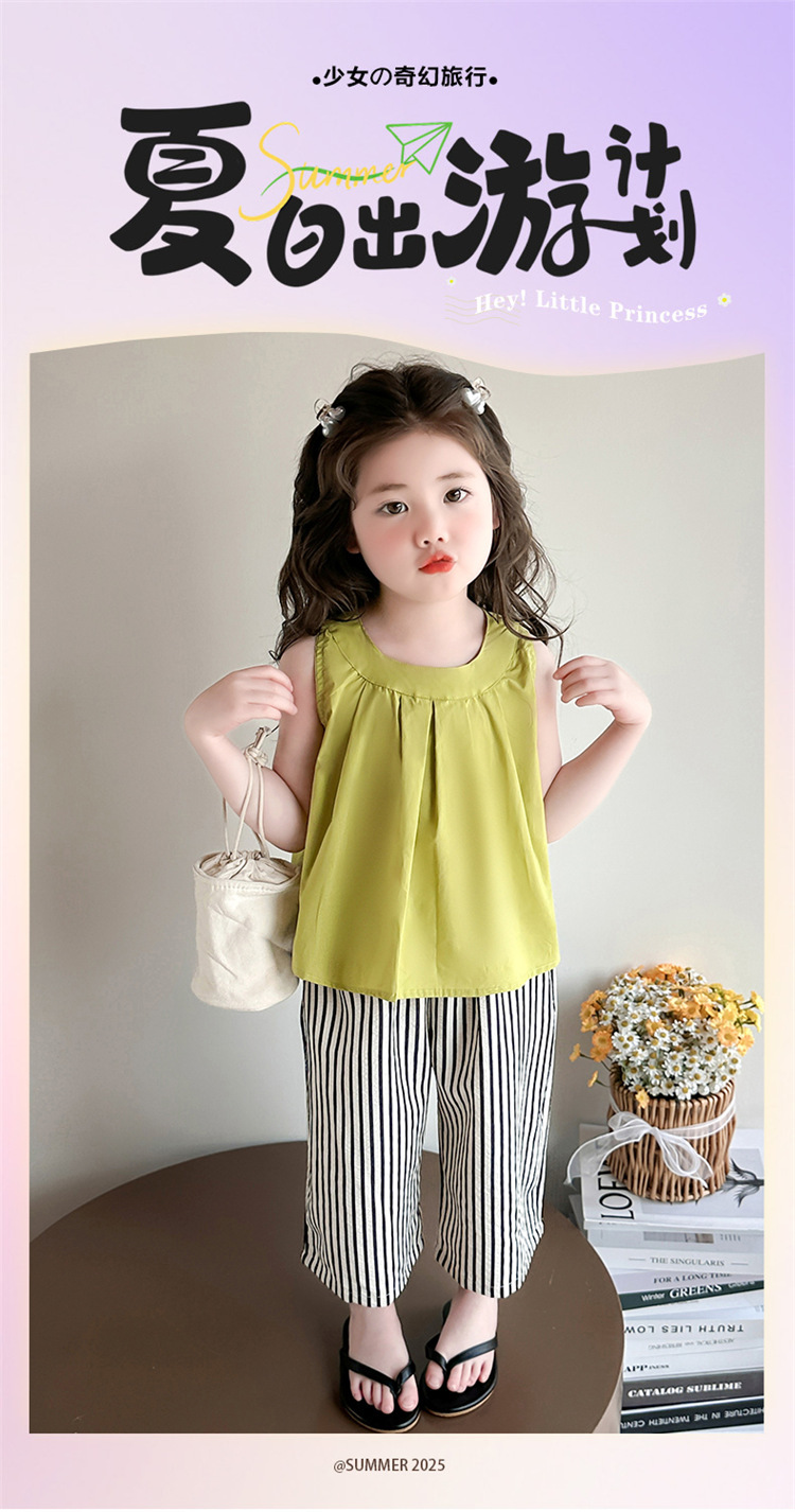 소녀 수직 줄무늬 넓은 다리 바지 세트 2025 여름 새로운 패션 소녀 세련된 투피스 어린이 여름 원피스