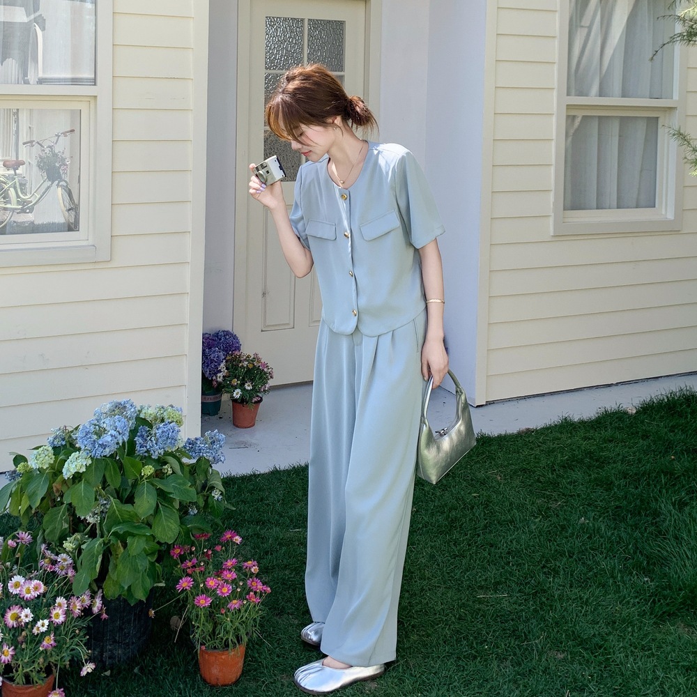 리얼 샷 블루 프랑스 라이트 성숙한 패션 세트 2025 새로운 통근 하이 허리 슬림 세트 넓은 다리 바지 투피스 세트