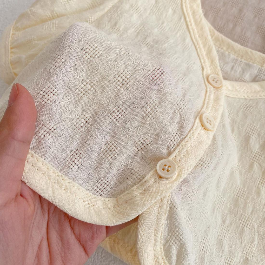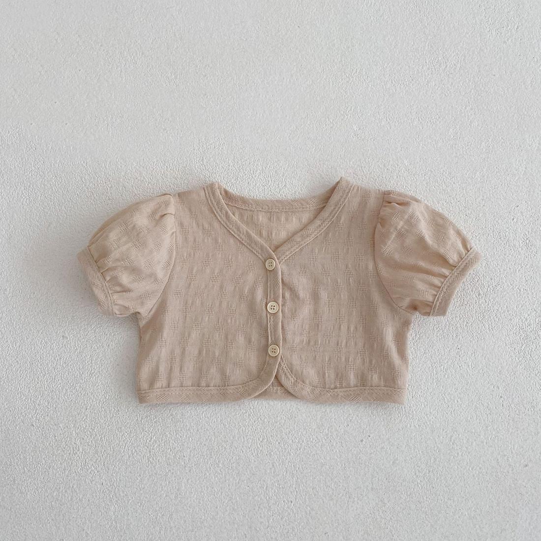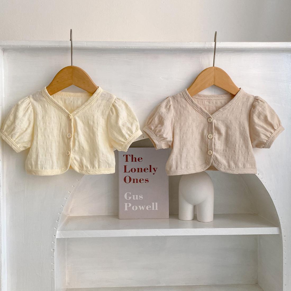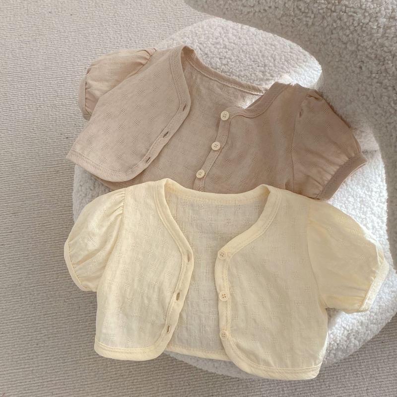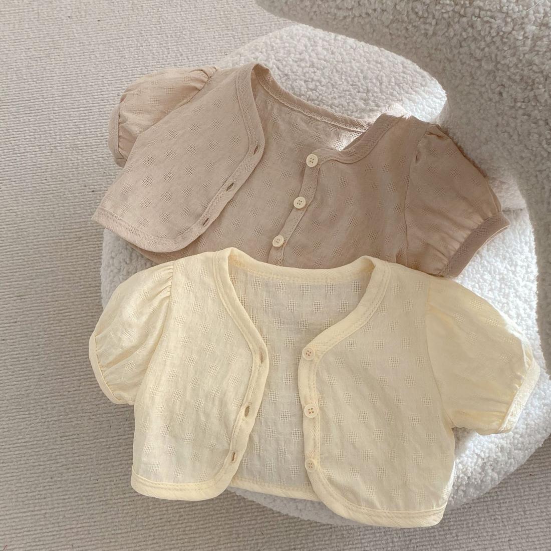아기의 반팔 재킷 여름 얇은 소녀의 아기의 단색 자카드 퍼프 소매 작은 카디건 서양식 짧은 에어컨 옷스토어 가기