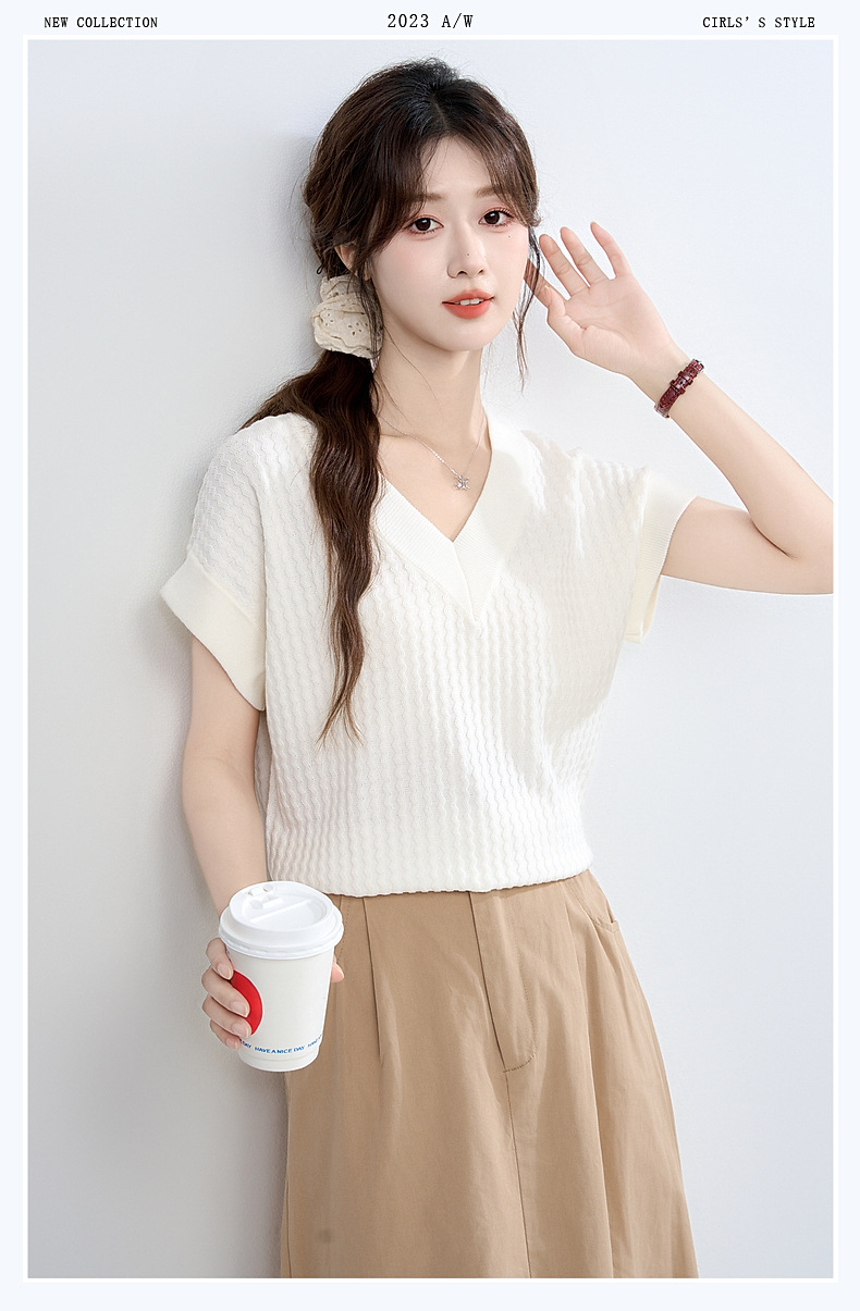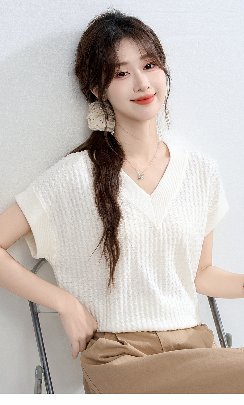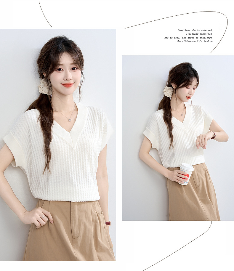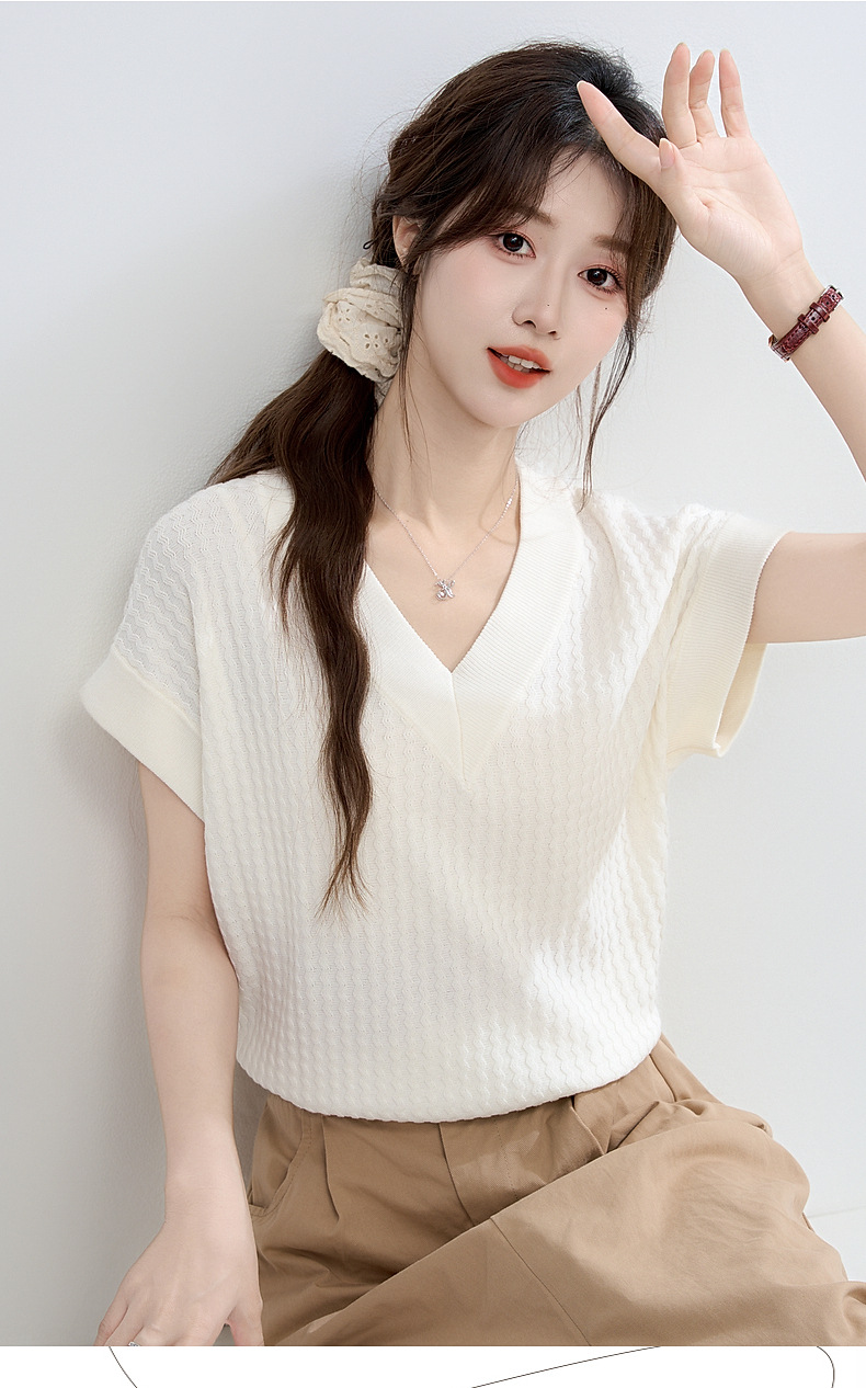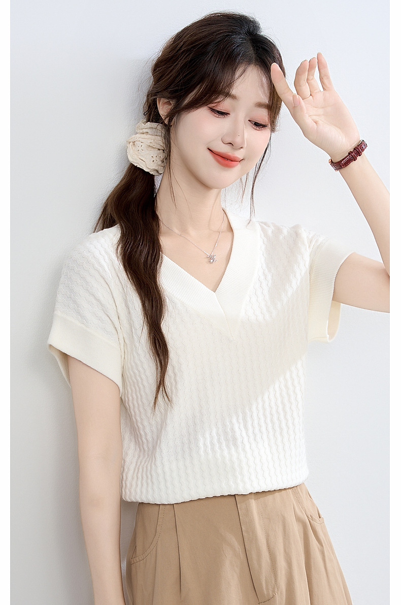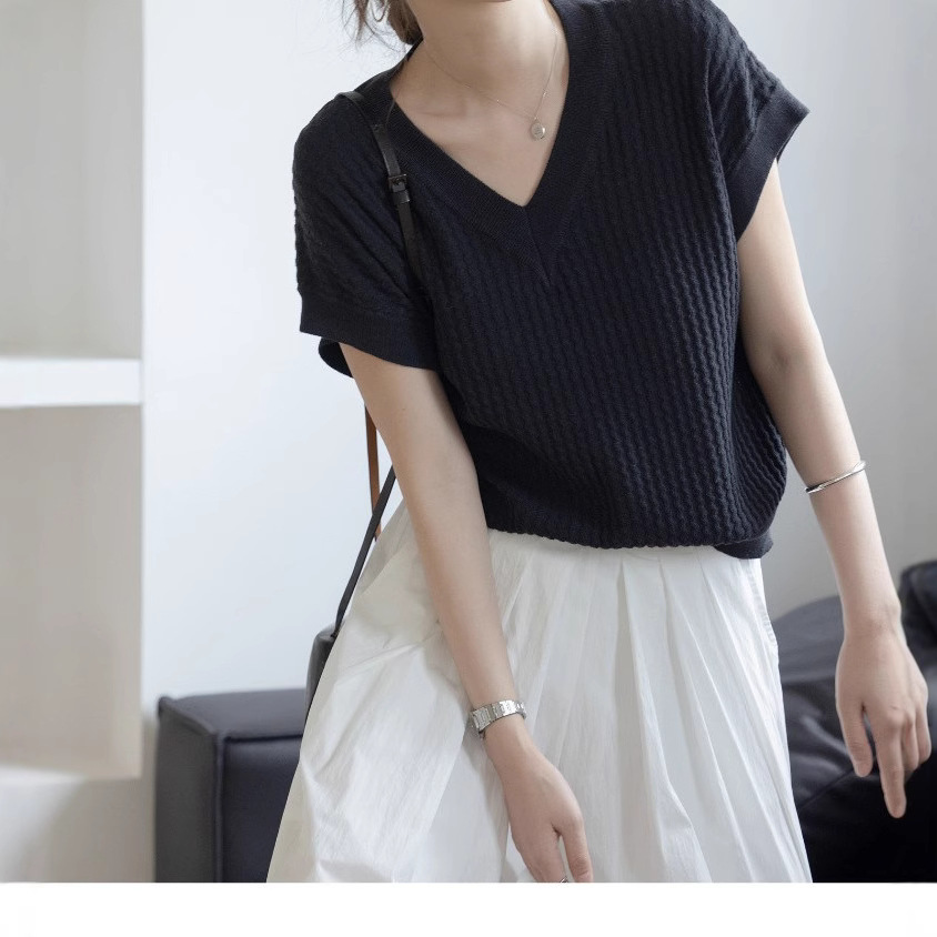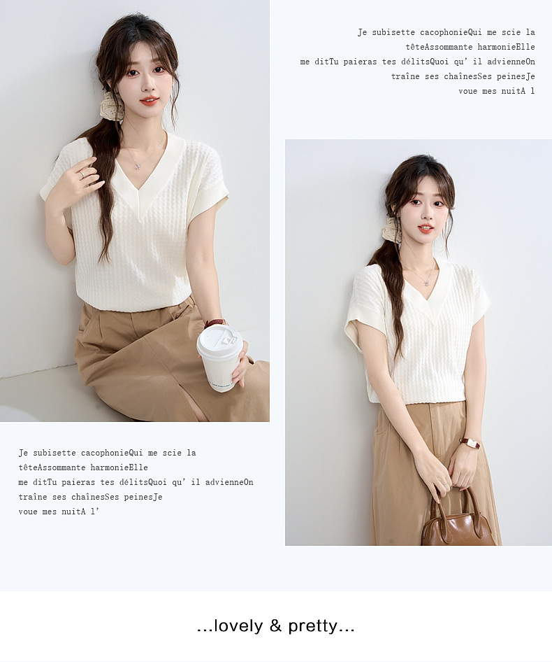 2025 여성용 다용도 봄 여름 신상 프렌치 브이넥 니트 반팔 티셔츠, 루즈하고 슬림하며 활용도가 높은 질감의 탑스토어 가기