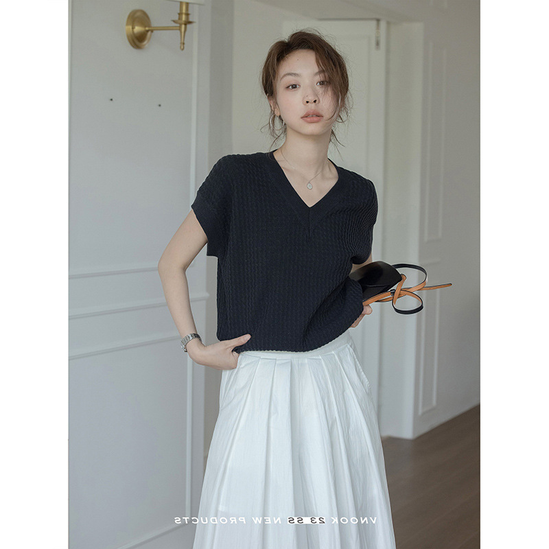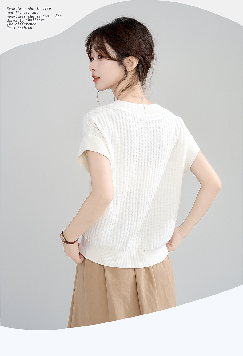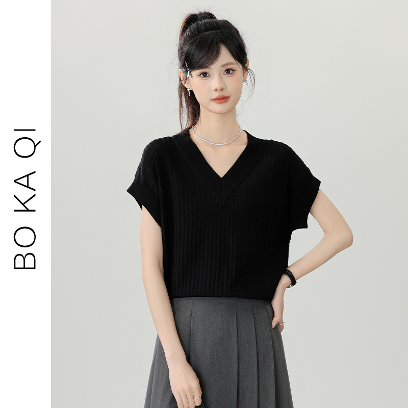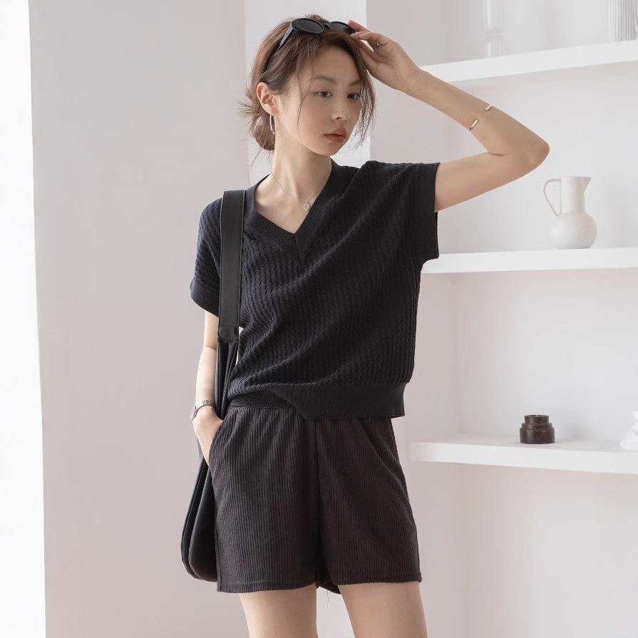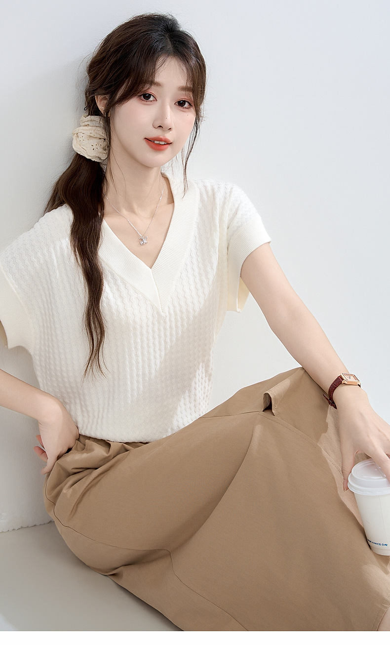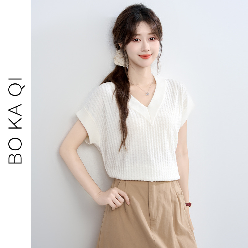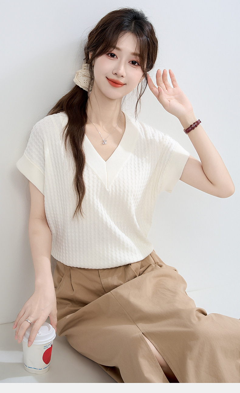 2025 여성용 다용도 봄 여름 신상 프렌치 브이넥 니트 반팔 티셔츠, 루즈하고 슬림하며 활용도가 높은 질감의 탑스토어 가기