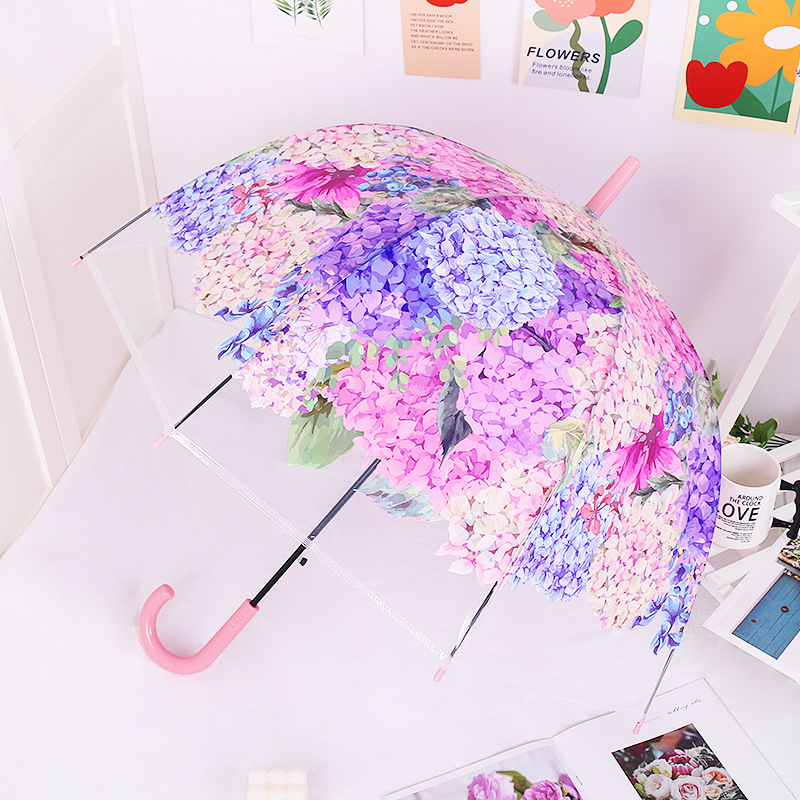 긴 손잡이 플라스틱 투명 수국 우산 소녀용 고급스러운 스타일 신선한 숲 스타일 학생 어린이 공연 도매