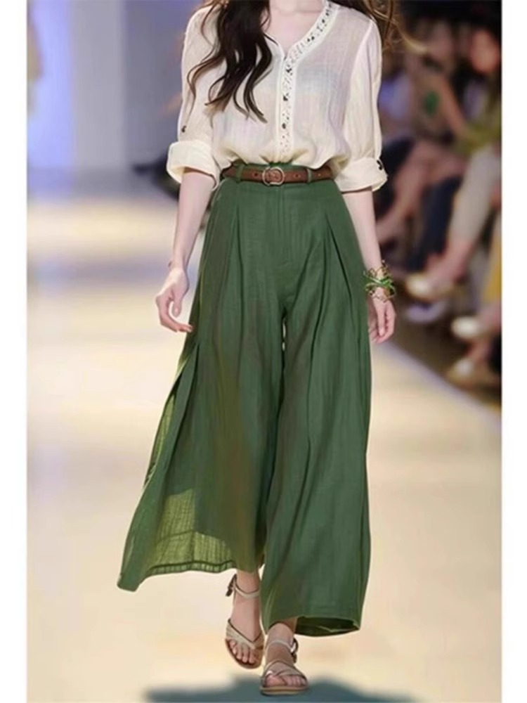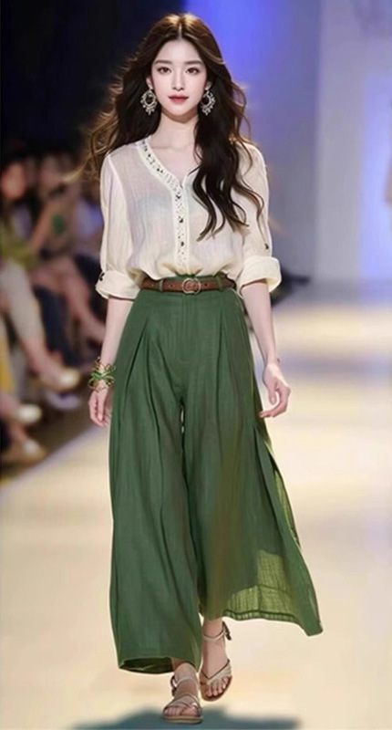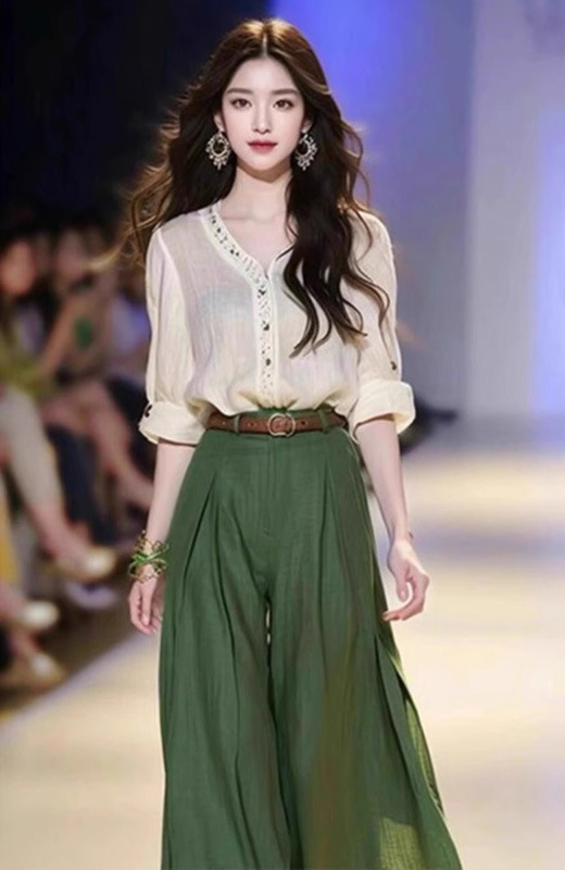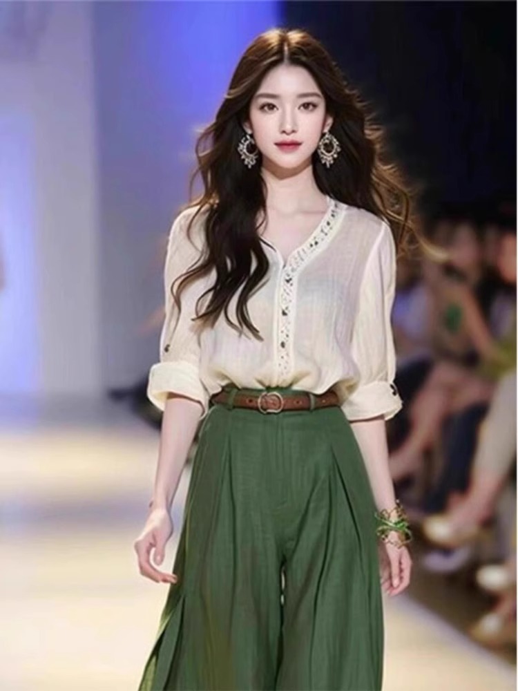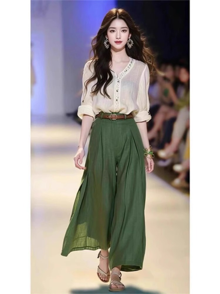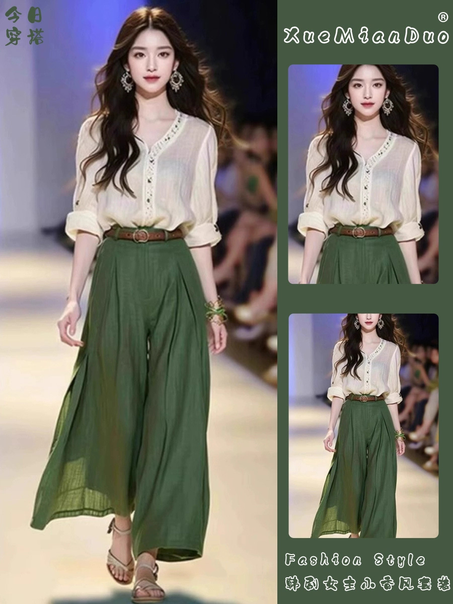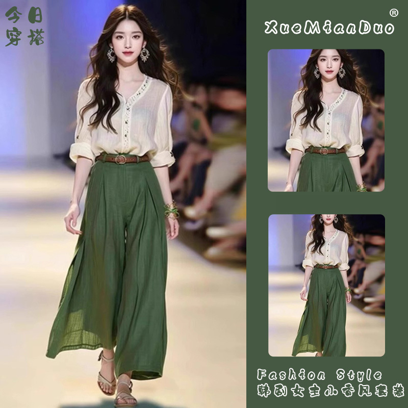 여름 새로운 트렌디 세련된 패션 나이를 줄이는 셔츠 여성 패션 디자인 센스 캐주얼 올 매치 와이드 레그 팬츠 투피스 세트스토어 가기
