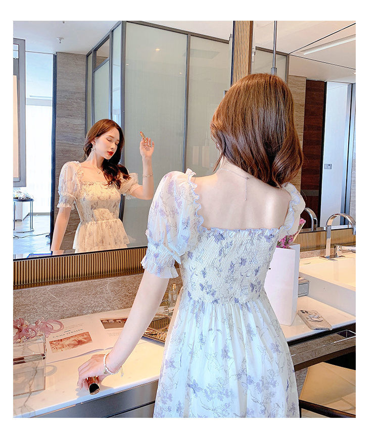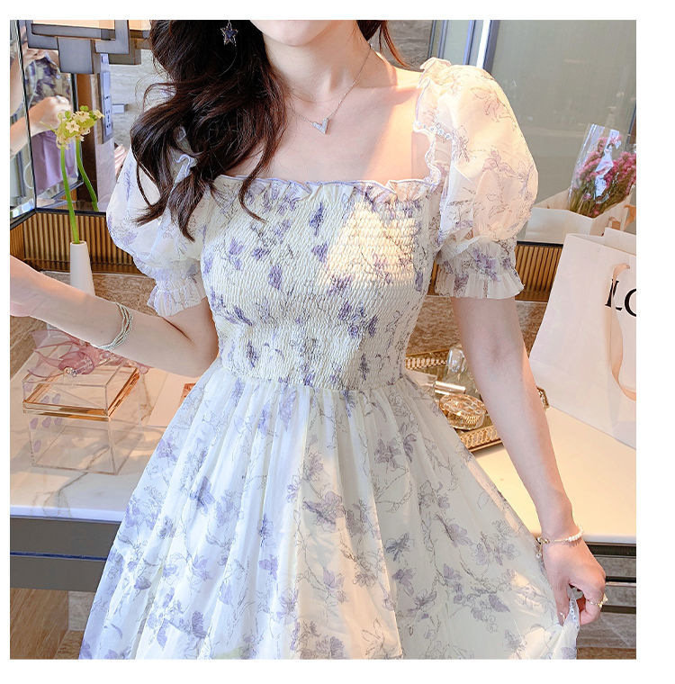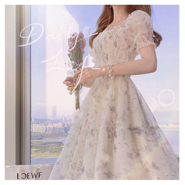 스퀘어 칼라 프랑스 원피스 여성 2025 년 여름 새 퍼프 소매 허리 슬리밍 우아한 부드러운 긴 원피스스토어 가기