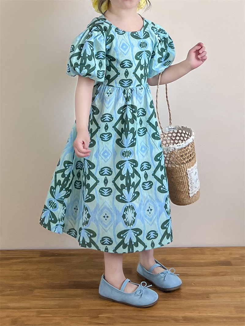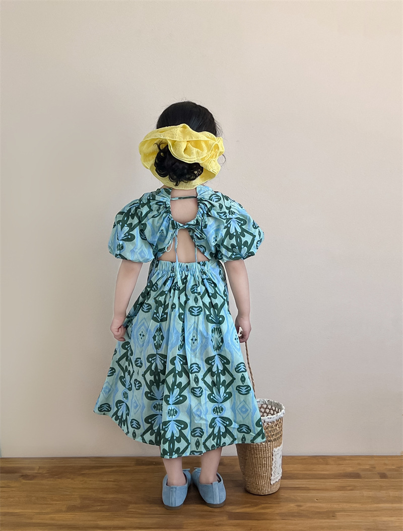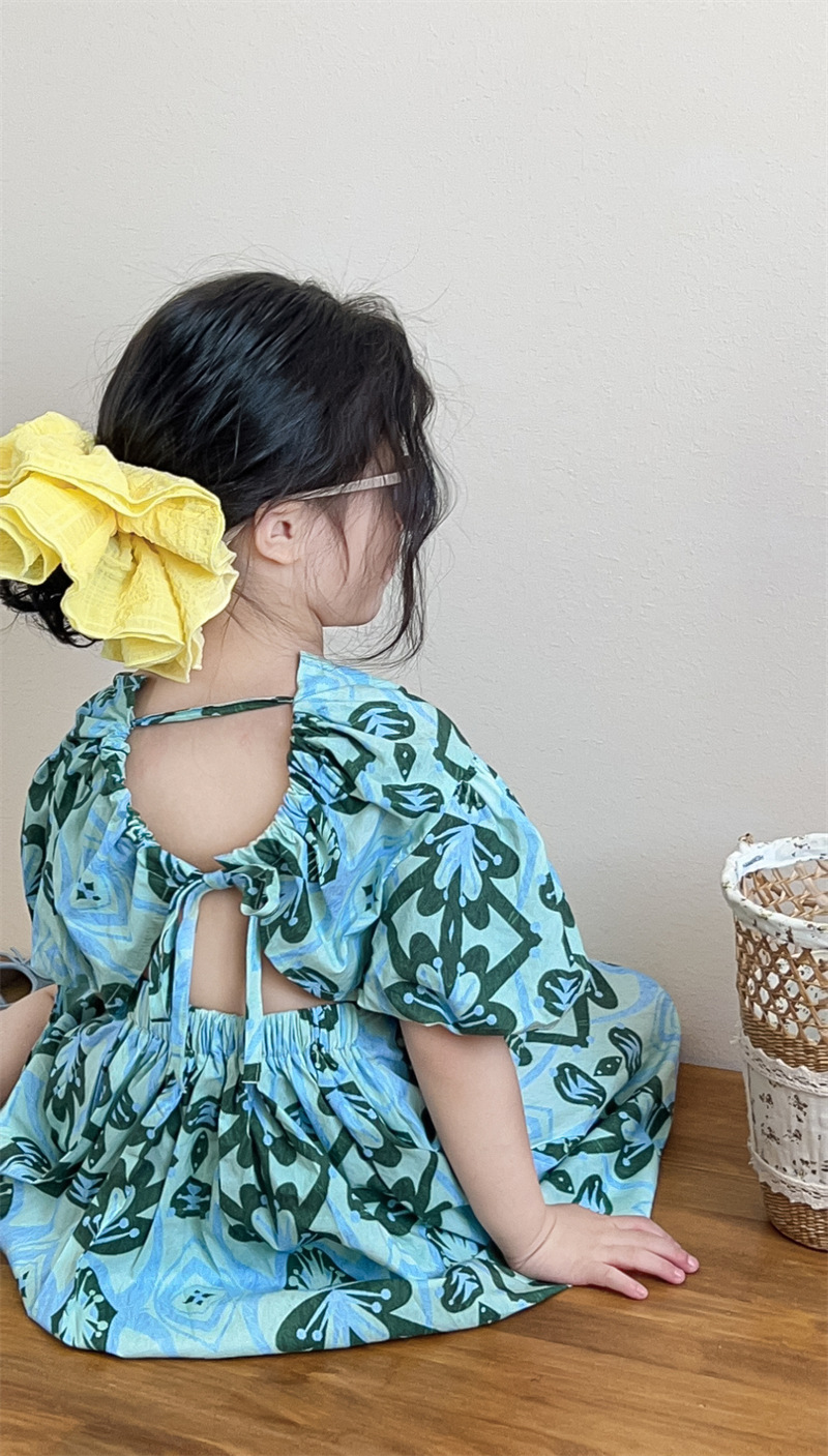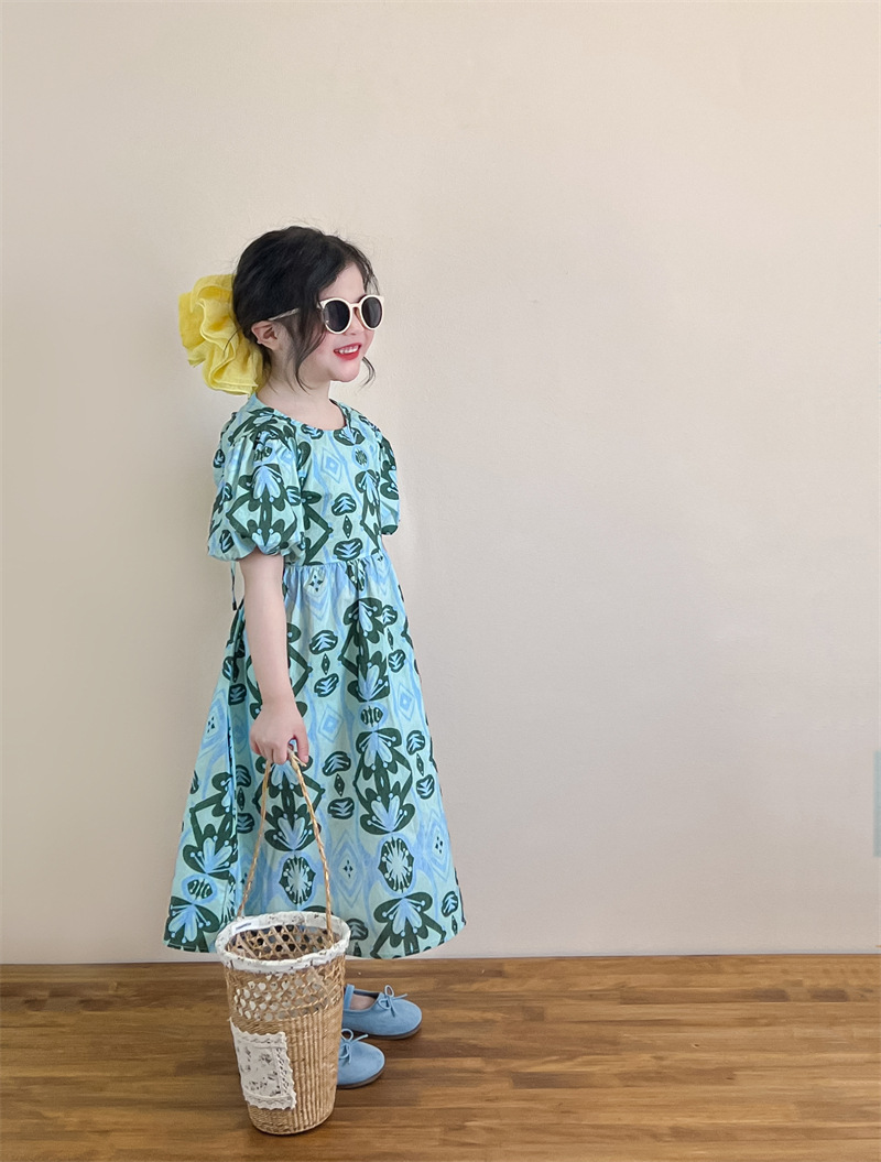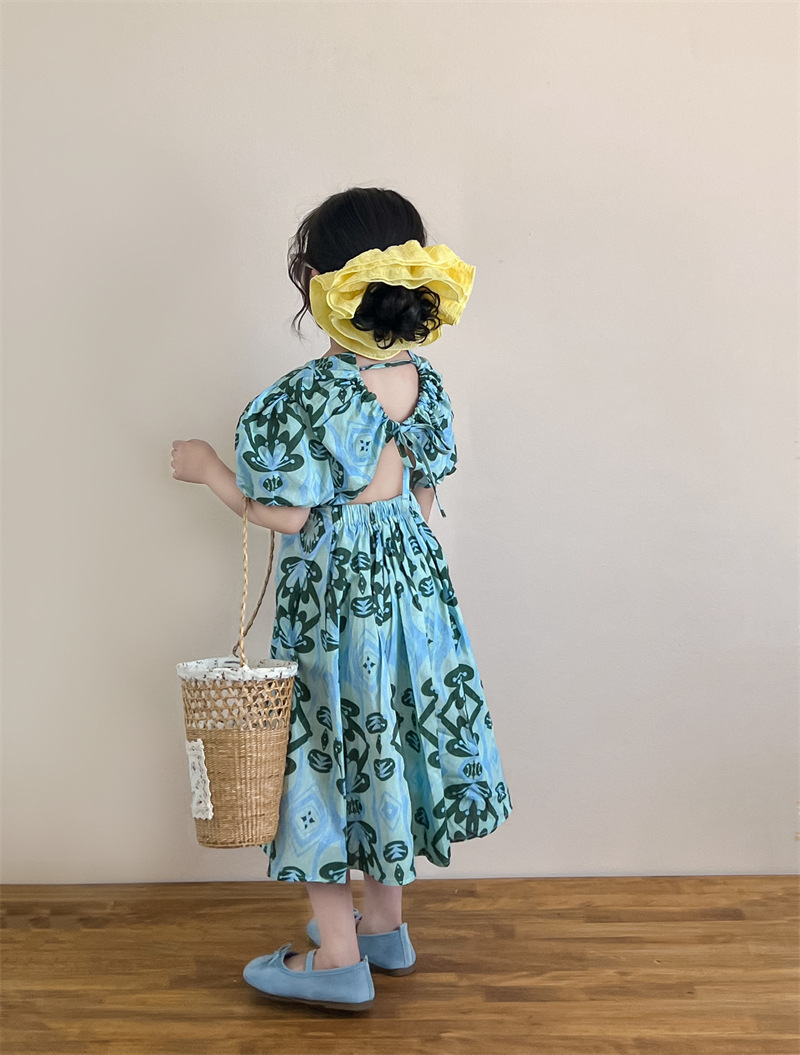 목가적 인 스타일 소녀의 여름 다시 넥타이 전체 인쇄 된 푸른 꽃 퍼프 소매 원피스 해변 원피스