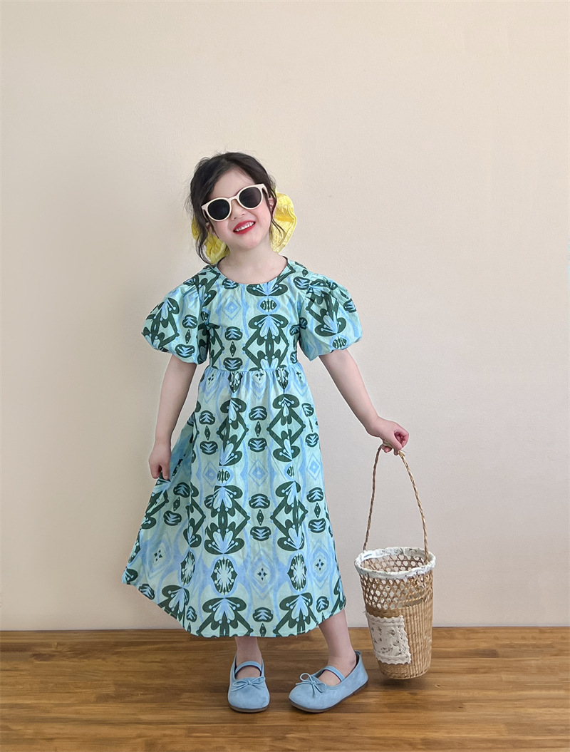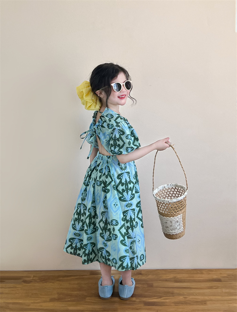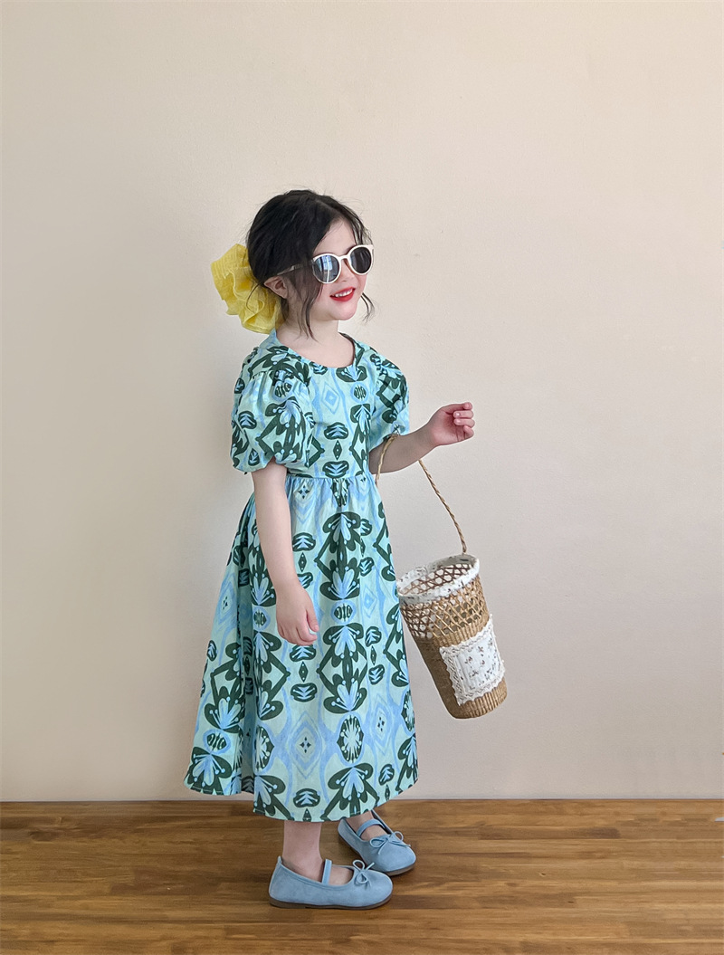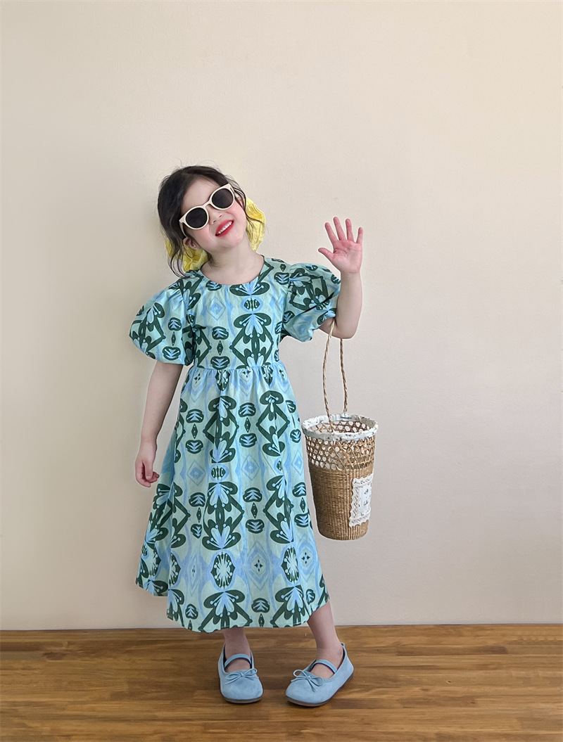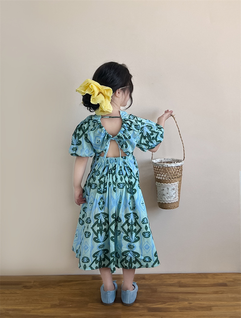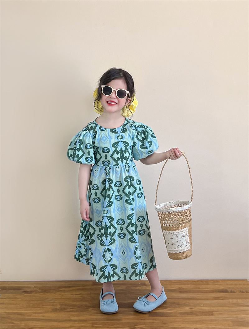 목가적 인 스타일 소녀의 여름 다시 넥타이 전체 인쇄 된 푸른 꽃 퍼프 소매 원피스 해변 원피스