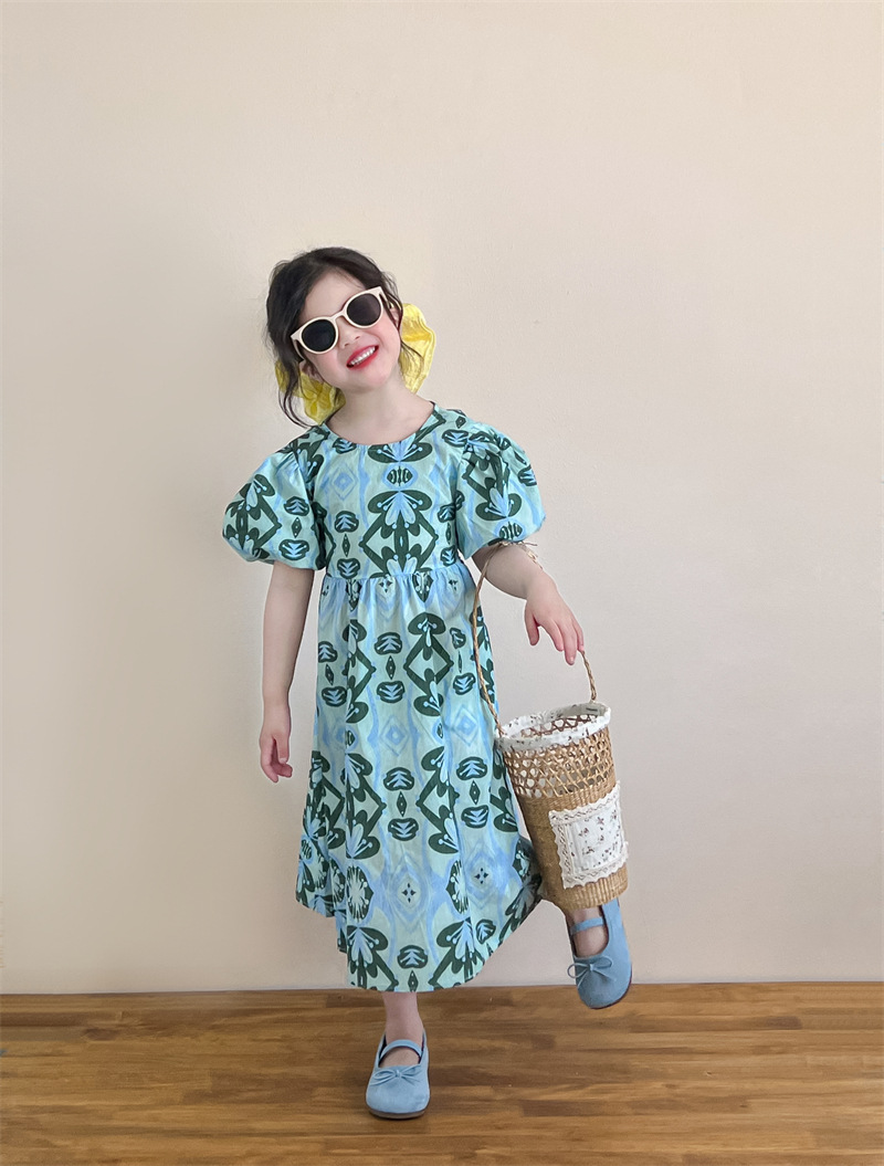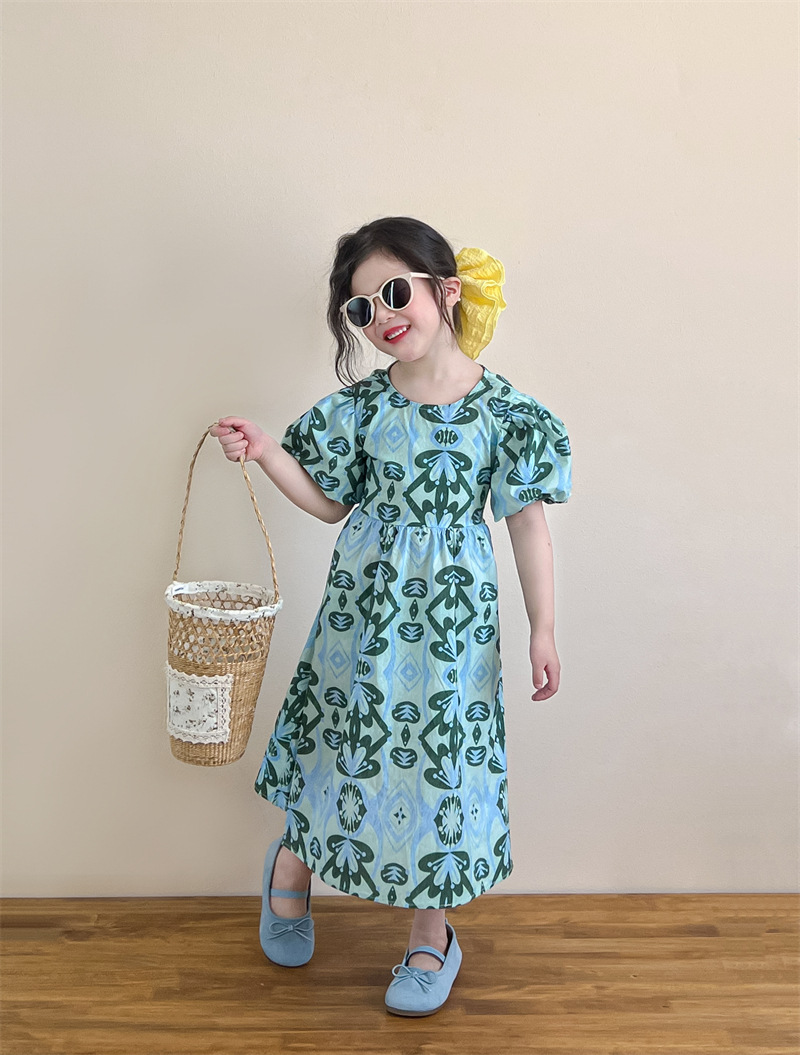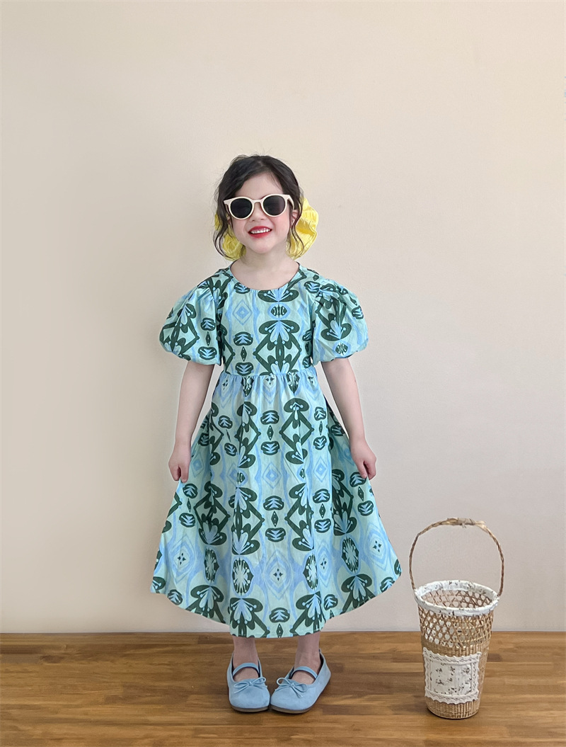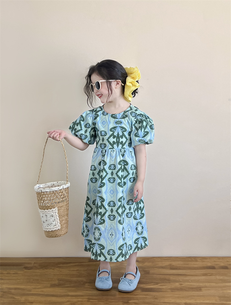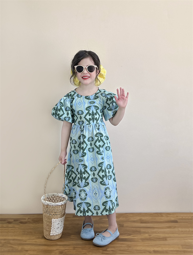 목가적 인 스타일 소녀의 여름 다시 넥타이 전체 인쇄 된 푸른 꽃 퍼프 소매 원피스 해변 원피스