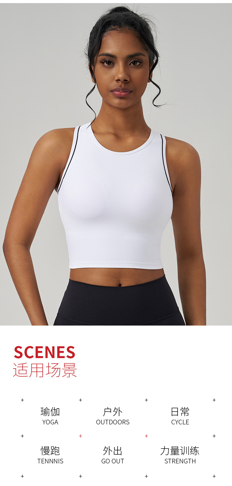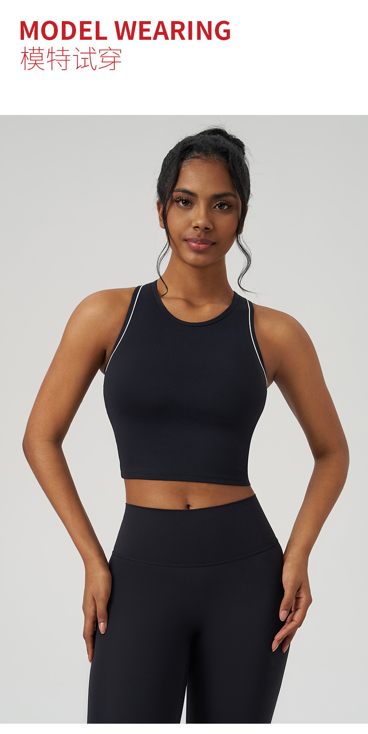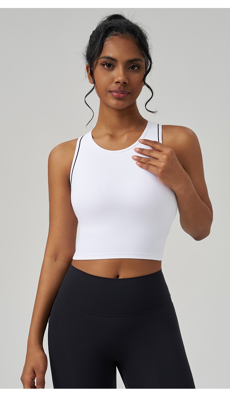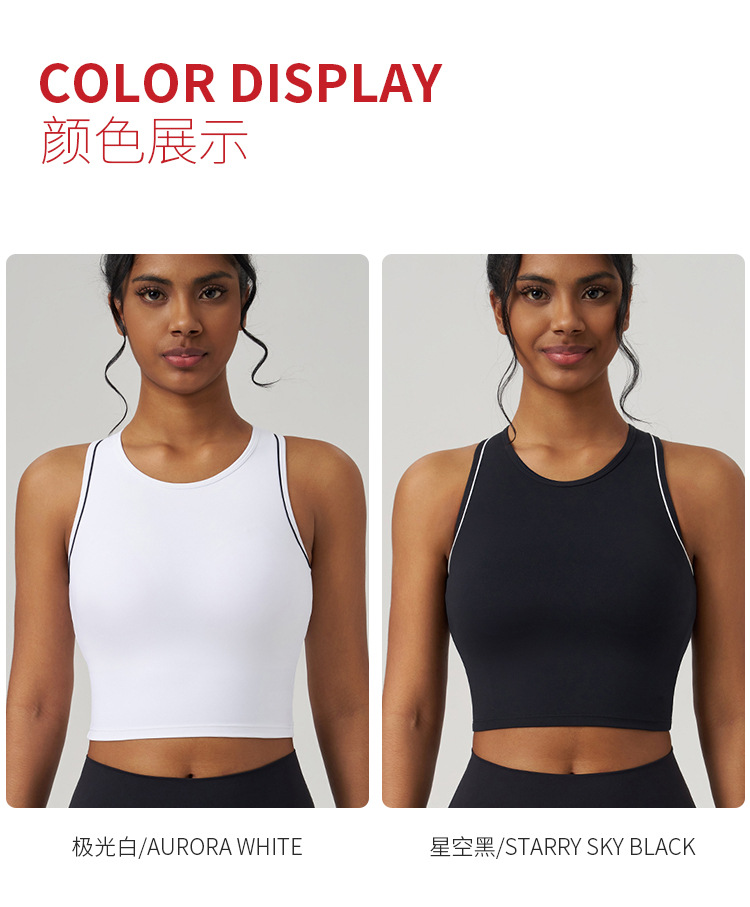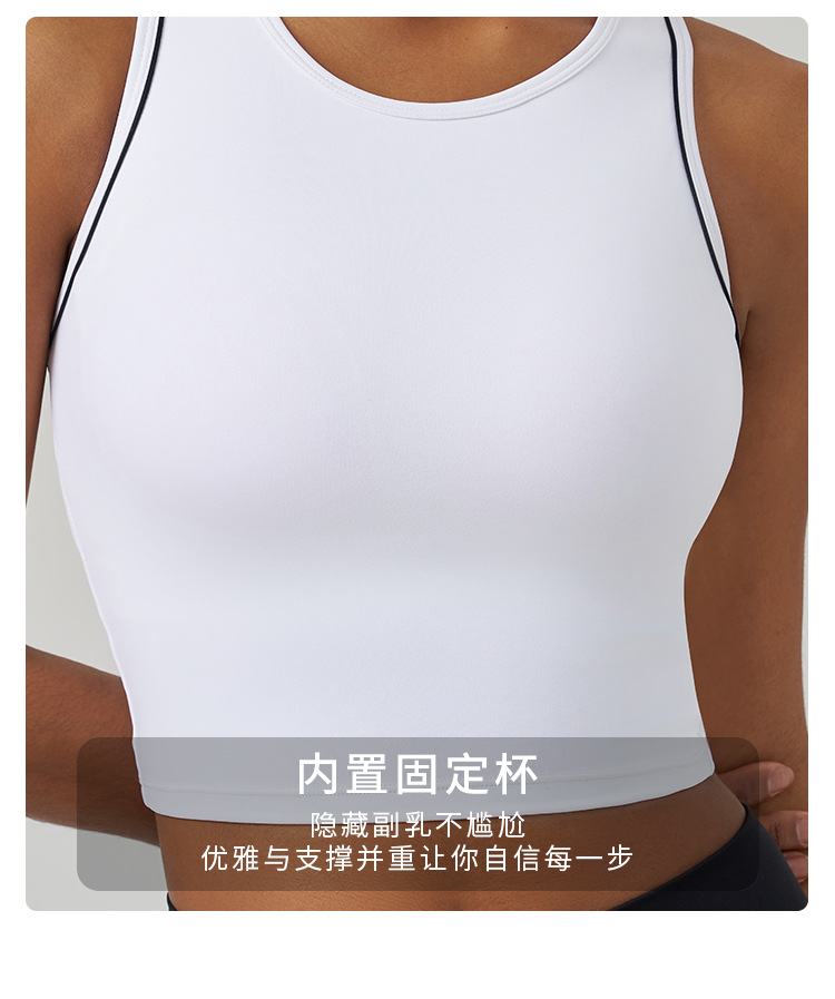 흉부 패드 충격과 통합 된 와튼 타이트 요가 조끼 I 자형 백 라운드 넥 컬러 매칭 아우터 피트니스 조끼