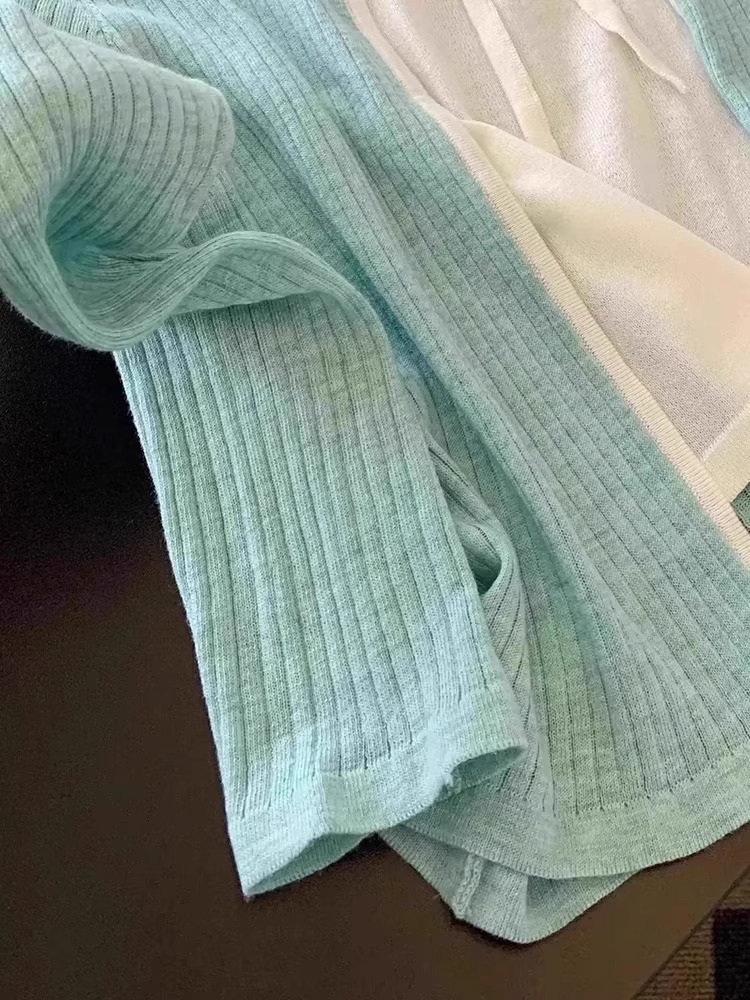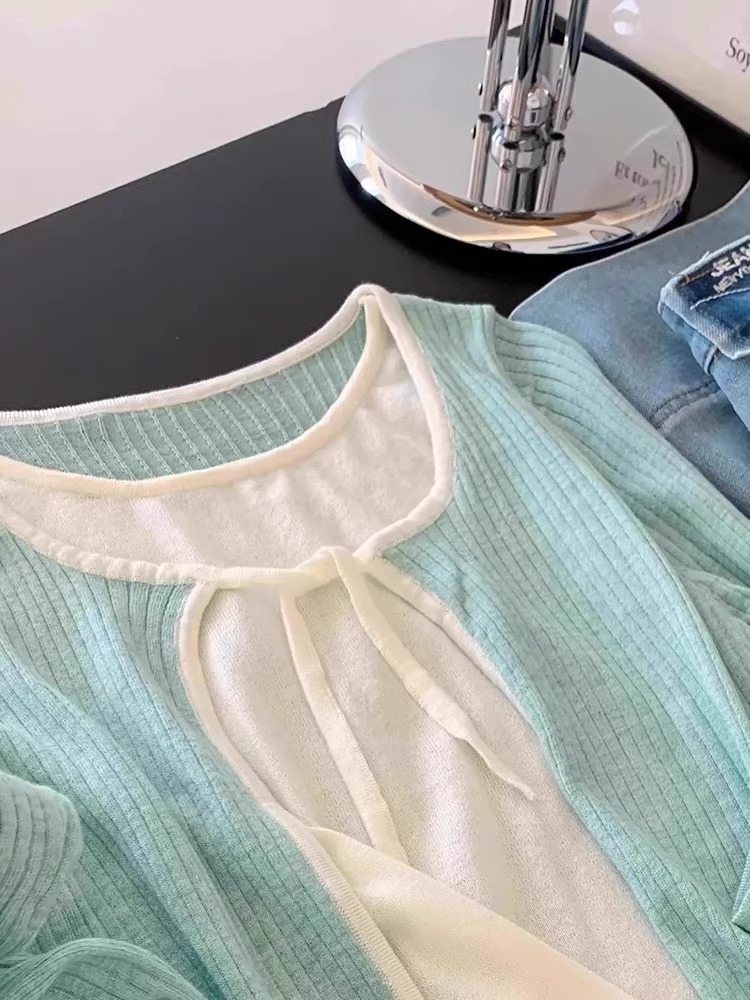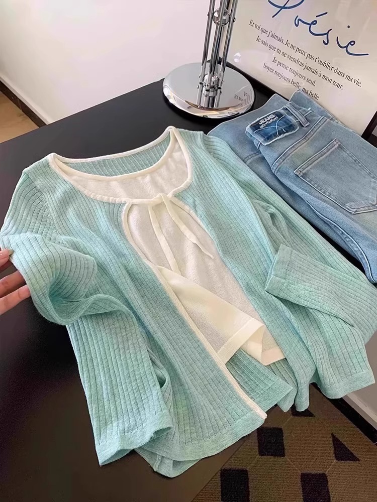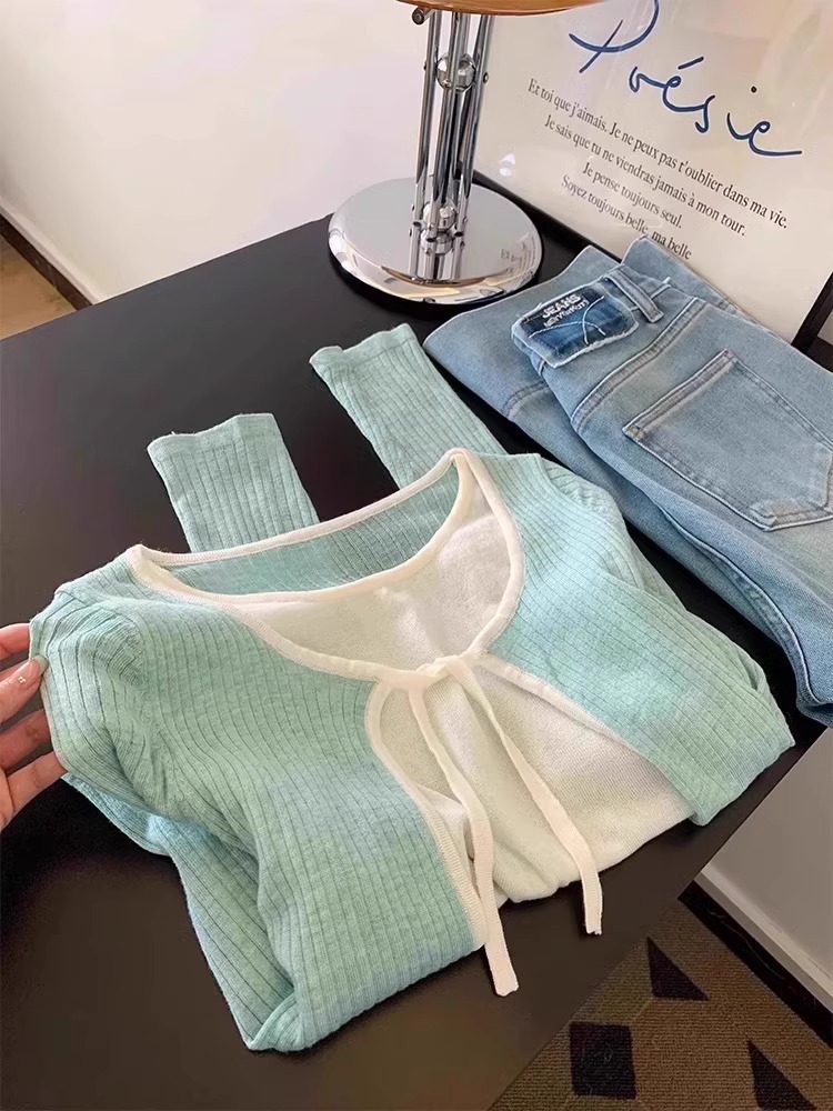 작은 신선한 녹색 봄 착용 톱 한국 스타일 디자인 센스 부드러운 레이스 업 가짜 투피스 카디건 니트웨어 여성용 의류
