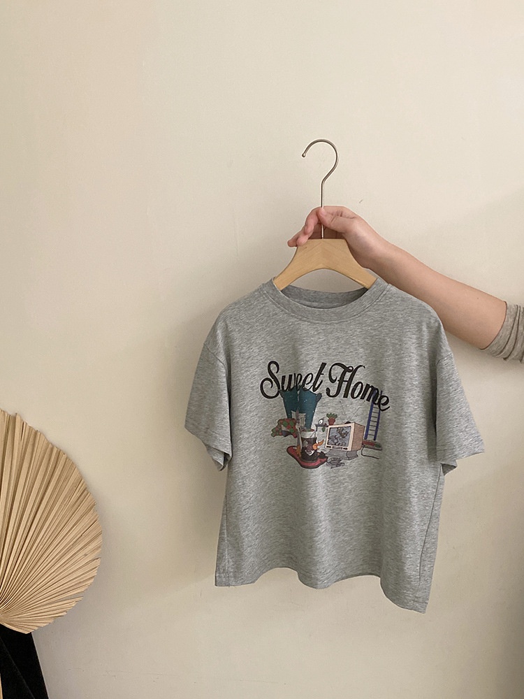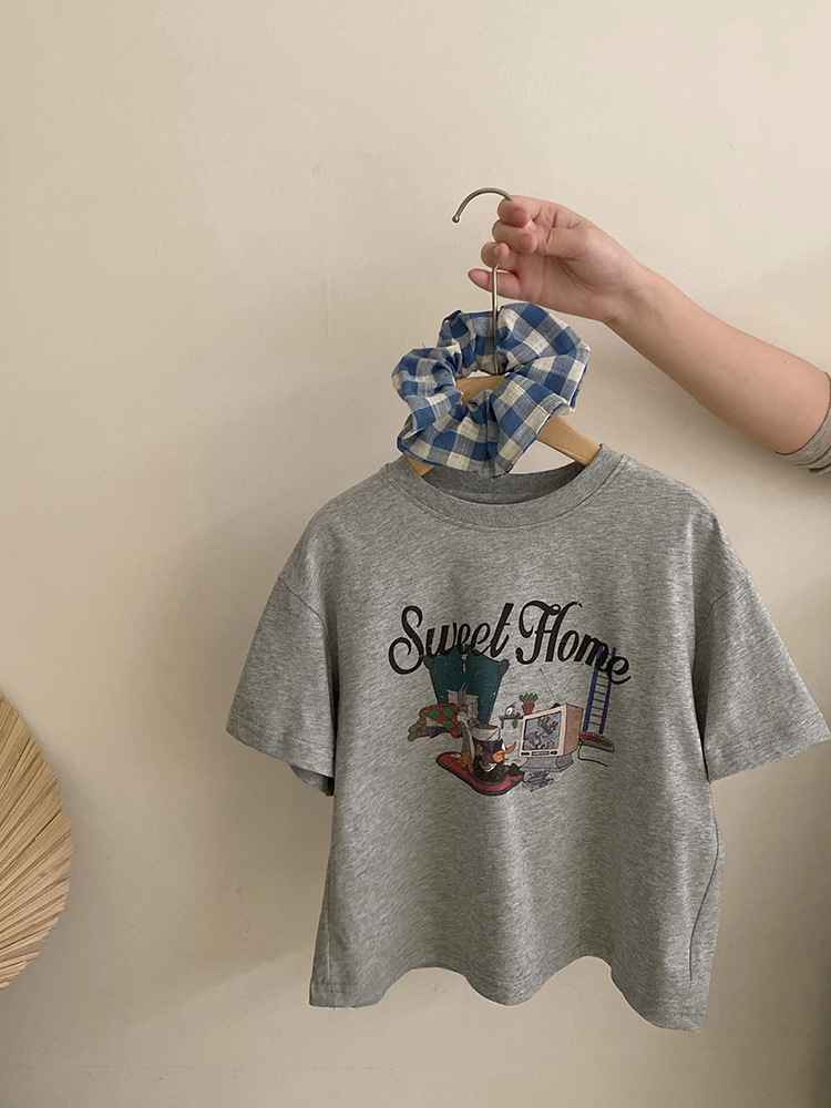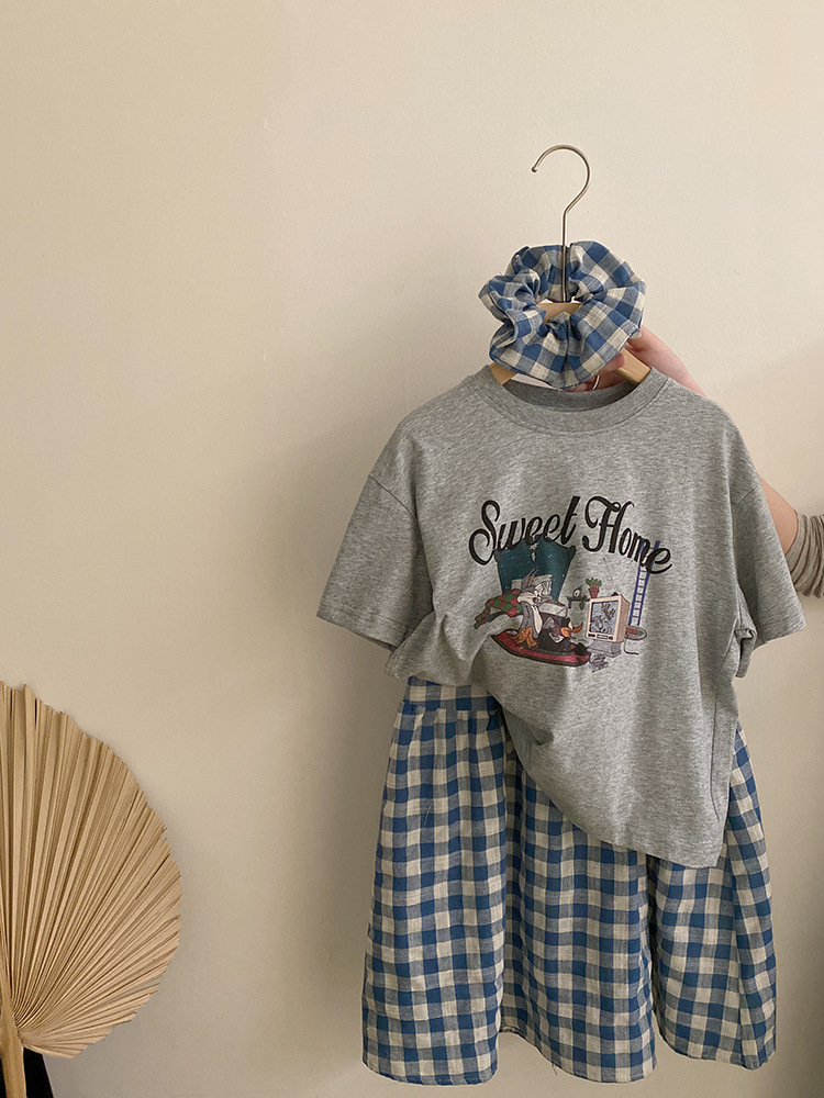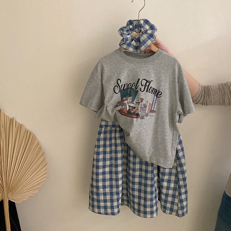 어린이 착용 어린이 여름 캐주얼 루즈 인쇄 만화 새 스타일 탑 반팔 체크 무늬 스커트 유행 투피스 세트스토어 가기