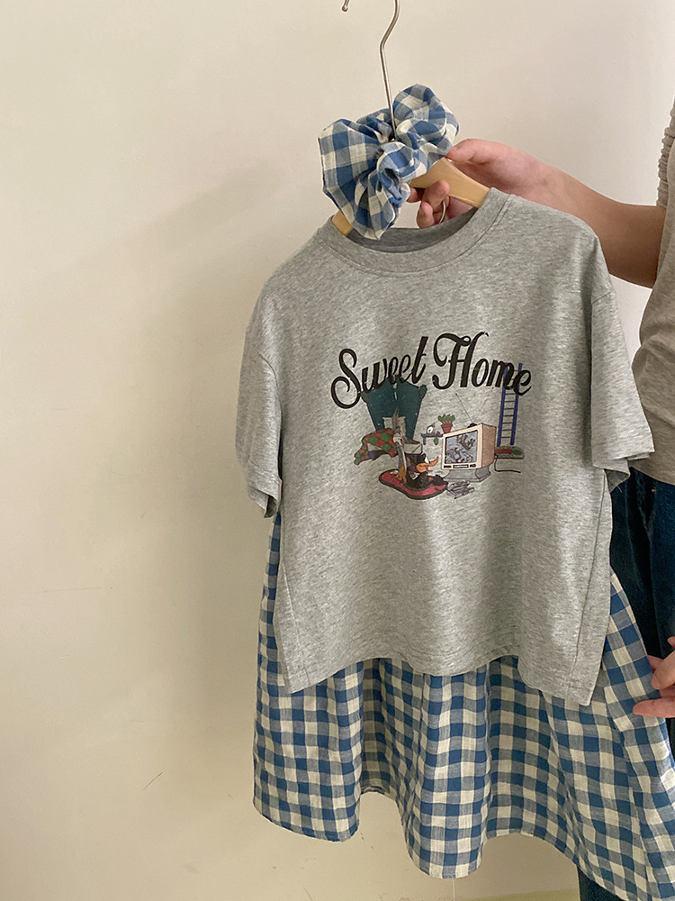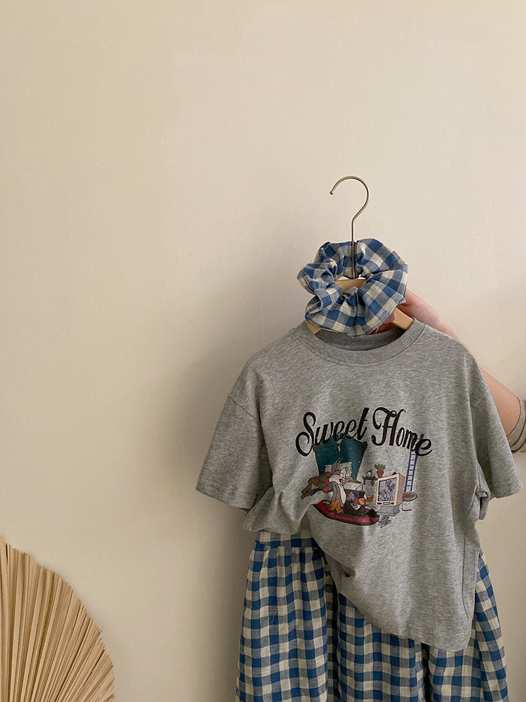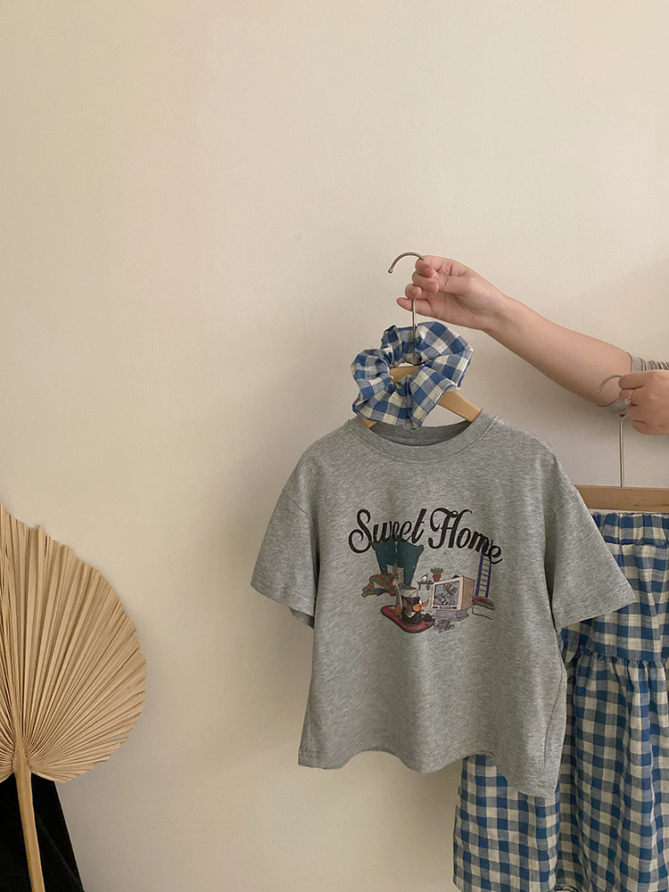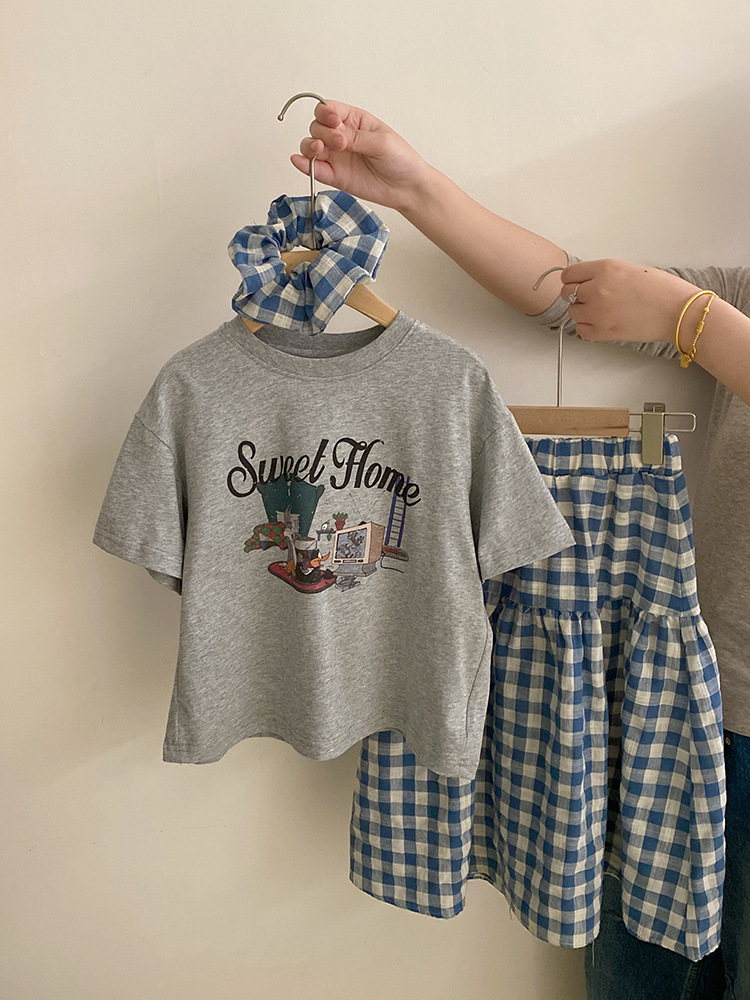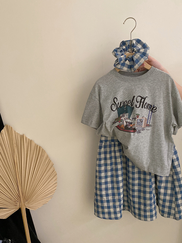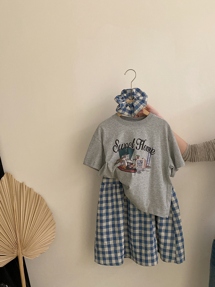 어린이 착용 어린이 여름 캐주얼 루즈 인쇄 만화 새 스타일 탑 반팔 체크 무늬 스커트 유행 투피스 세트