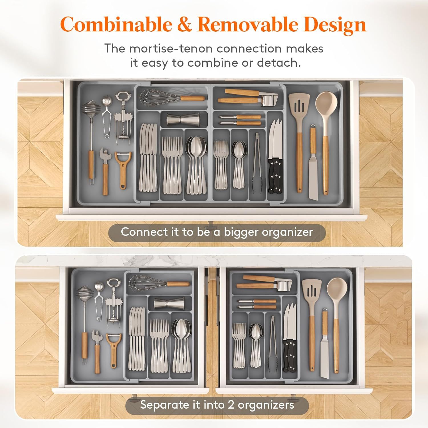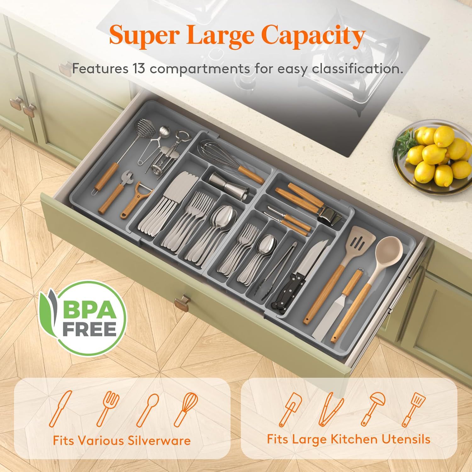 맞춤형 서랍 수납함, 주방 식기 수납함, 대형 양면 확장형 플라스틱 박스, 숟가락, 포크, 나이프에 적합