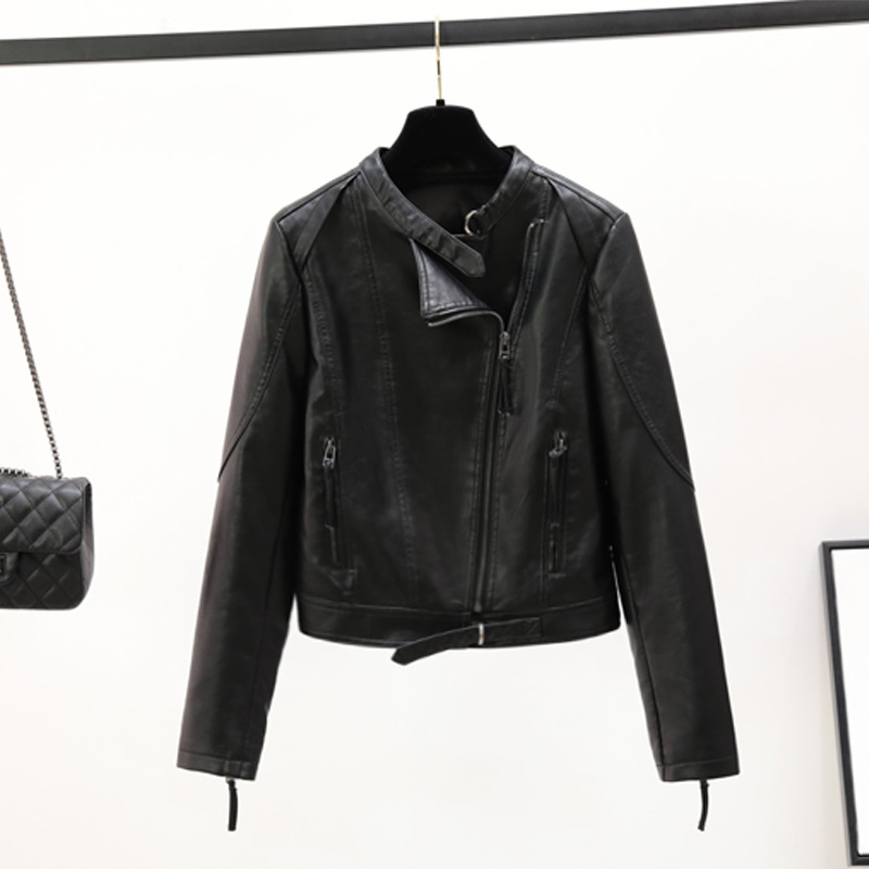 2025 봄과 가을 새로운 도착 바이커 의류 PU 가죽 여성의 간단한 짧은 한국 스타일 슬림-맞는 칼라 가죽 자켓 작은 코트스토어 가기