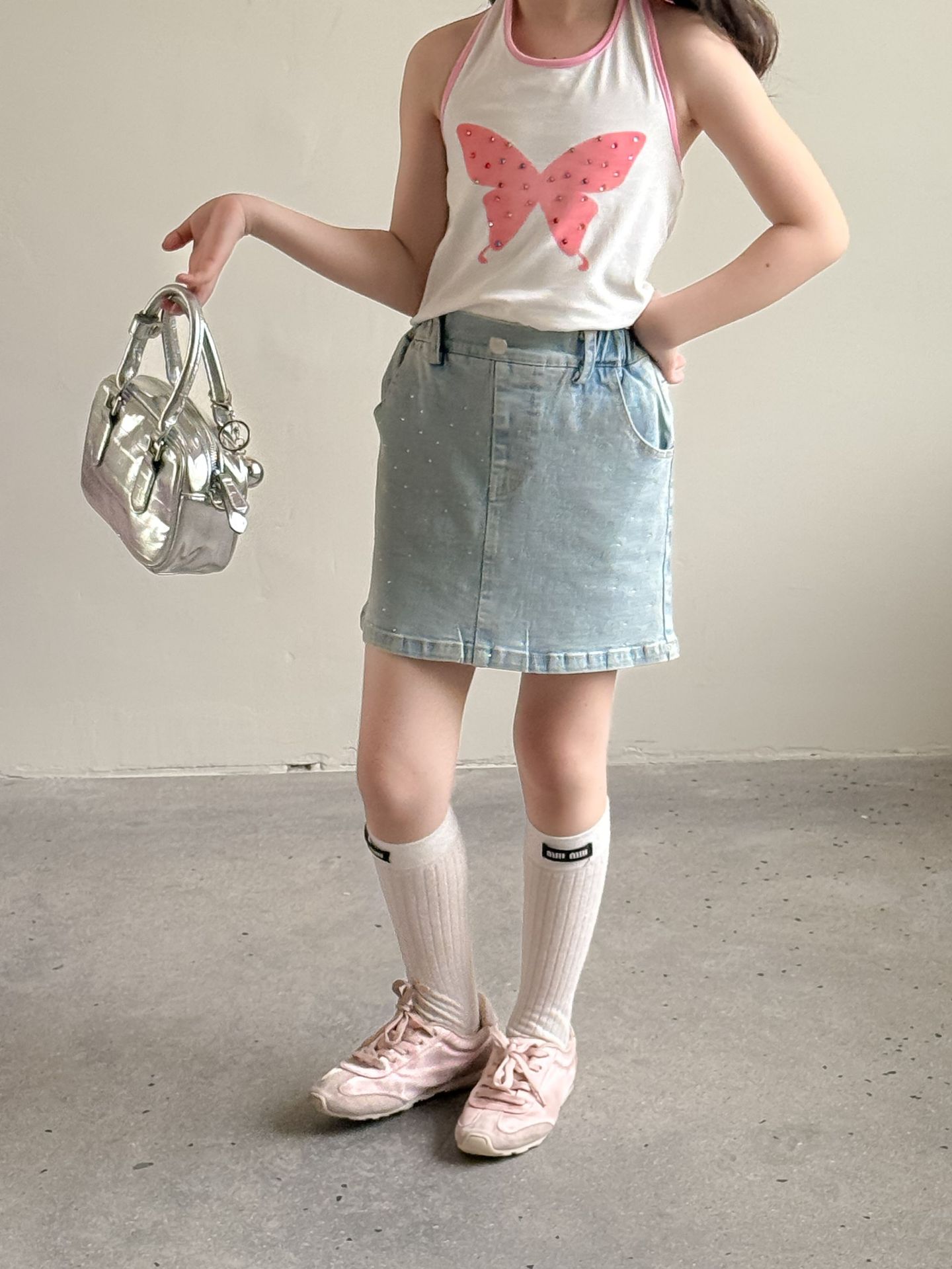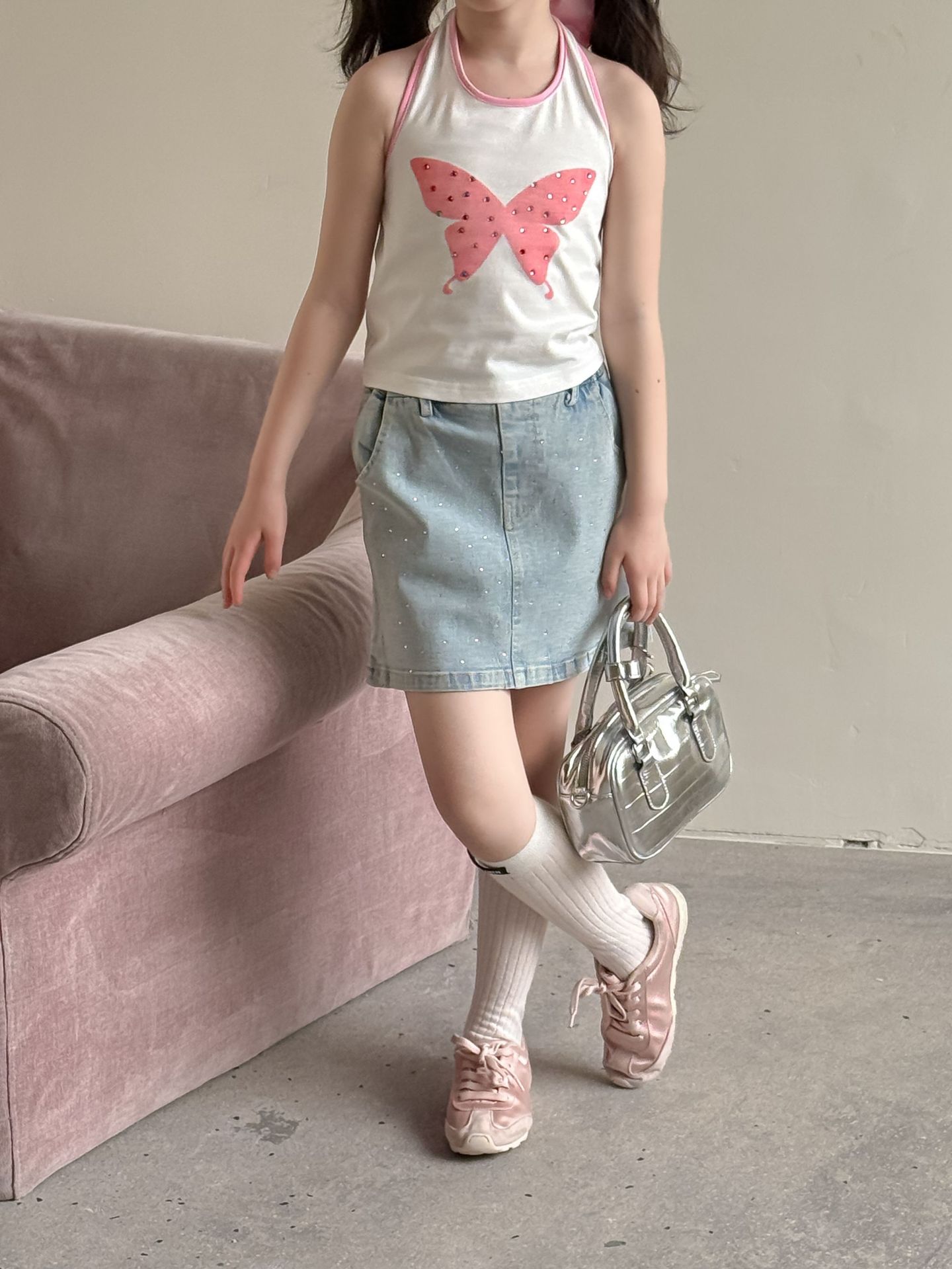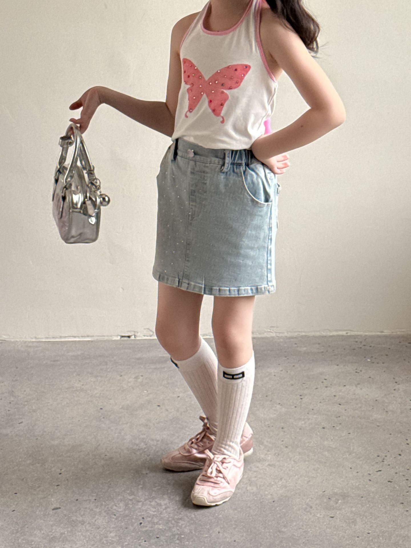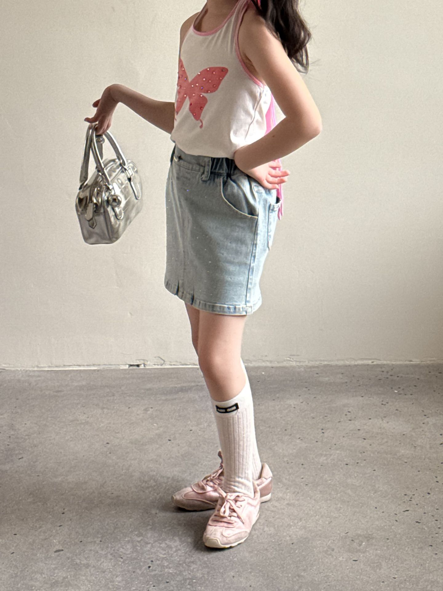 어린이 치마 2025 여름 새 소녀의 다이아몬드가 박힌 패션 블루 데님 스커트 여성 올 매치 바지 스커트 슬림 핏 스커트스토어 가기