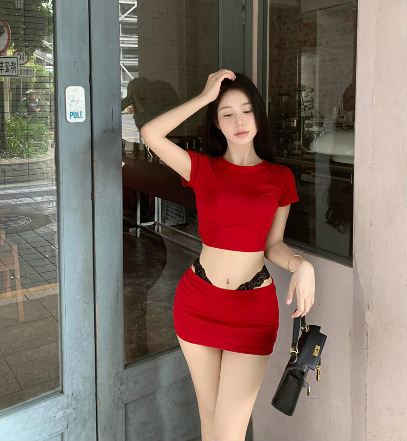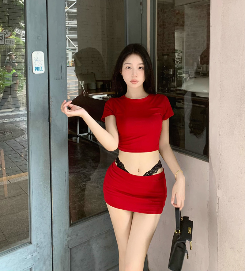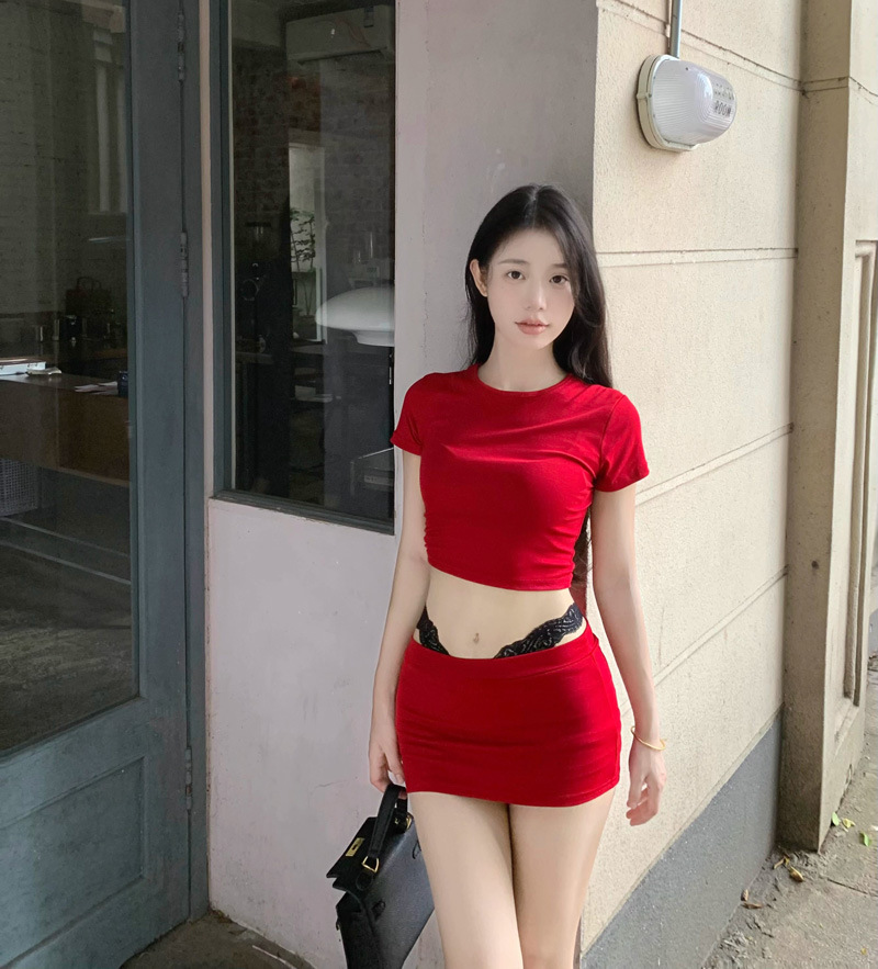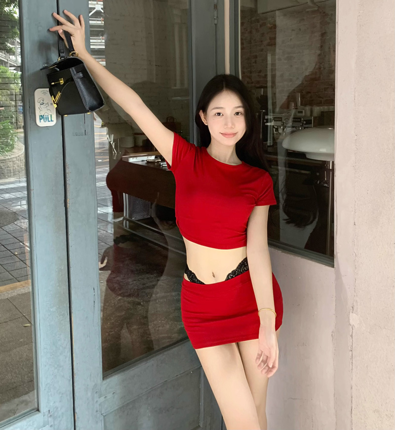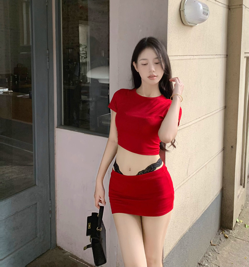 2025 뉴 레드 퓨어 러스 섹시 슬림 티셔츠 탑 여성 여름 핫 소녀 힙 커버 슬리밍 짧은 스커트 투피스 세트스토어 가기