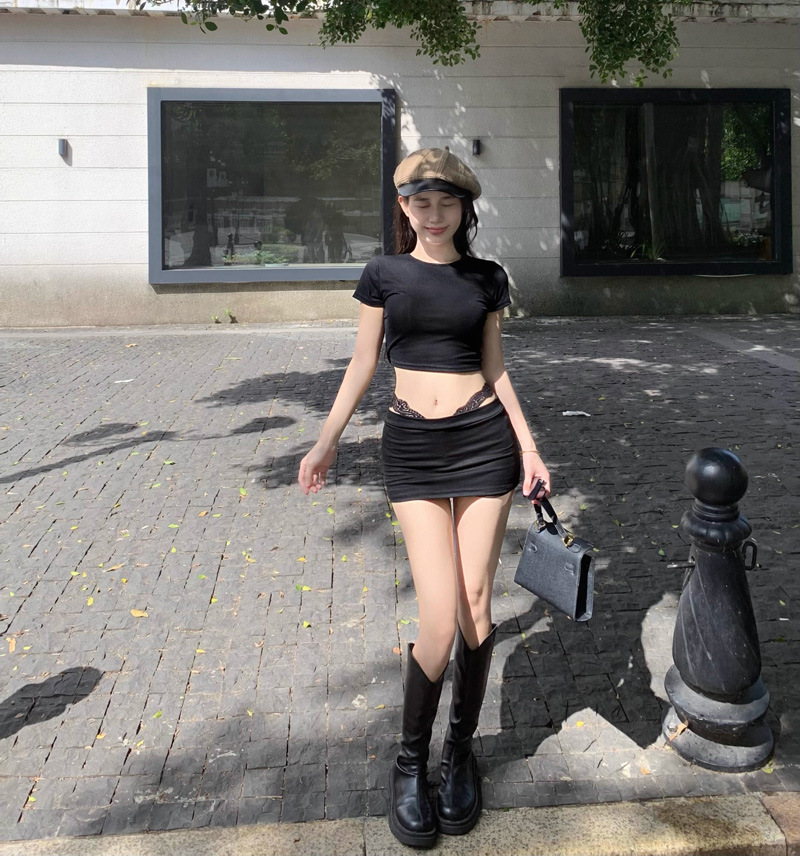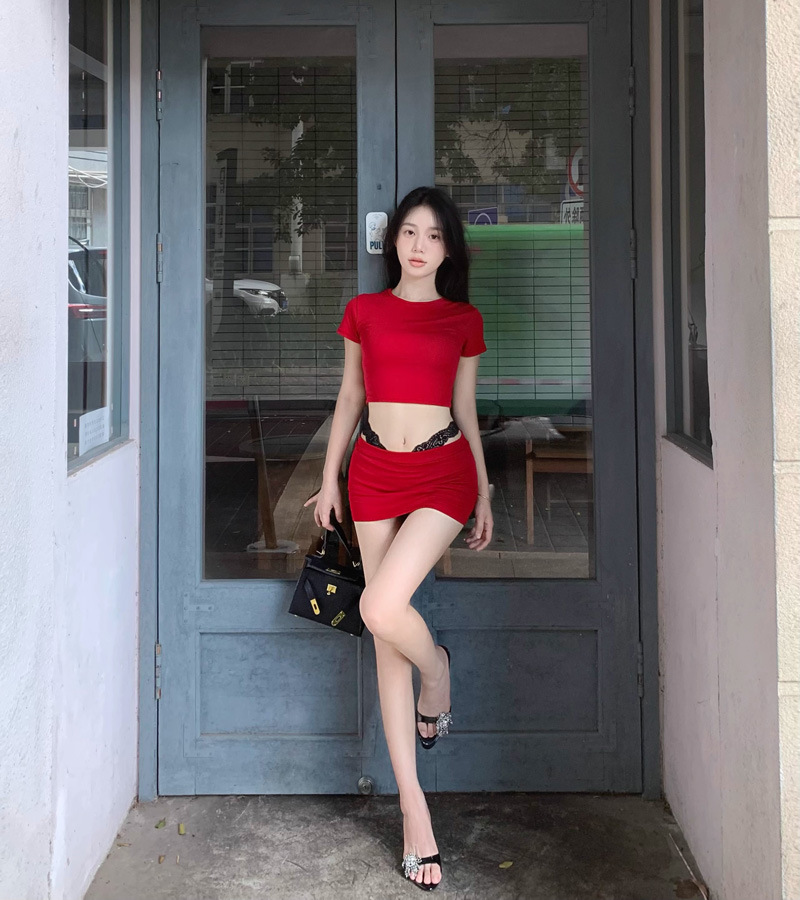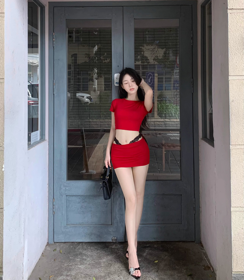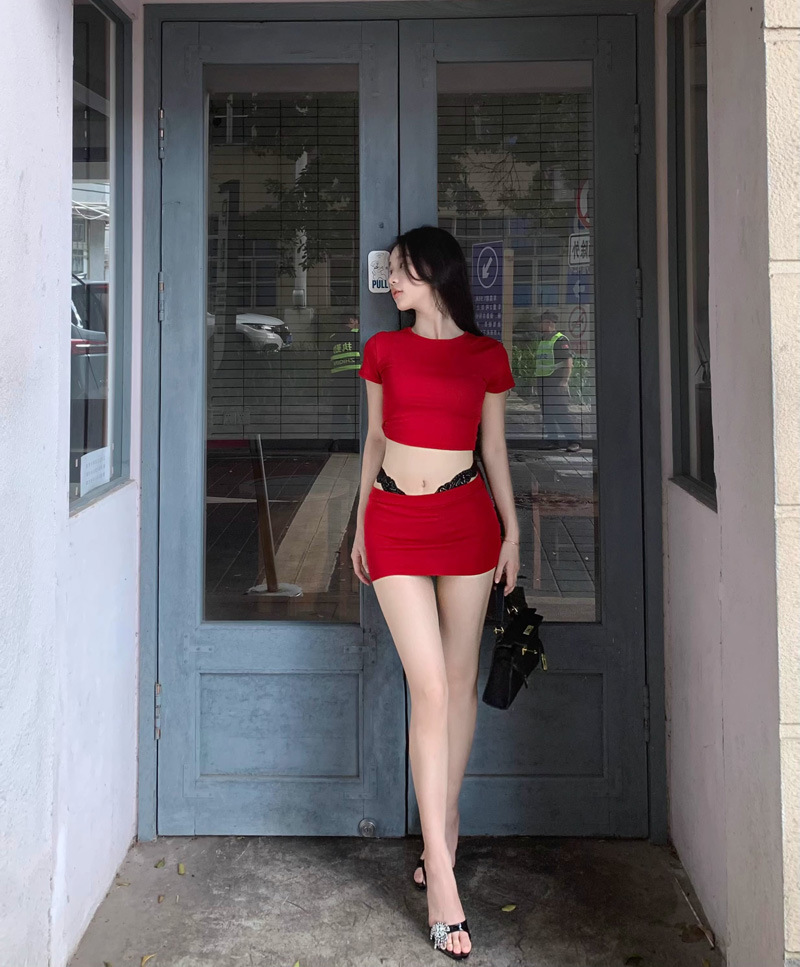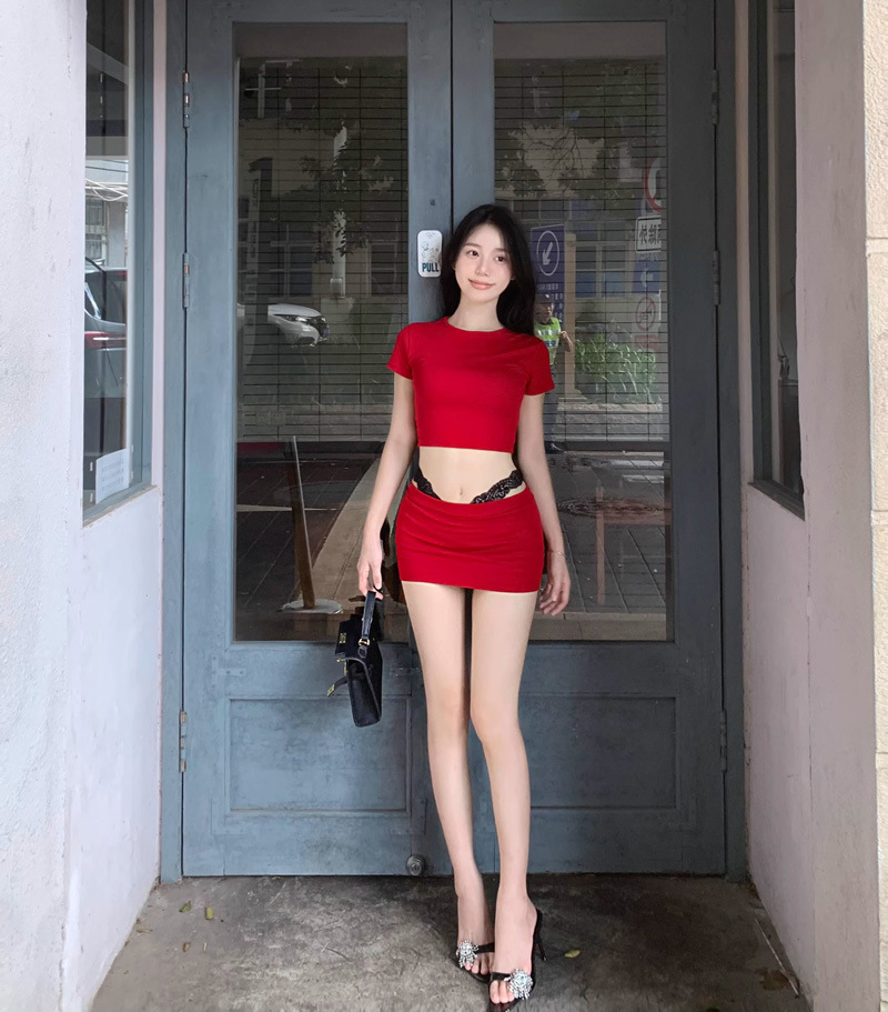 2025 뉴 레드 퓨어 러스 섹시 슬림 티셔츠 탑 여성 여름 핫 소녀 힙 커버 슬리밍 짧은 스커트 투피스 세트스토어 가기