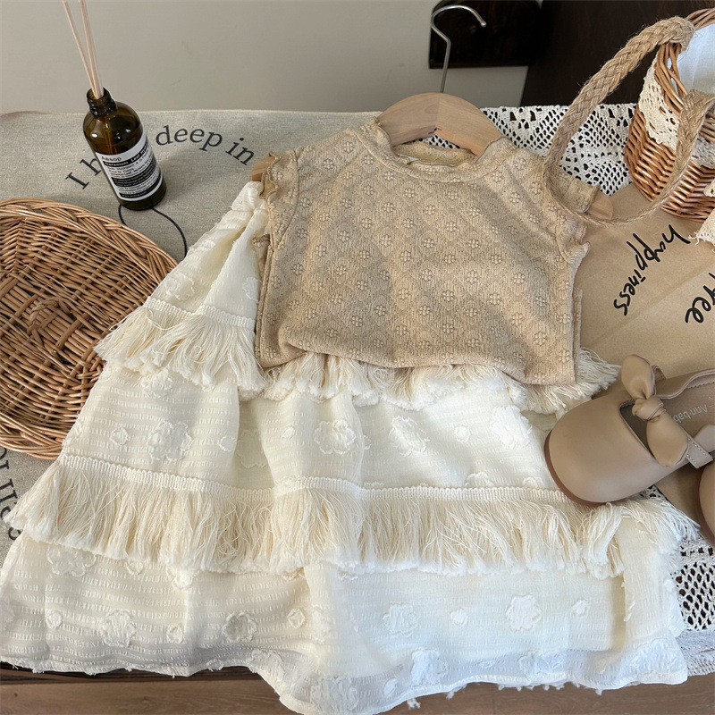 한국 아동복 2024 새로운 여름 소녀 자카드 조끼 어린이 서부 레이스 술 오버 스커트 투피스 패션